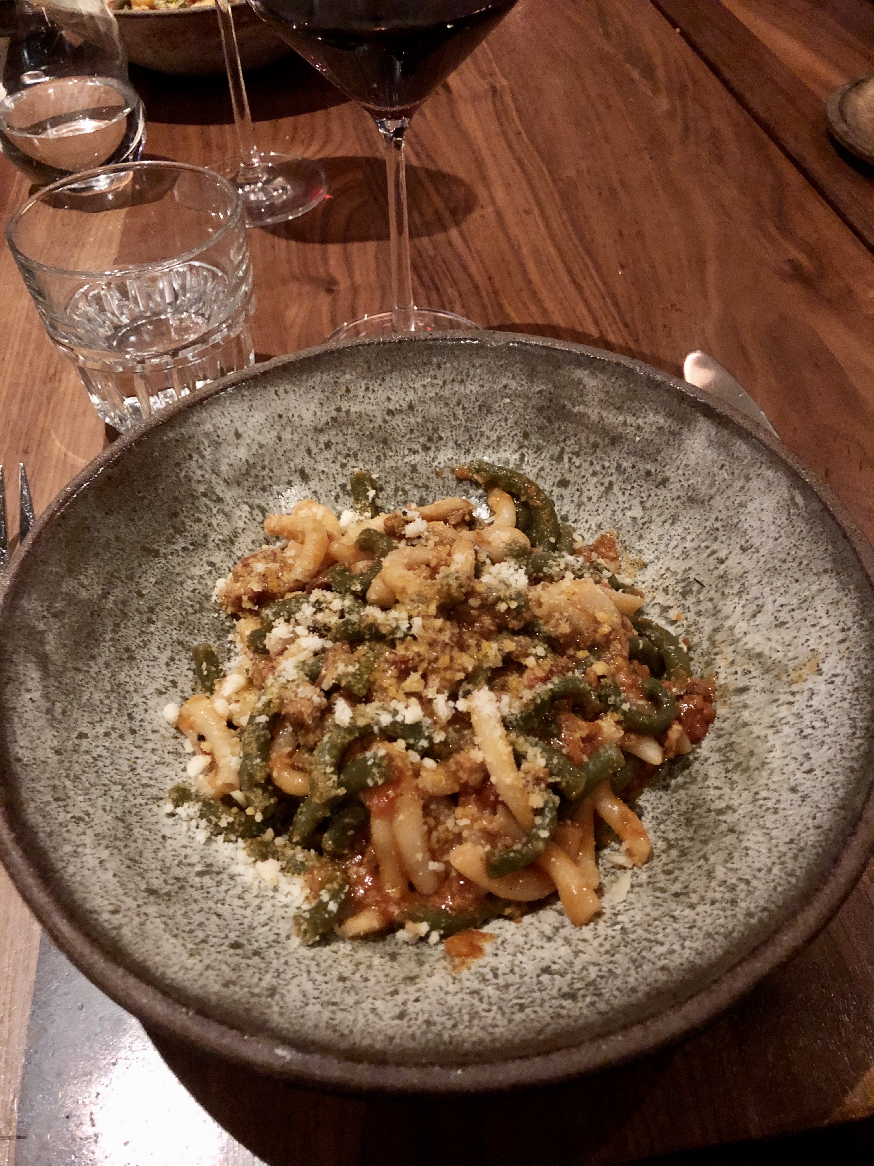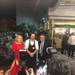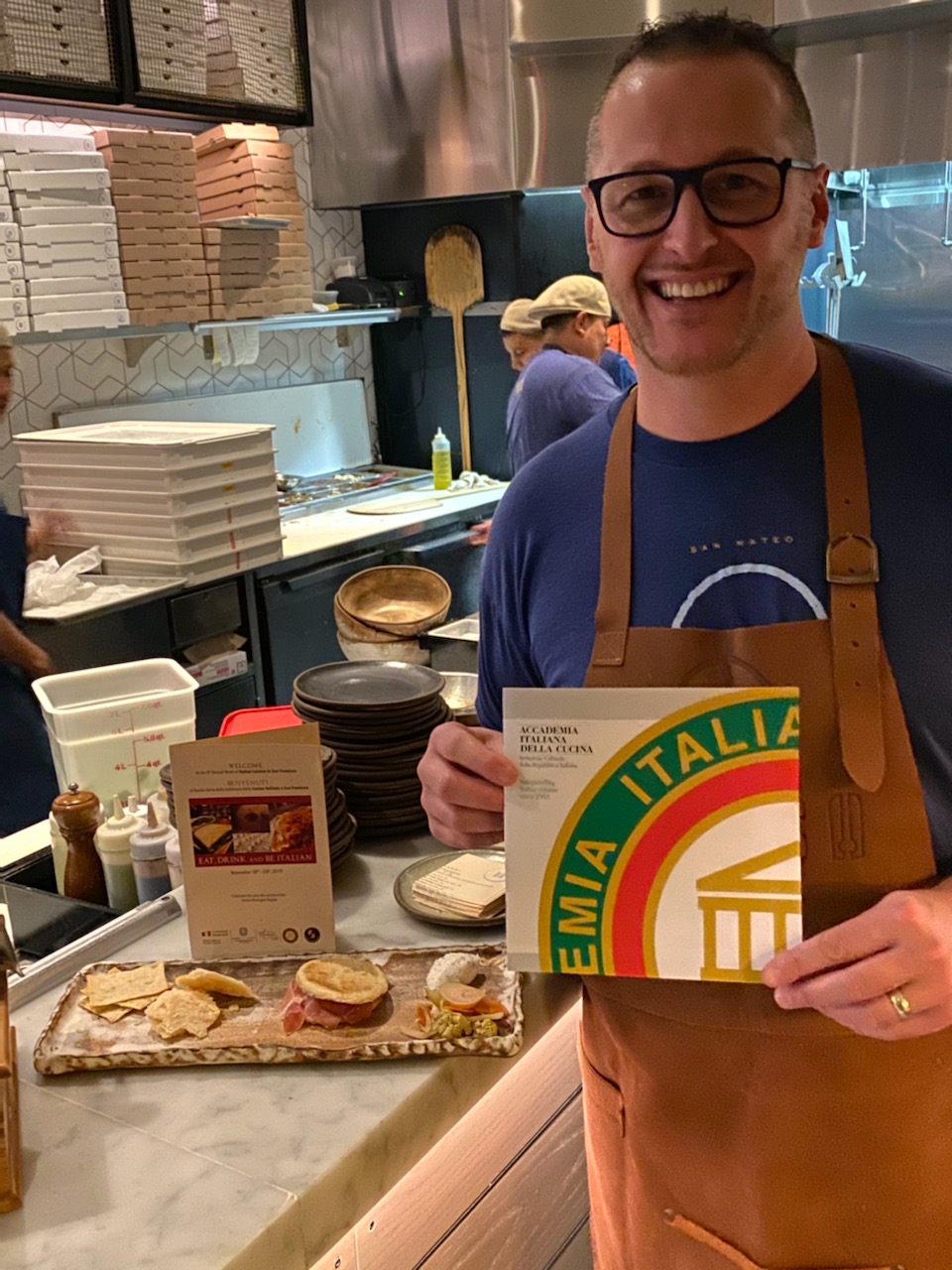 A San Francisco La "IV Settimana" è stata dedicata alla regione Emilia Romagna: 28 ristoranti della Città e Provincia hanno offerto menu con piatti tipici della cucina emiliana e romagnola. Due momenti culturali hanno fatto da cornice: in apertura, al “San Francisco Italian Athletic Club”, il regista Maurizio Gigola (in foto 1 con il Delegato Claudio Tarchi) ha presentato il documentario “Gualtiero Marchesi - Il Grande Italiano”, dopo la visione è seguito un buffet con la partecipazione dei ristoranti Acquerello, Café Baonecci, Italico e Terun. In chiusura un altro documentario, partecipante al “Festival del Cinema Italiano di San Francisco” della regista Enrica Cavalli: “ Food maker - il futuro della nutrizione”. Foto 2. Gruppo di Ristoratori dell’area di San Francisco che hanno partecipato alla "Settimana" nel giardino del Consolato Italiano a San Francisco. Quinto da sinistra, l’Accademico onorario il Console Generale Lorenzo Ortona. Di fronte al forno per le Pizze il Delegato, Claudio Tarchi e l’Accademica e Direttrice dell’ Istituto Italiano di Cultura Annamaria Di Giorgio. Foto 2. Il cuoco e proprietario del ristorante “Pausa” di San Mateo, Andrea Giuliani, con un piatto di tigelle al prosciutto di Parma e il Parmigiano Reggiano “Vacche Brune” 36 mesi. Foto 4. La gramigna paglia e fieno con ragù di maiale del ristorante "Pausa".