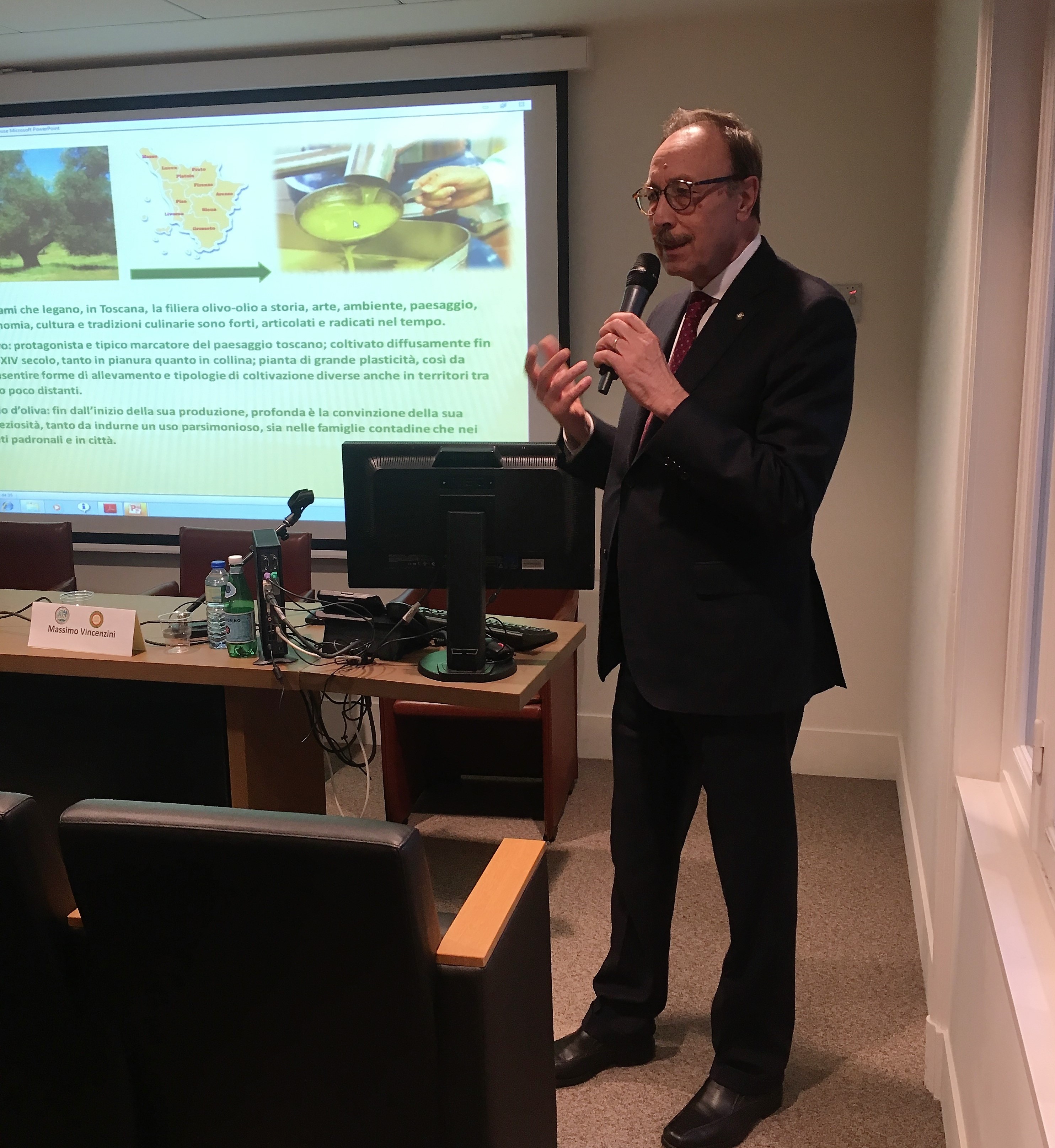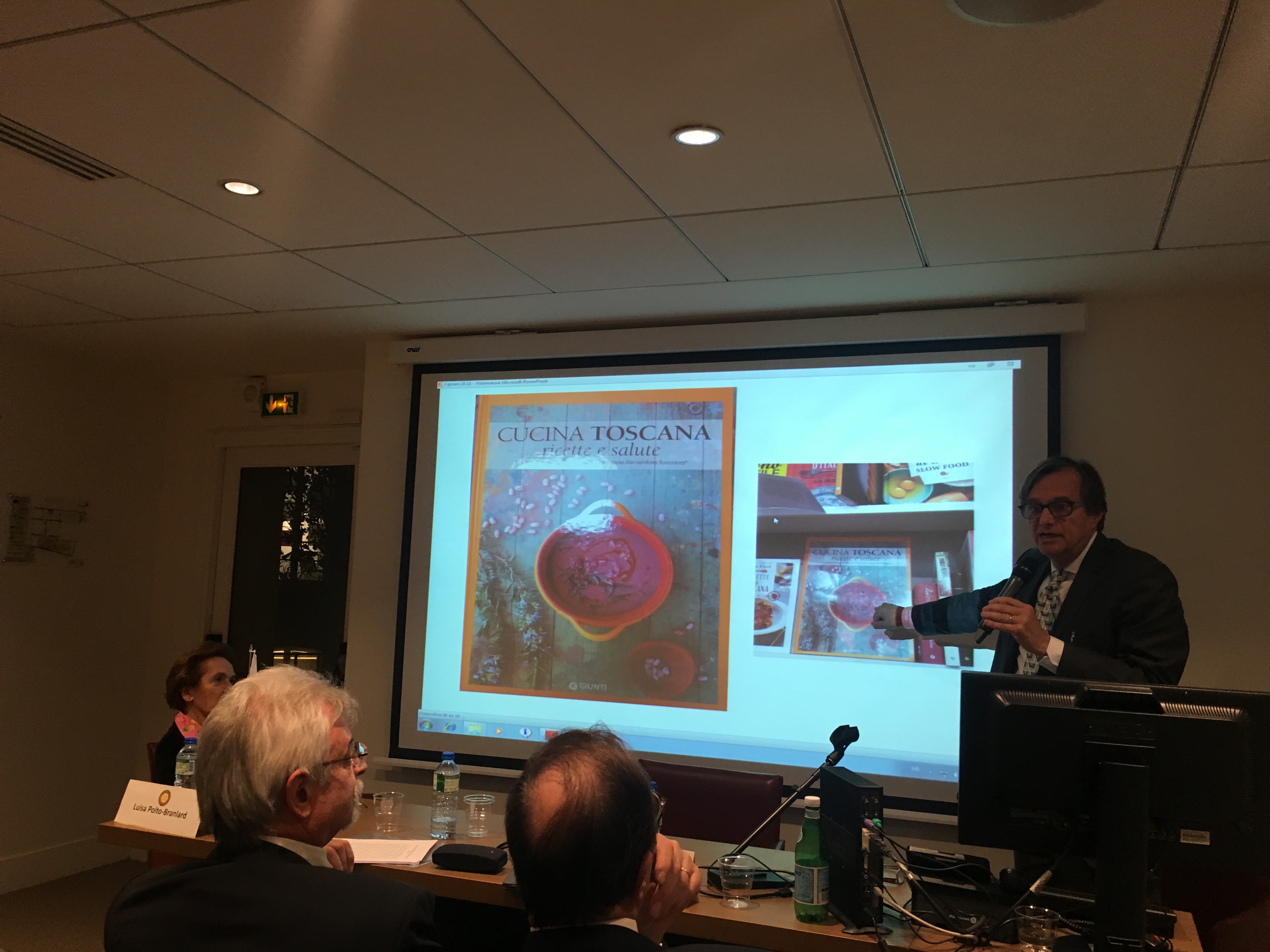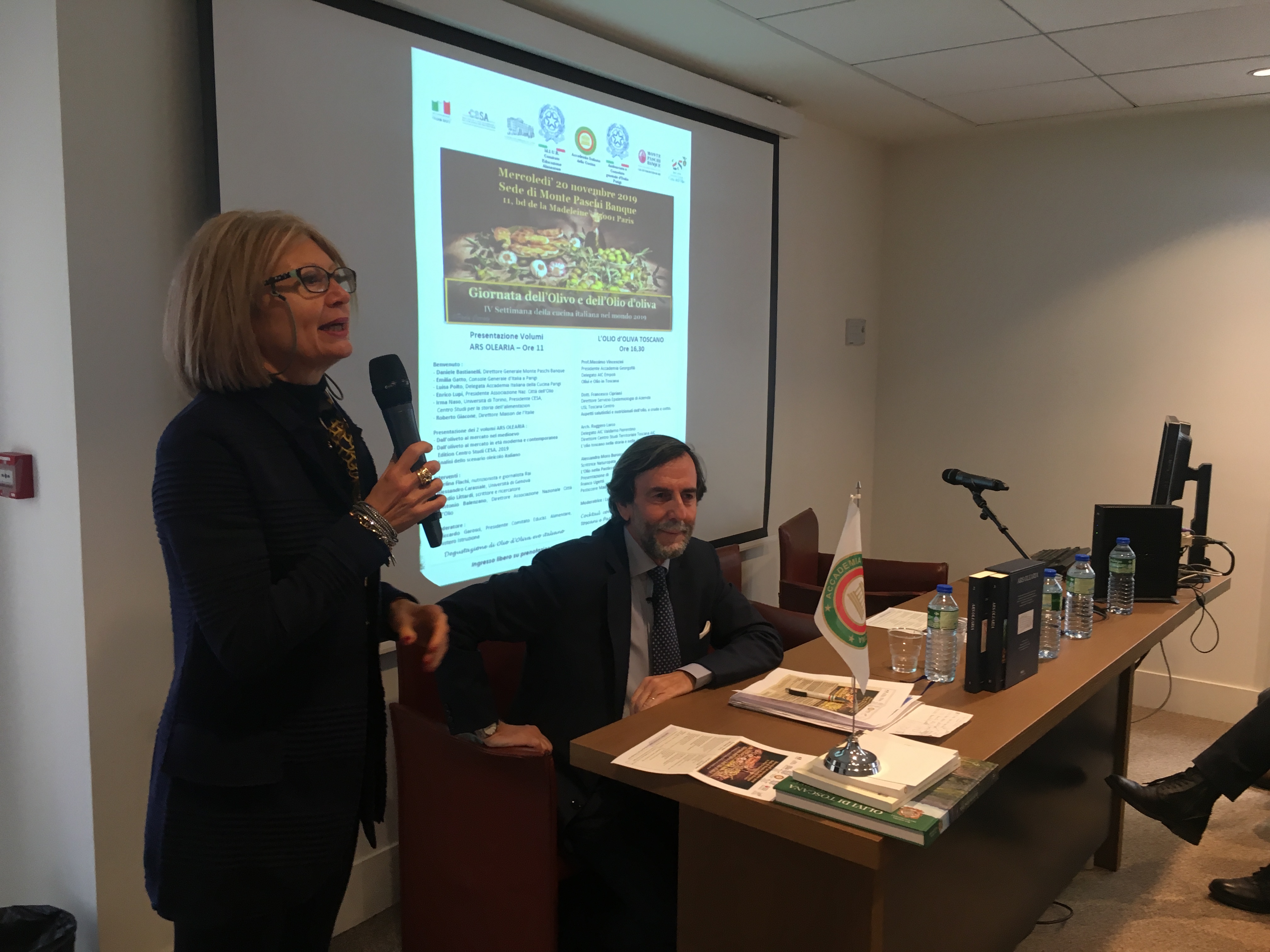 Nell'ambito della "IV Settimana" la Delegazione di Parigi, in accordo con il Consolato Generale d'Italia, ha organizzato il giorno 20 novembre un seminario sull'Olio toscano presso la sede parigina di Monte Paschi Banque in collaborazione con il Comitato MIUR per l’Educazione Alimentare e la Maison de l'Italie di Parigi. Tra i qualificati relatori, Massimo Vincenzini Presidente dell'Accademia dei Georgofili e Delegato di Empoli (foto 3), Ruggero Larco DCST Toscana e Delegato del Valdarno Fiorentino, dott. Franco Cipriani dell’Agenzia Regionale della Sanità Toscana (foto 4). Durante l'interessante convegno sono stati illustrati la tradizione dell’olivo in Toscana, le sue varietà, i problemi attuali legati alla sua coltivazione e sono state presentate le prove scientifiche a sostegno del ruolo protettivo dell’olio d’oliva per le malattie cardiovascolari e i tumori. Il Delegato Larco ha tracciato la storia della coltivazione dell’olio in Toscana ed evidenziato come coltivazione e uso in cucina si siano intensificati dal 1850 in poi. Presentate anche le grandi ricette toscane nelle quali l’olio evo è imperativo. Foto 1 (da sinistra): la Console Generale Emilia Gatto, il Direttore della Maison de l’Italie a Parigi dott. Roberto Giacon, la Delegata di Parigi Luisa Branlard Polto. In senconda fila, da destra: i Delegati Ruggero Larco e Massimo Vincenzini. Foto 2. La Console Generale Emilia Gatto.