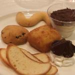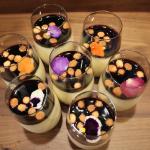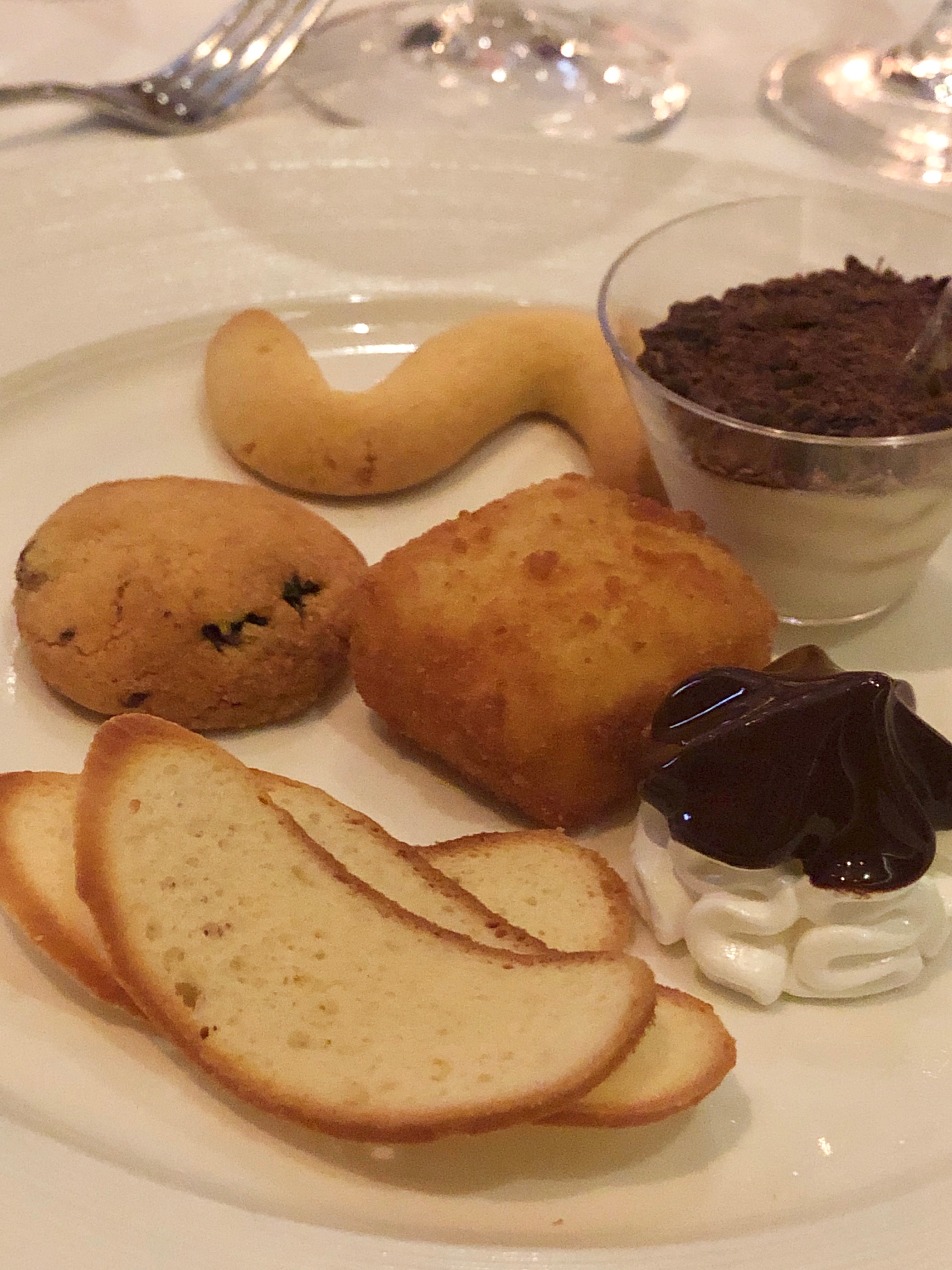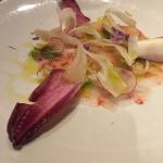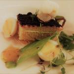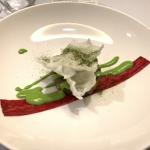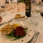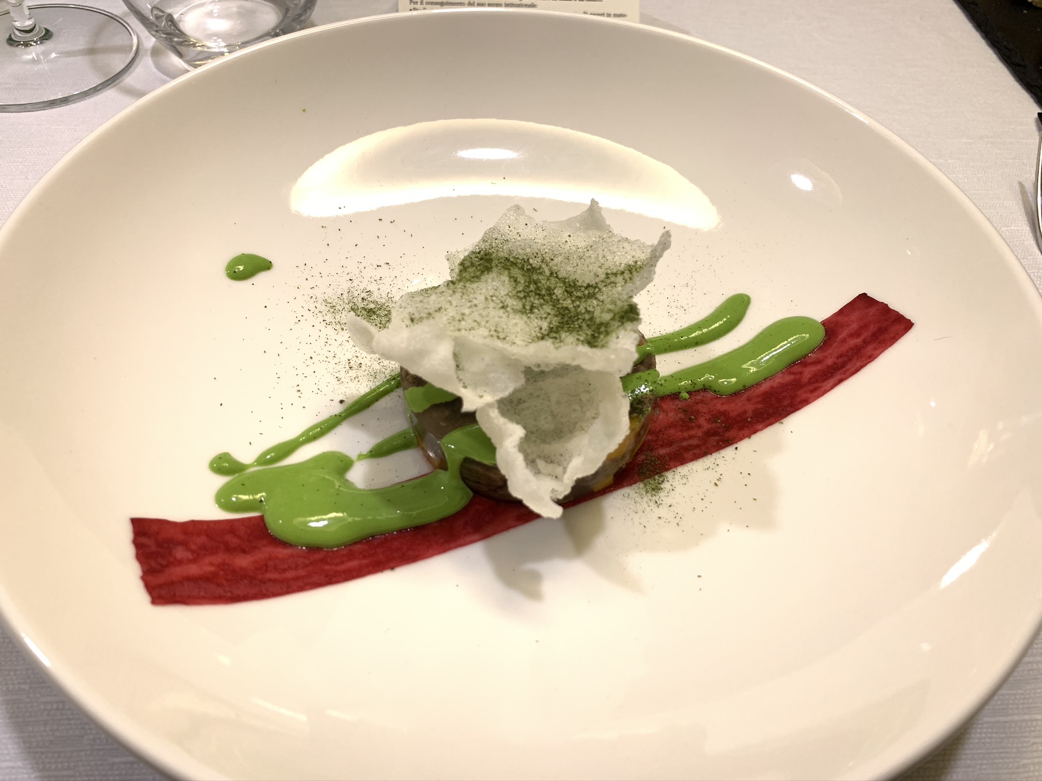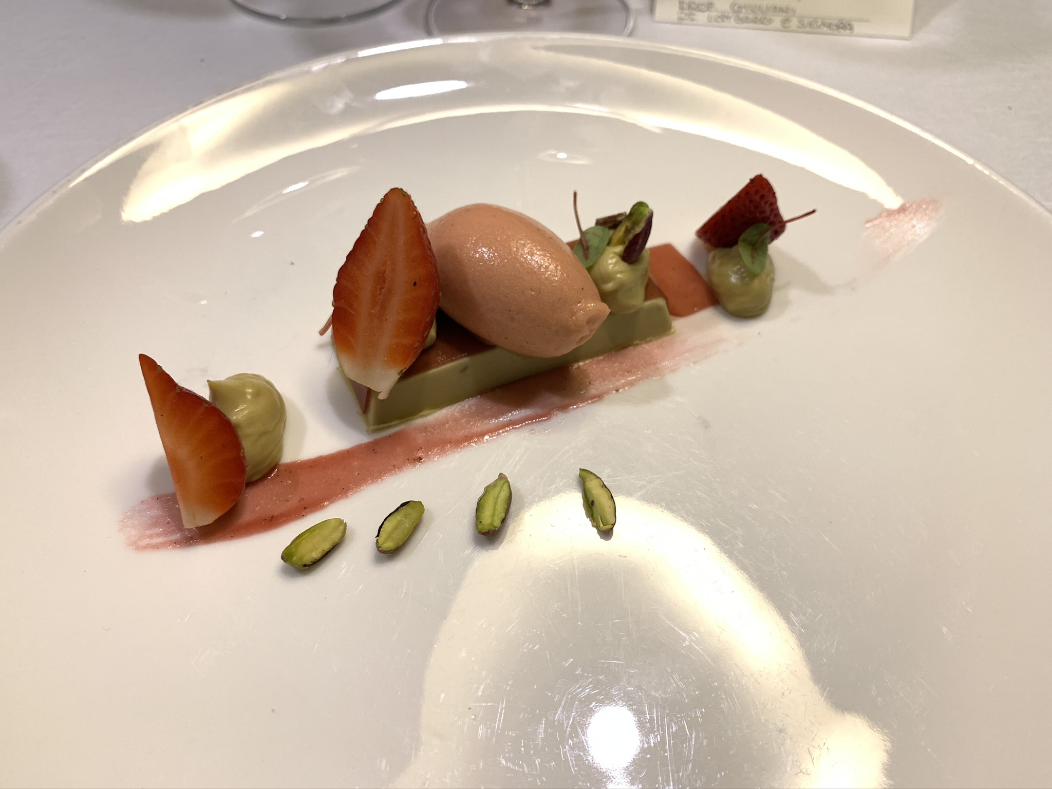La Delegazione di Genova nel mese di novembre ha visitato l'Hostaria Ducale, ristorante di recente apertura dall’ambiente raffinato e raccolto. Dopo la presentazione del nuovo Accademico Lorenzo Ball (foto 1), si è dato il via alla cena con un menu basato sulla tradizione ma contraddistinto da punte di innovazione. Foto 2. Accademici, ospiti e lo chef Antonio Cuomo. Foto 3. Terrina calda di bollito di manzo, chips croccante di riso, gel di salsa verde e daikon in osmosi. Foto 4. Mousse al pistacchio di Bronte, fragole e zenzero.
