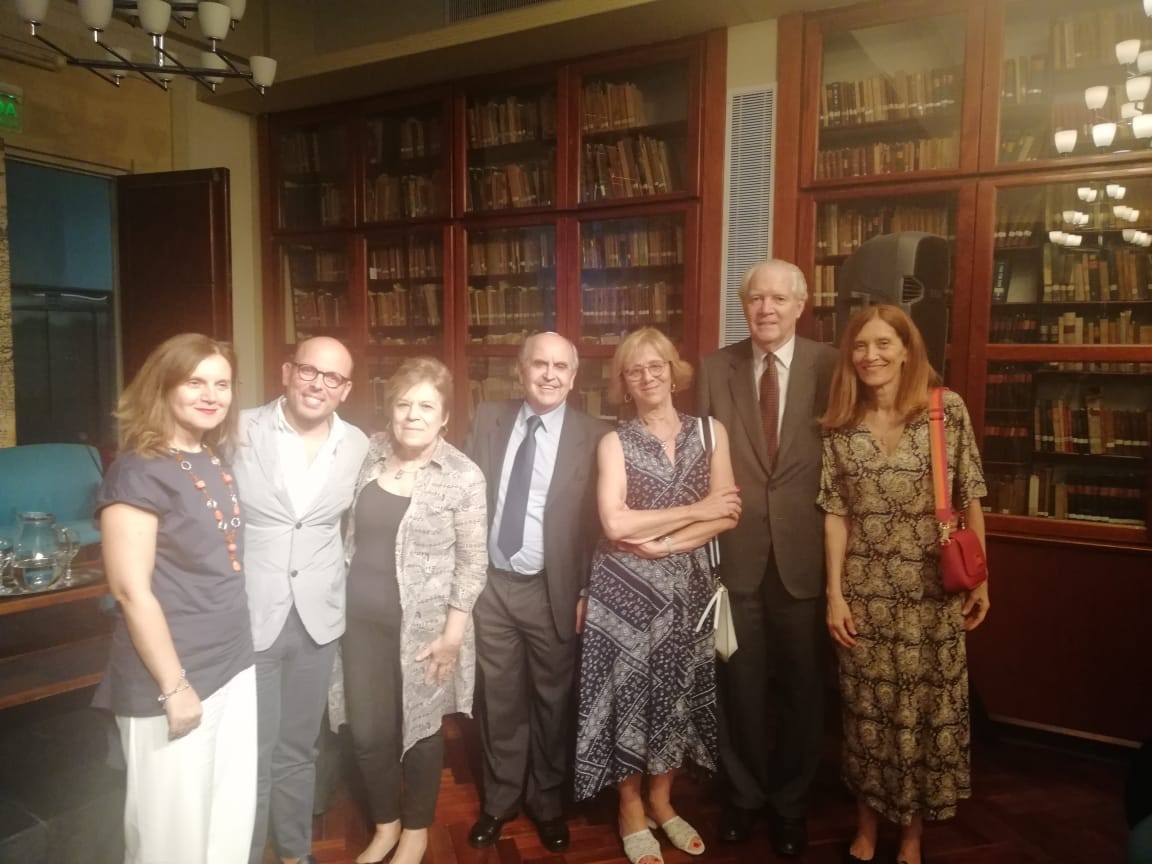Per la IV Settimana, il 19 novembre a Buenos Aires è stato organizzato dall’Istituto Italiano di Cultura un incontro aperto al pubblico con la collaborazione della Delegazione di Buenos Aires. All'evento, che ha riscosso un notevole successo, era presente tra gli spettatori il giornalista rappresentante dell’ANSA Maurizio Salvi, che ha voluto partecipare al dibattito finale dell’evento. La relatrice Daniela Di Segni (ex Accademica di Buenos Aires) è riuscita a trasmettere pienamente le sue conoscenze della linguistica gastronomica con precisione e con uno spiccato senso dell’umorismo, raccontando aneddoti divertenti sul modo in cui vengono scritti i menù italo-argentini: in lingua “itañol”. La giornata si è conclusa con l'intervento dello chef Giuseppe Costa che ha deliziato Accademici e invitati con i suoi tanto attesi racconti, pieni di raffinatezza e passione, riguardanti le sue creative e innovative ricette culinarie, seguito da un buffet per gli invitati. In foto, da sinistra: Donatella Cannova (Direttrice dell'Istituto italiano di cultura), lo Chef Giuseppe Costa, la Vice Delegata Lucia Capozzo, il Vice Delegato Jorge Muñoz, l'oratrice Daniela Di Segni; il Delegato Alberto V. Lisdero, la Dott.ssa Vera Milovic (Primario del reparto del Trapianto di Midollo dell'Ospedale Tedesco di Buenos Aires).
