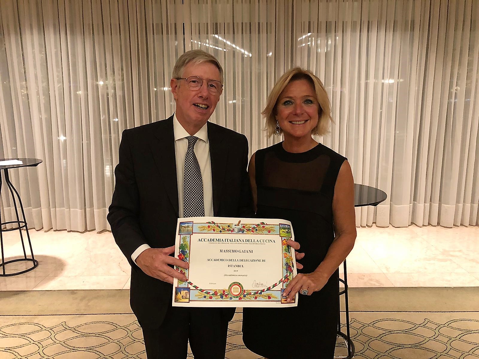 La Delegazione di Istanbul si è riunita lo scorso 22 novembre per l’ultima cena dell’anno presso il Four Seasons Hotel at the Bosphorus (foto 1). Per l’occasione, la Delegata Dilek Bil ha invitato dall’Italia Tommaso Sanguedolce, executive chef del ristorante "Il Tempo Nuovo" presso il Castello di Ugento e insegnante presso il Puglia Culinary Center che ha preparato un menu d’eccezione per gli Accademici istabulioti. Durante la cena, la Delegata ha investito S.E. l’Ambasciatore Massimo Gaini del titolo di Accademico onorario (foto 2) conferito dal Presidente dell'Accademia Paolo Petroni. La cena si inserisce tra gli eventi organizzati a Istanbul in occasione della "IV Settimana" che rappresentano la seconda fase di un progetto di collaborazione tra la Delegazione guidata da Dilek Bil e l'Ambasciata Italiana in Turchia nella persona di S.E. Massimo Gaiani, con l'obiettivo di promuovere lo scambio gastronomico, culturale ed economico tra Italia e Turchia per incentivare e rafforzare i rapporti bilaterali tra i due Paesi. Oltre alla cena del 22 novembre, lo chef Sanguedolce è stato protagonista di una giornata presso la MSA (Accademia di arti culinarie) (foto 3) il 20 novembre dando lezione di pasta fresca e risotto a circa 170 studenti. Le attività della Settimana sono state inoltre presentate in una conferenza stampa il 21 novembre in presenza di giornalisti locali presso il Palazzo di Venezia (foto 4).