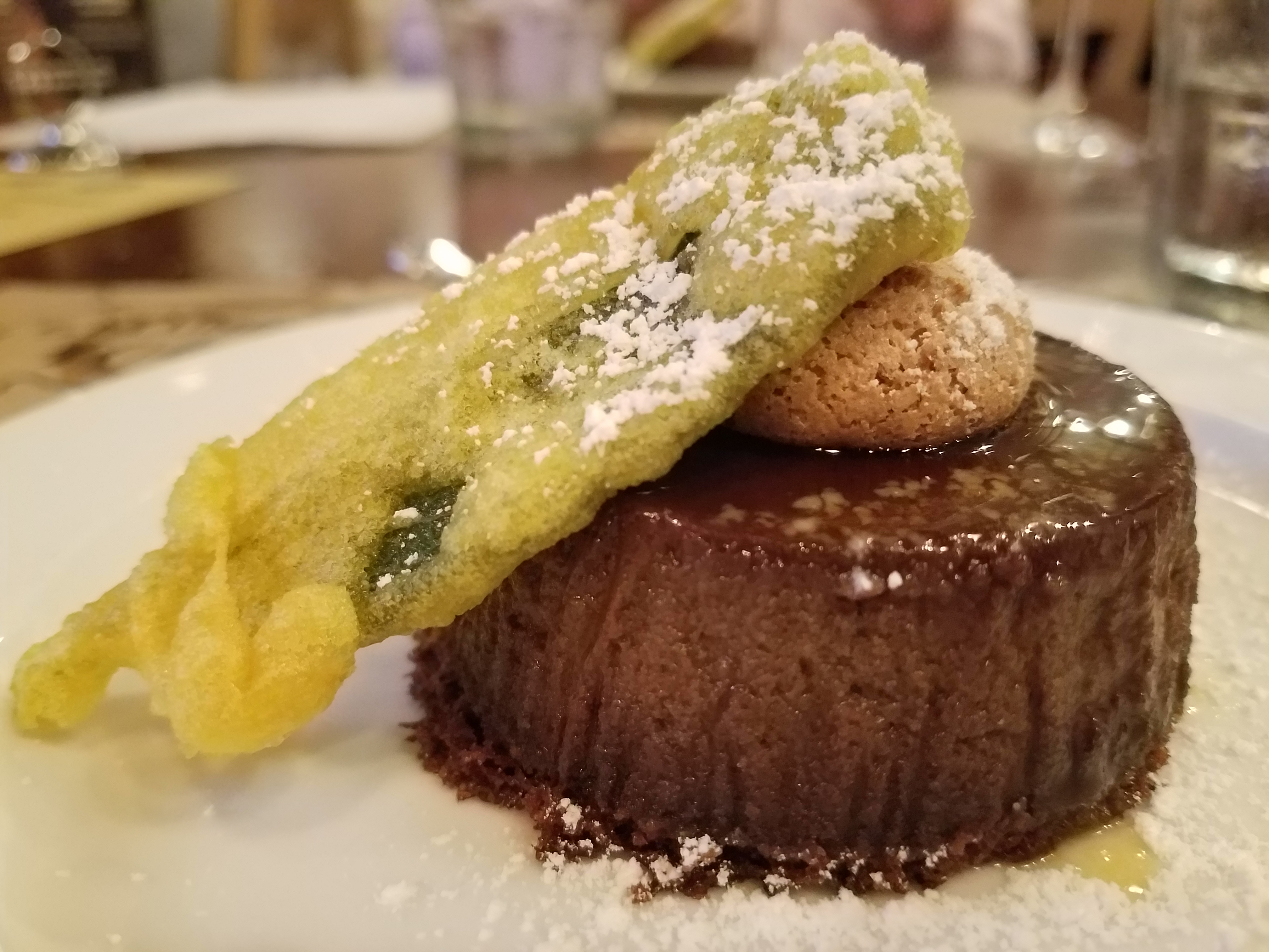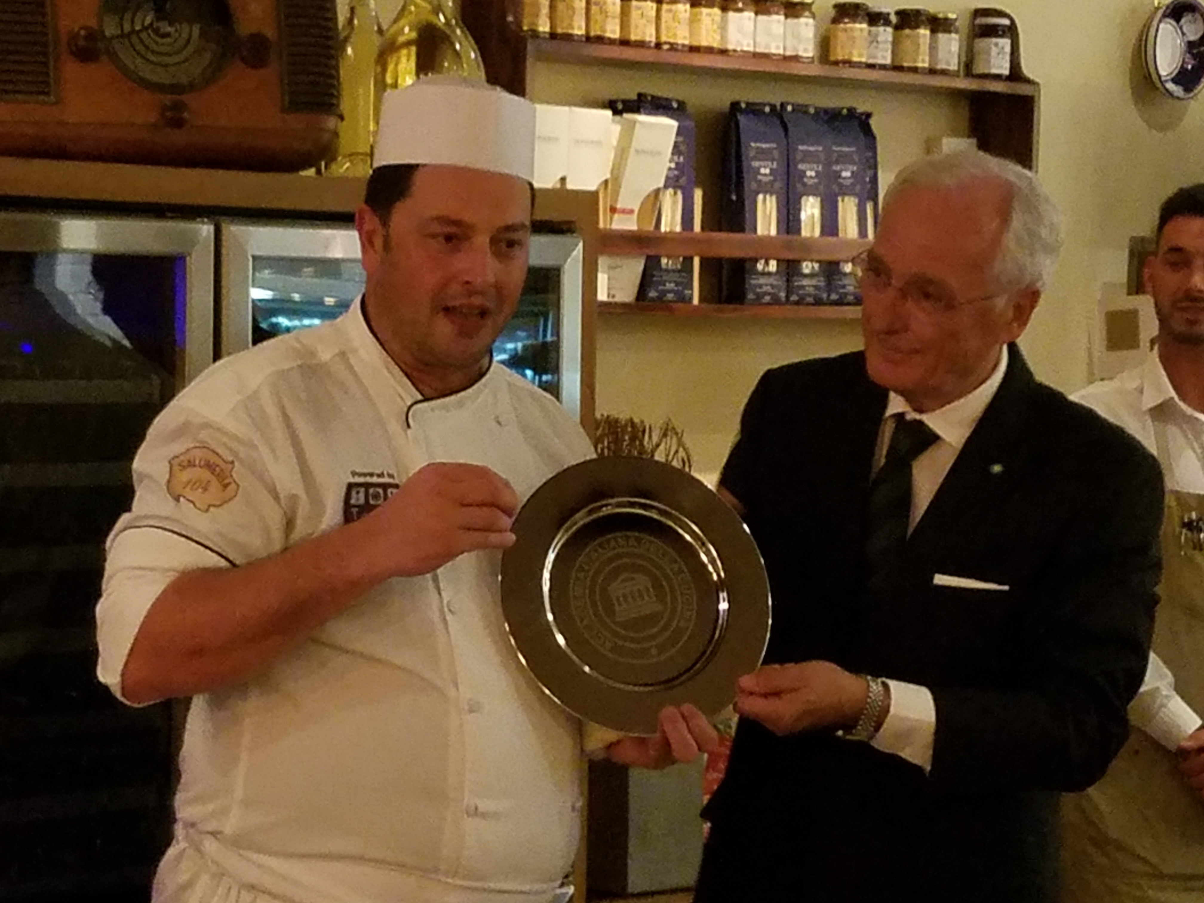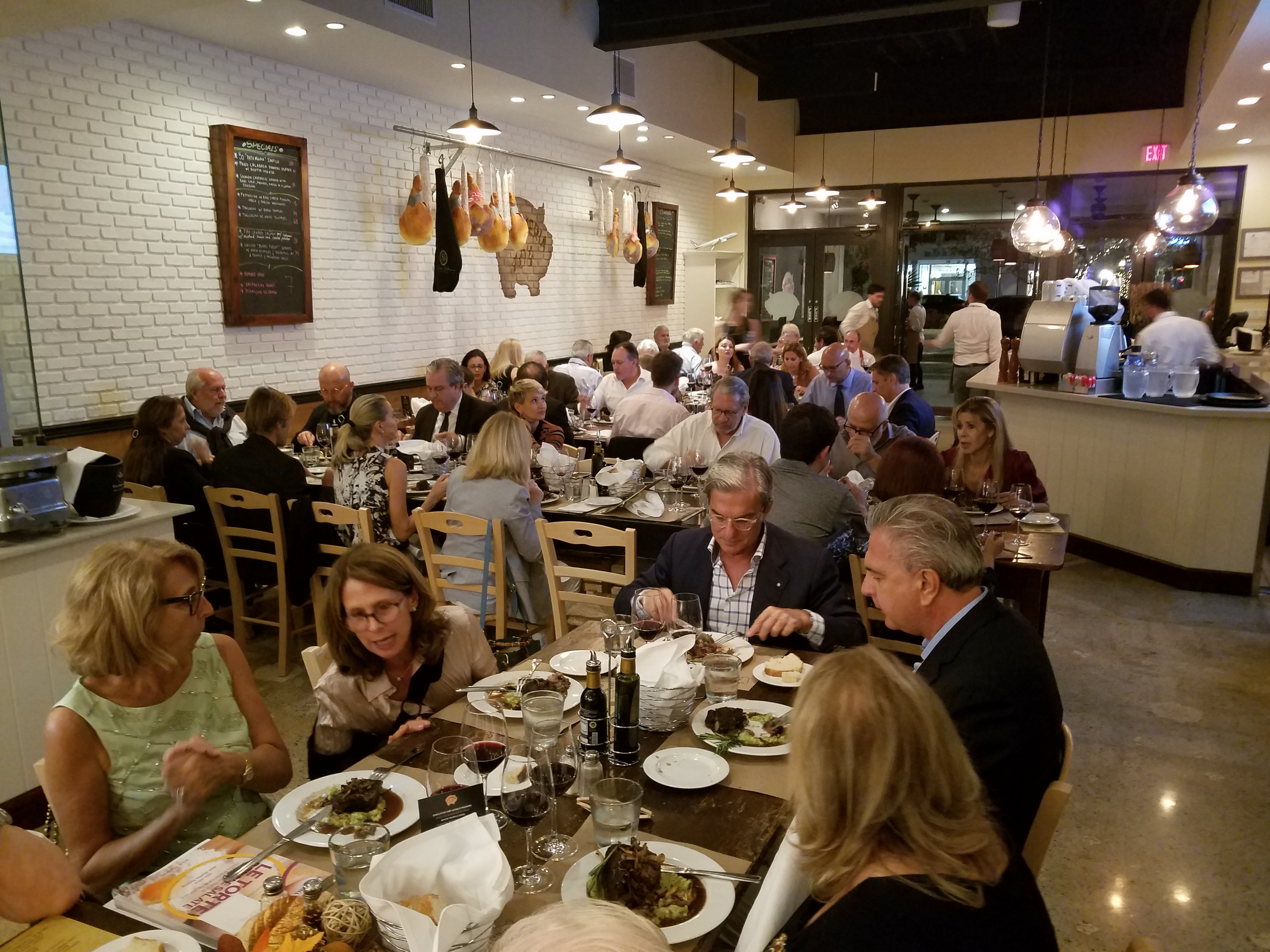 La Delegazione di Miami si è riunita, in occasione della riunione conviviale, presso il ristorante "Salumeria104" a Coral Gables. Foto 1: il Delegato Antonio Pianta consegna il piatto dell'Accademia allo chef Angelo Masarin. Foto 2: un momento della serata con gli ospiti a tavola. Foto 3: risotto al castelmagno e funghi porcini. Foto 4: bonet alla piemontese con briciole di amaretto, salsa al caramello e salvia fritta.