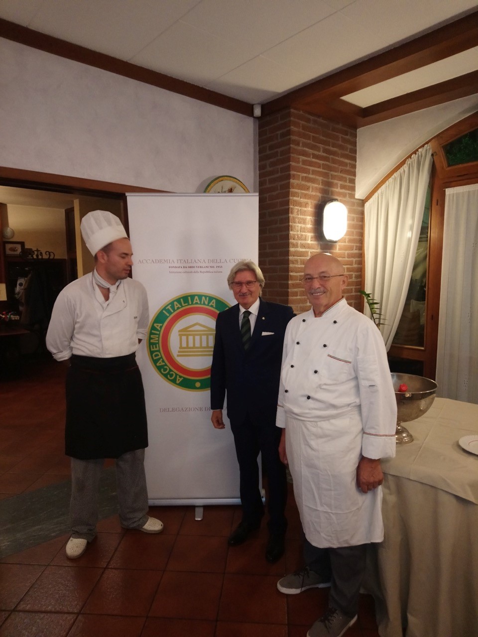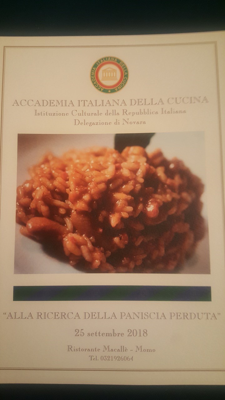 La Delegazione di Novara si è riunita presso il ristorante Macallè di Momo in occasione della riunione conviviale per assaggiare il piatto tipico del territorio novarese: la Paniscia (risotto con verdure, lardo, fagioli e salame della duja). Foto 1: il Delegato Piero Spaini con i due cuochi. Foto 2: il dessert: aspic di frutti di bosco in gelatina di moscato . Foto 3: il menu della serata.