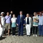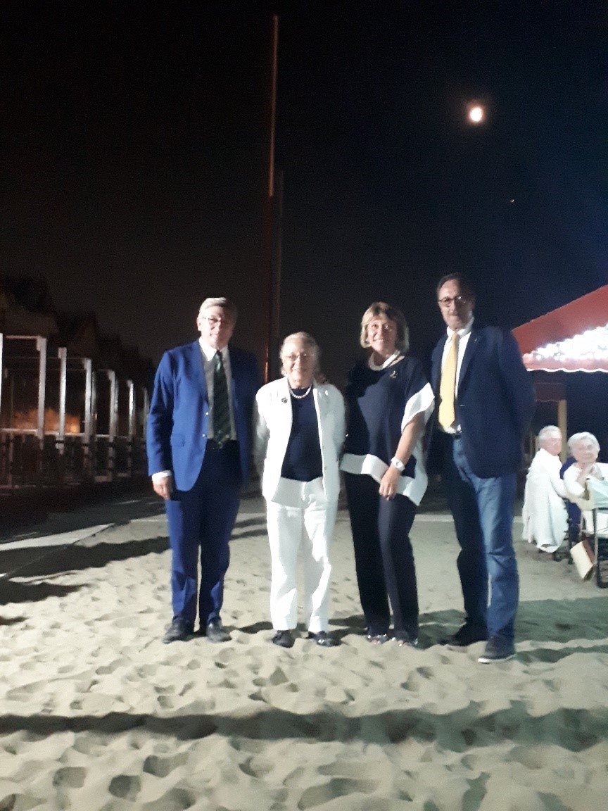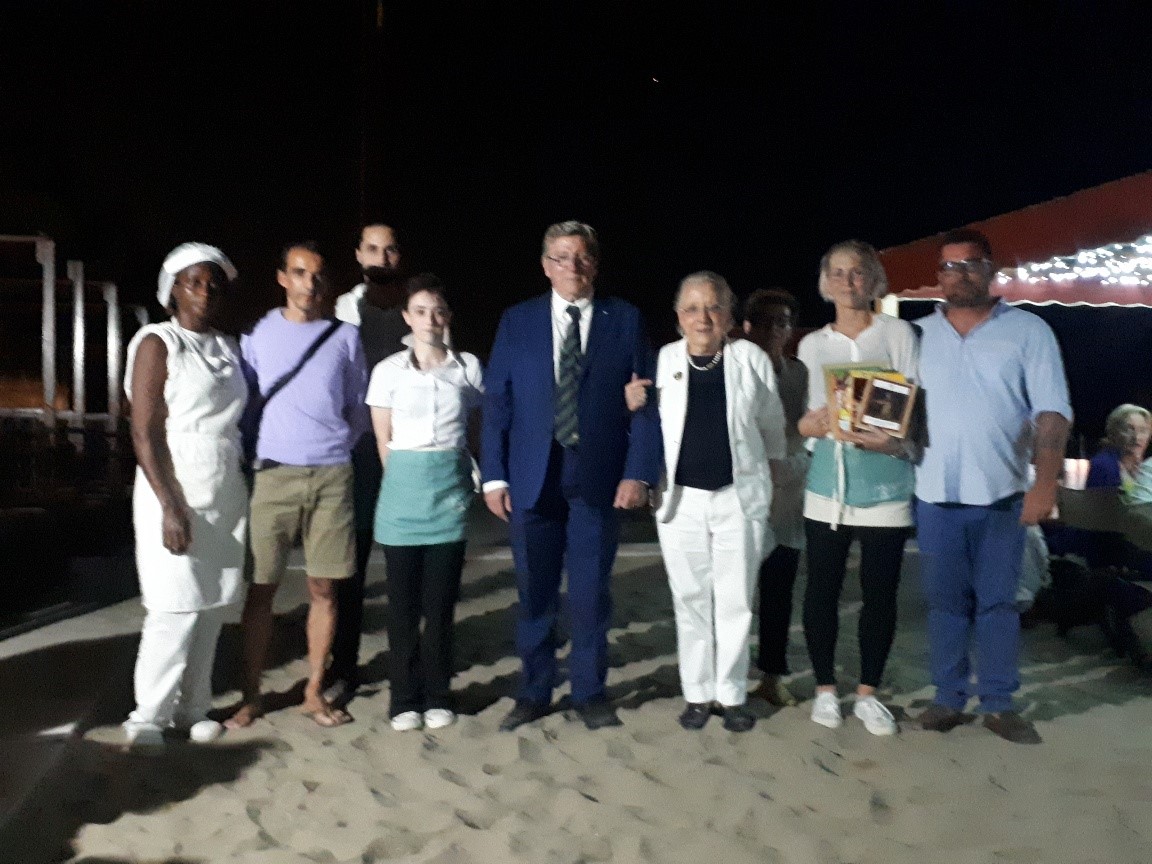 La Delegazione della Versilia Storica si è riunita presso il ristorante "Bagno Apuana" a Forte dei Marmi in occasione della riunione conviviale. Foto 1: la Delegata Anna Ricci Pinucci saluta l'ospite Emilio Petrini Mansi Marchese, Presidente del Lions Club. Foto 2: la Delegata in compagnia di Monica Sforzini (Delegata del Mugello), Massimo Vincenzini (Delegato di Empoli) e il Vice Delegato della Versilia Storica Roberto Bertola. Foto 3: la Delegata, il Vice Delegato e la brigata di cucina a cui sono stati consegnati volumi e riviste dell'Accademia come ringraziamento per una bella serata all'insegna di buona cucina e convivialità. Foto 4: la lunga tavola in riva al mare in una notte magica di eclissi di luna. Foto 5: savarin di riso venere con scampi.