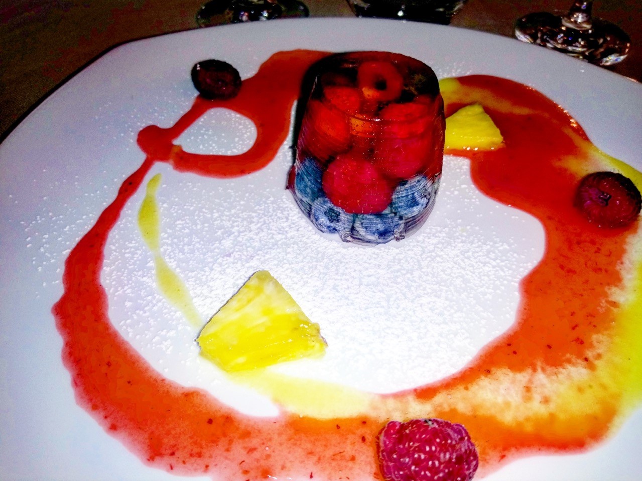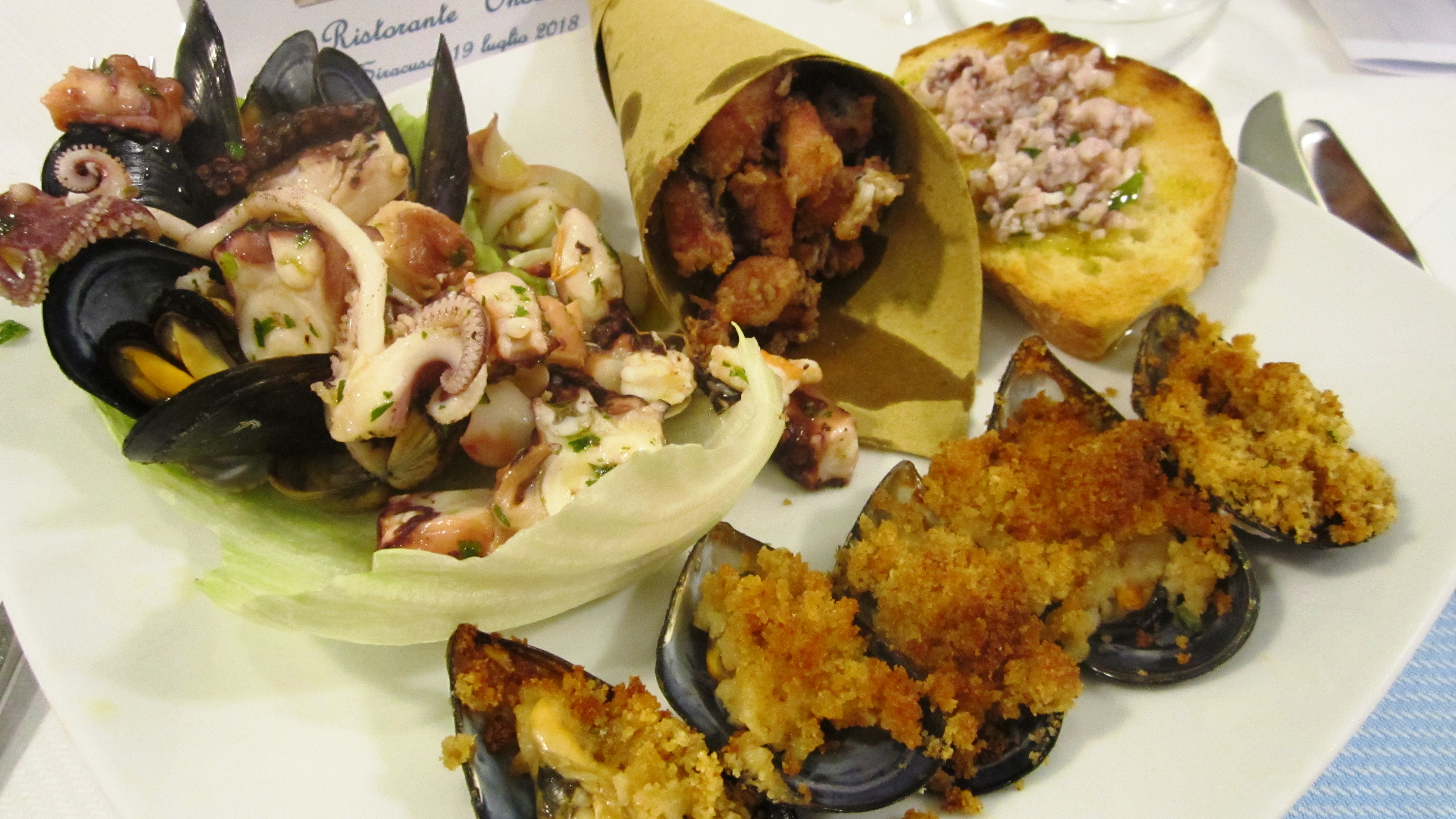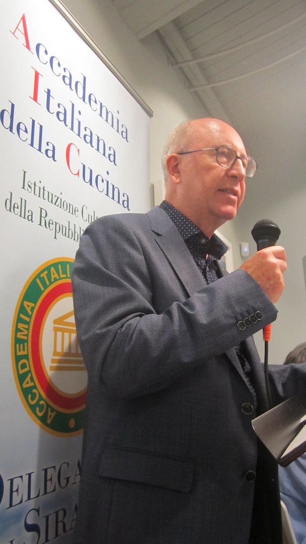 La Delegazione di Siracusa si è riunita presso il ristorante "Onda Blu" in occasione della riunione conviviale. Foto 1: il Delegato Angelo Tamburini espone brevemente "Cultura della Tavola e materie prime in AIC". Foto 2: a sinistra il Maître Massimo Risita, il Delegato Angelo Tamburini consegna guidoncino e vetrofania dell'Accademia alla proprietaria Simona Serra e allo chef Mongi Nasri. Foto 3: antipasto Onda Blu. Foto 4: Semifreddo alla mandorla di Avola.