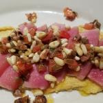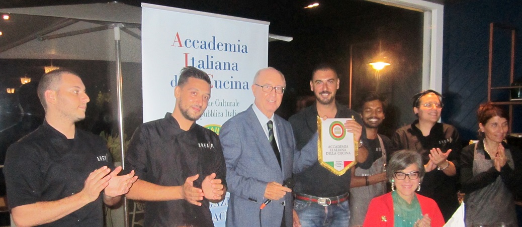 La Delegazione di Siracusa si è riunita presso il ristorante "AREA/M" in occasione della riunione conviviale. Foto 1: Angelo Tamburini, Delegato, consegna il guidoncino dell'Accademia al proprietario Giovanni Aloschi , allo chef Saverio Suma e allo staff di sala e cucina. Foto 2: il Delegato Angelo Tamburini, la Simposiarca Rosalia Sorce e lo chef Saverio Suma. Foto 3: Accademici a tavola. Foto 4: fusilloni cacio e pepe con bottarga. Foto 5: spiedino di pesce su rucola fritta e purea di patata di Siracusa. Foto 6: dolce-chips di melazana con crema di ricotta.