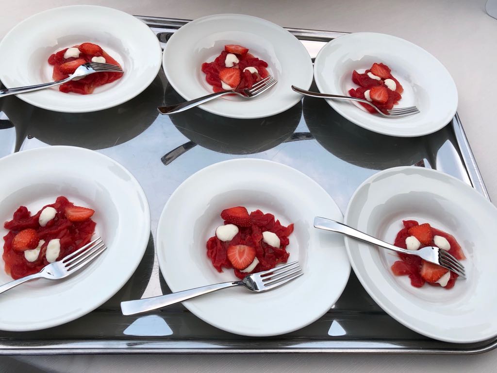 La Delegazione dell'Alto Vicentino si è riunita per la riunione conviviale di mezza estate presso il ristorante "La Favellina" di Malo, frazione di San Tomio. Foto 1 (da sinistra): staff di sala, la Simposiarca Carla Trevisan, il cameriere, il Delegato Renzo Rizzi, i titolari del locale, Federico (in cucina) e Riccardo (sala e cantina). Foto 2: particolare degli aperitivi, carpaccio di anguria. Foto 3: tortelli alla crema pasticcera di parmigiano reggiano. Foto 4: costoletta e tataki d'agnello. Foto 5: brodo di frutta e verdura con sorbetto al lampone.