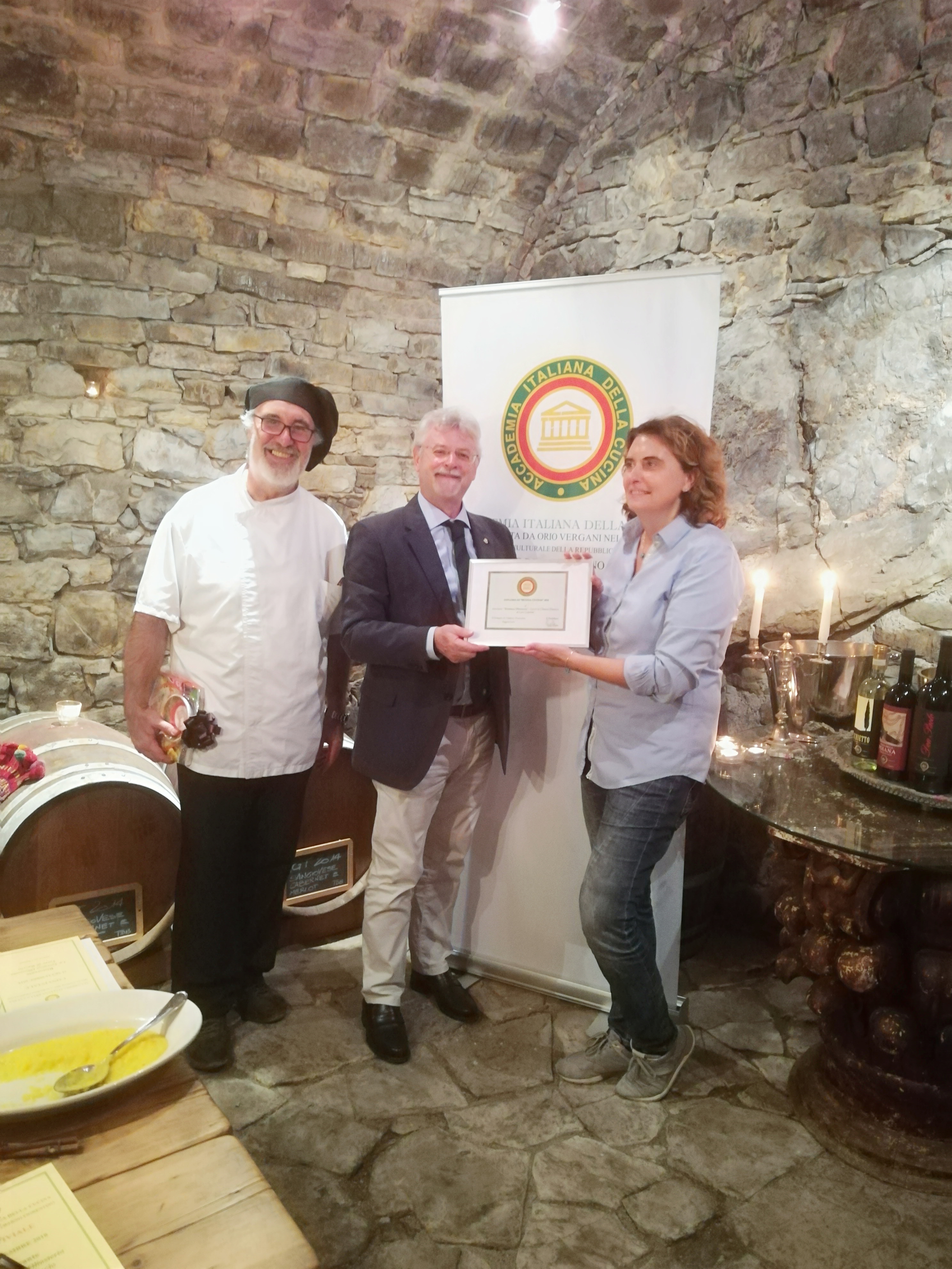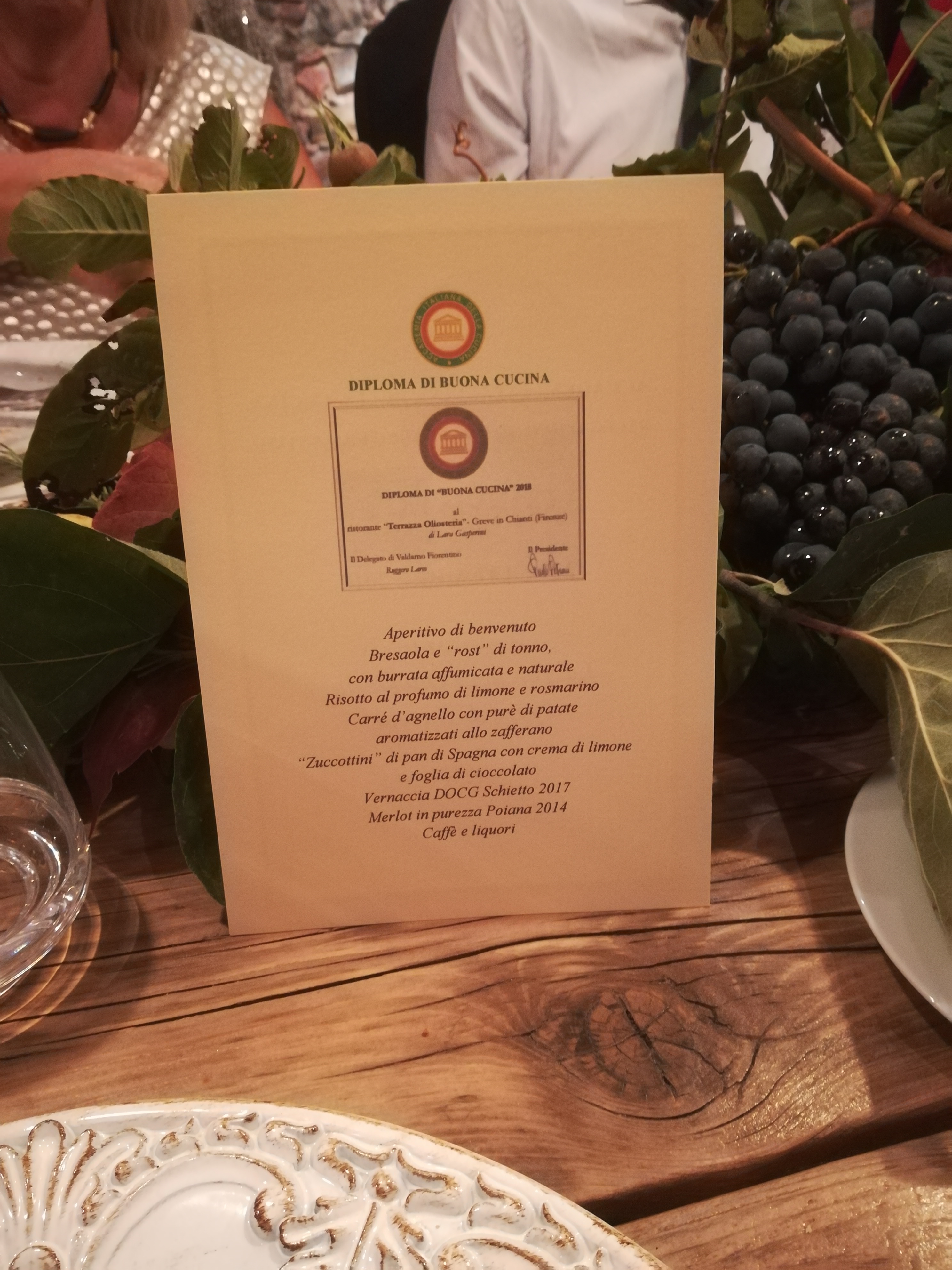 La Delegazione di Valdarno Fiorentino si è riunita presso il ristorante "Terra di Baccio" a Greve in Chianti. Foto 1: consegna del diploma di Buona Cucina 2018 al gestore Lara Gasperini. Foto 2: dono a Stefano Bertini. Foto 3: menu della serata. Foto 4 e 5: alcuni scorci del ristorante.