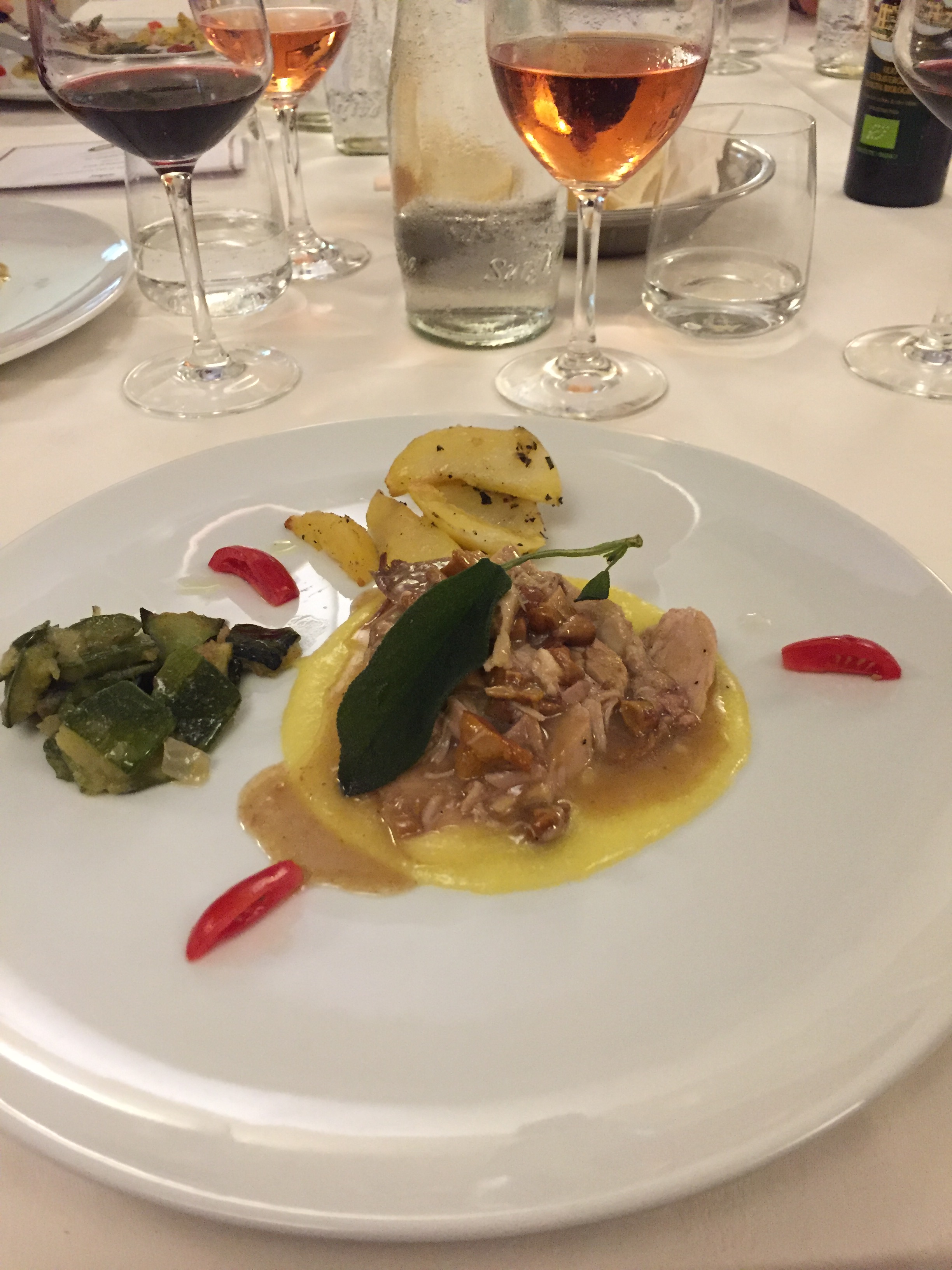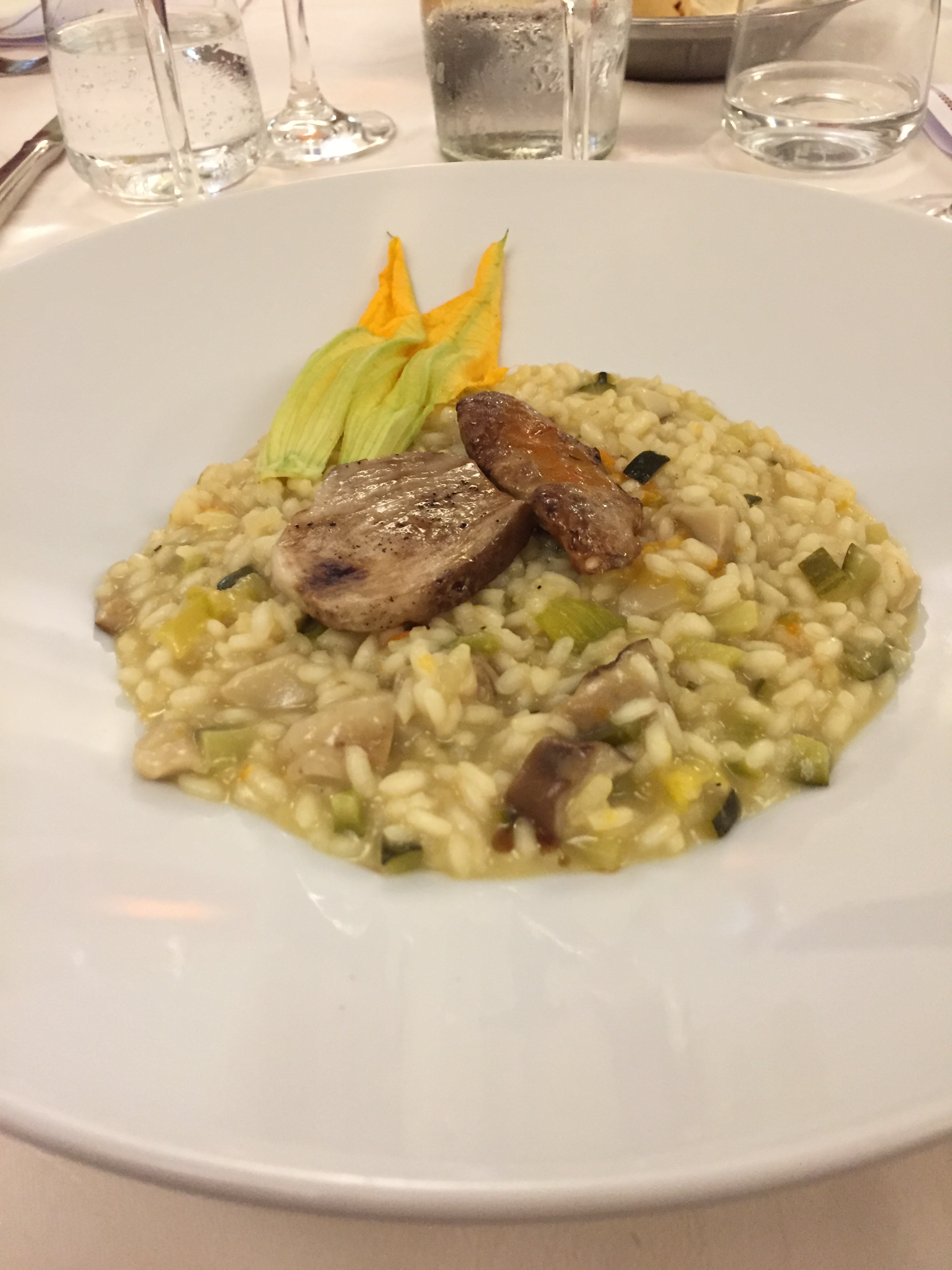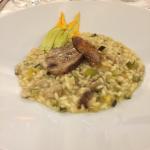 La Delegazione dei Colli Euganei - Basso Padovano si è riunita presso il ristorante "Trattoria da Marco" a Stanghella per la cena di mezza estate. Foto 1: il Delegato Piero Fracanzani si congratula con le brigate di sala e di cucina. Foto 2: crepes con fiori di zucca. Foto 3: risotto con dadolata di porcini e fiori di zucca. Foto 4: coscia di Cinta senese e patate arrosto.