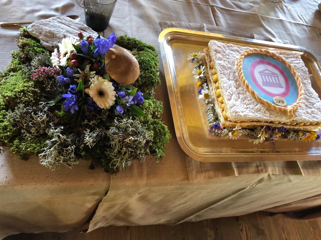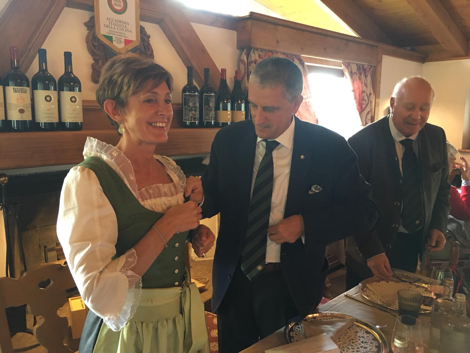 La Delegazione di Cortina d'Ampezzo ha organizzato, con il patrocino del Comune di Cortina d’Ampezzo, un convegno dal titolo “Da ra crodes a ra toura” ovvero “Dalle crode alla tavola, storia e tradizione dell’ospitalità a Cortina d’Ampezzo”. Si sono riuniti presso il ristorante "El camineto" dove è avvenuto il passaggio della campana da Luigino Grasselli alla nuova Delegata Monica De Mattia. Foto 1 e 2: alcuni momenti del convegno. Foto 3: alcuni Accademici relatori che si sono alternati sul palco, raccontando la nascita e lo sviluppo della cucina, della tradizione gastronomica e dell’ospitalità nel territorio di Cortina d’Ampezzo. Foto 4: Monica De Mattia, nuova Delegata e il Consigliere di Presidenza Renzo Rizzi. Foto 5: Monica De Mattia e Luigino Grasselli. Foto 6: dolce e centrotavola.