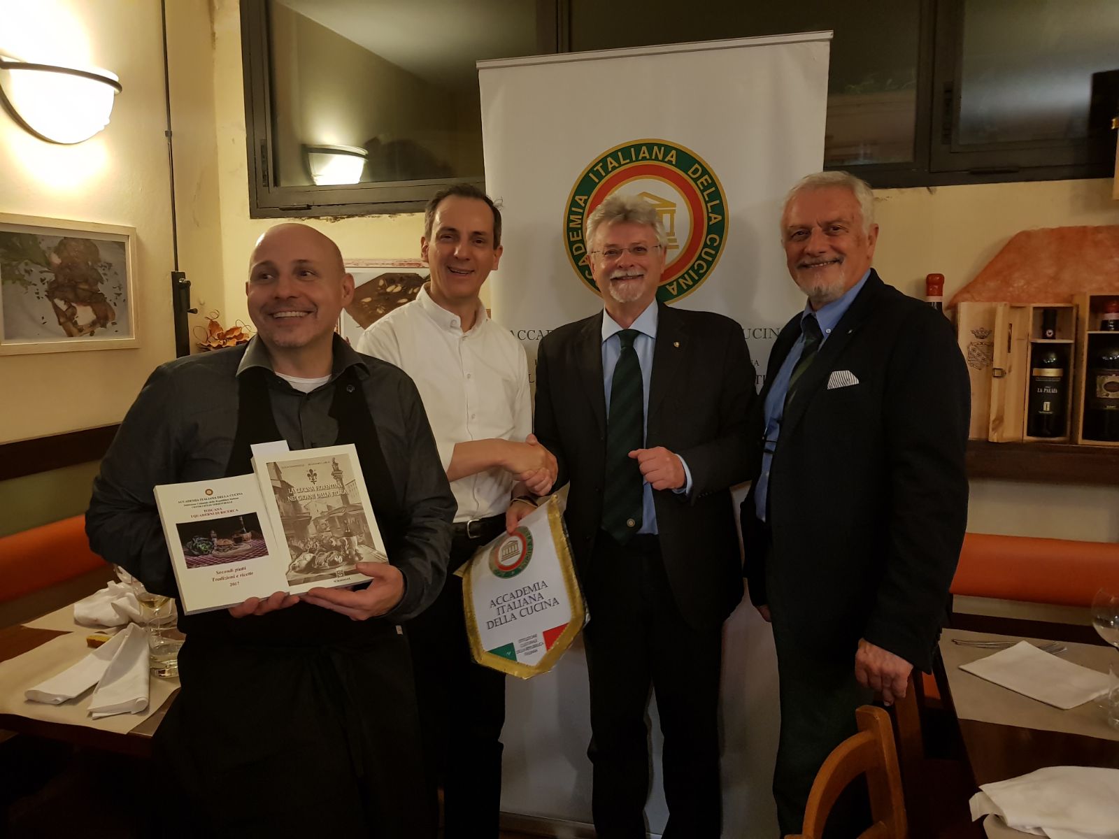 La Delegazione di Valdarno Fiorentno si è riunita presso il ristorante "La Terrazza Oliosteria" che si affaccia sulla rinascimentale piazza di Greve in Chianti. Il tema scelto è stato il dolce e forte, un piatto rinascimentale caratterizzato dalla presenza della, allora, grande novità del cacao e quindi del cioccolato. Foto 1: Stefano Bertini e Lara Gasperini servono il cinghiale in dolce forte. Foto 2: pinzimonio. Foto 3: da sinistra: lo chef del ristorante Stefano Bertini, il Segretario Generale Roberto Ariani, gestore del locale Lara Gasperini e il Delegato Ruggero Larco. Foto 4: Stefano Bertni, Roberto Ariani, la relatrice Paola Mainardi, Ruggero Larco. Foto 5: Stefano Bertni, Roberto Ariani, Lara Gasperini Paola Mainardi, Ruggero Larco.