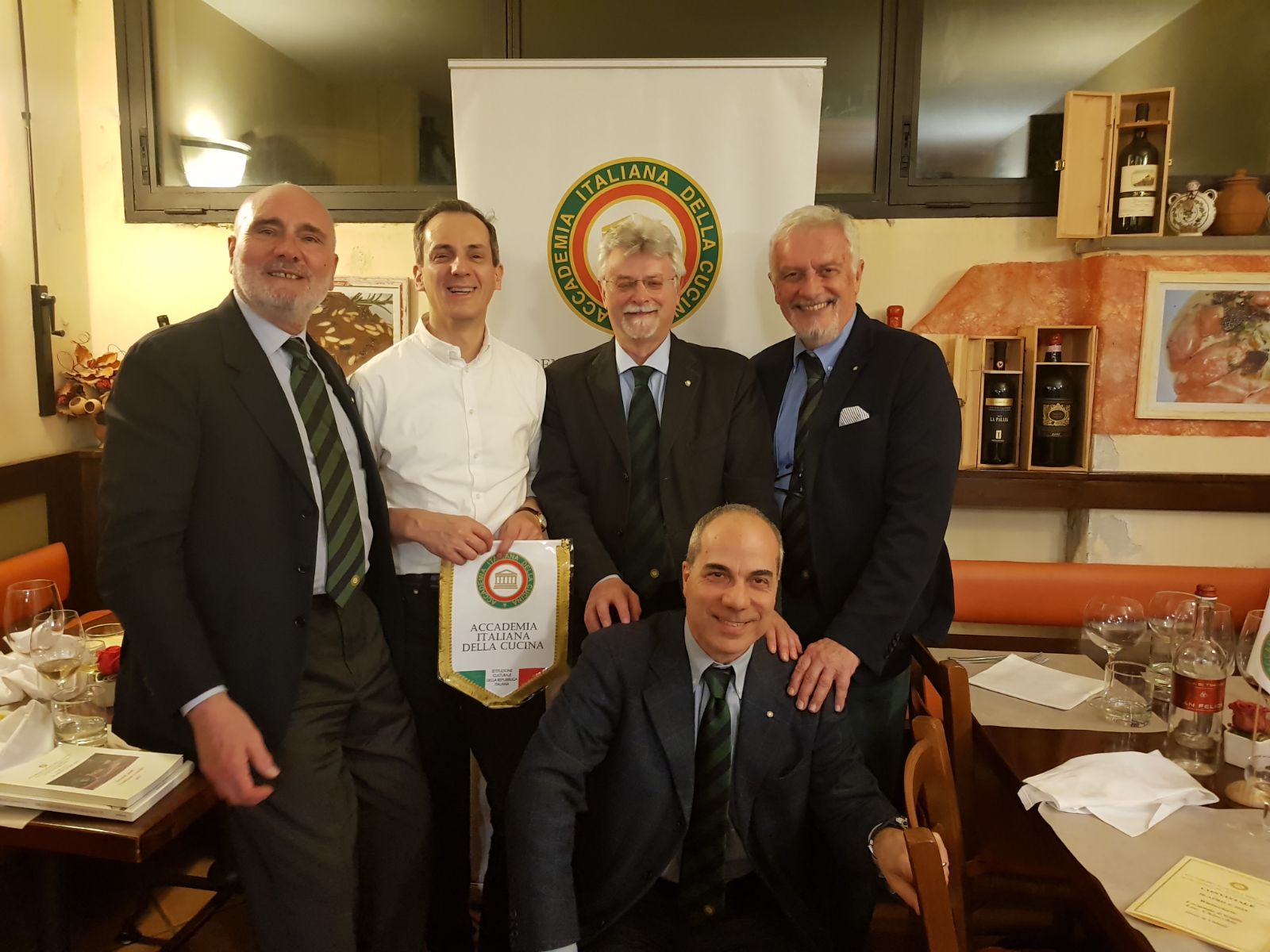 La Delegazione di Carpi Correggio si è riunita presso il ristorante pizzeria "Blu Notte". Foto 1: il Delegato Pier Paolo Veroni, insieme all'avvocato Gambigliani Zoccoli, consegnano il diploma dell'Accademia al neo Accademico Alberto Dallari Bondanini. Foto 2: consegna del diploma dell'Accademia anche per il neo Delegato Damiano Biondi. Foto 3: un momento della relazione dell'avvocato Gambigliani Zoccoli. Foto 4: un momento della serata con gli ospiti a tavola. Foto 5. consegna del guidoncino dell'Accademia al locale.