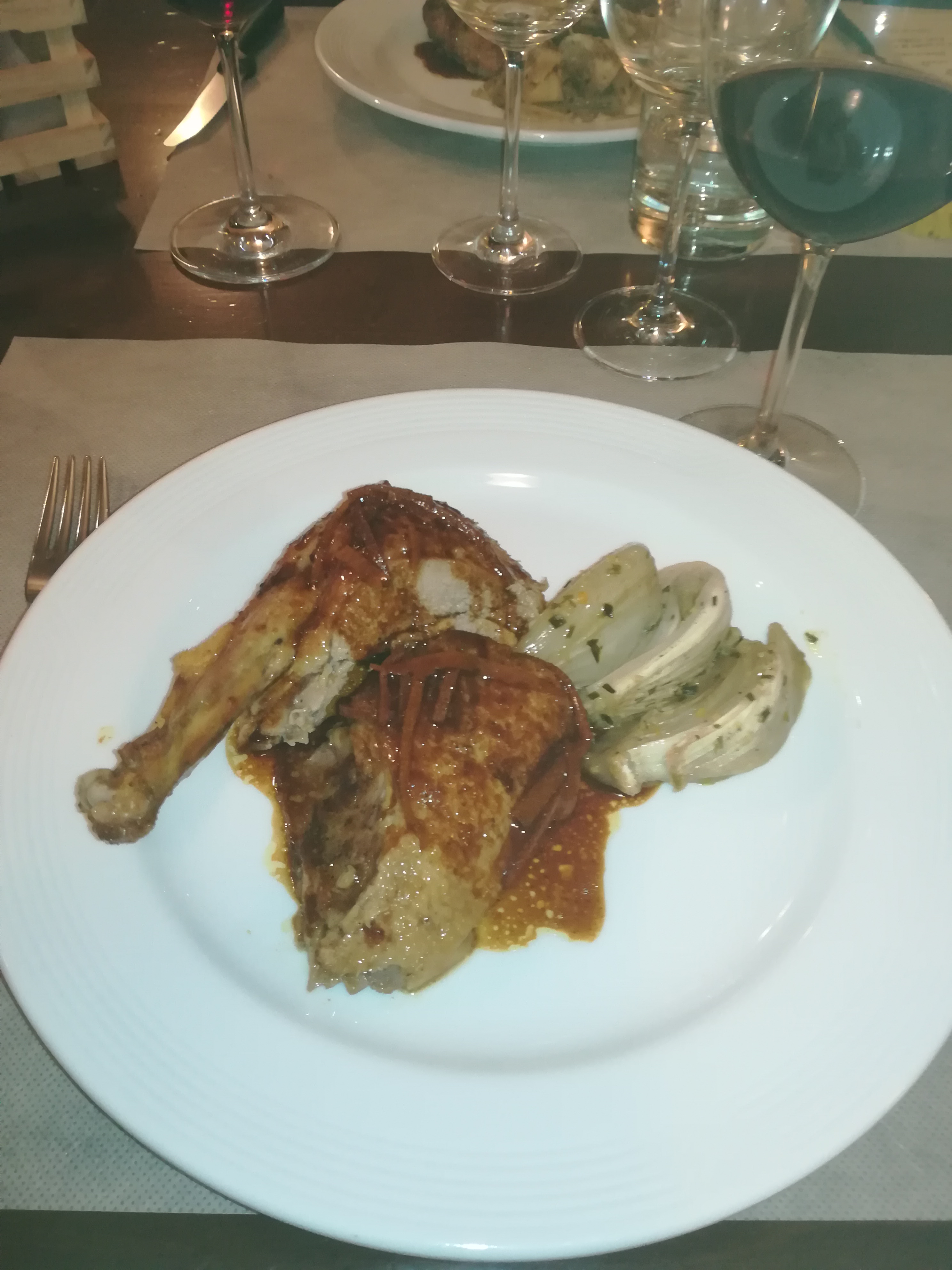 La Delegazione del Valdarno Fiorentino si è riunita presso la locanda "il Gallo" a Chiocchio, Greve in Chianti in occasione della riunione conviviale. Foto 1: anatra all'arancia, piatto presentato in occasione della serata. Foto 2: Simposiarca Marco Giusti, il cuoco Yari Pesucci e il Delegato Ruggero Larco. Foto 3: da sinistra: il Delegato Ruggero Larco, alcuni ospiti, Francesco Rustioni e Alessio Pesucci, gestore del locale. Foto 4: da sinistra: il sommelier Francesco Rustioni, Alessio Pesucci, Ruggero Larco e il Simposiarca Marco Giusti. Foto 5: da sinistra: l'Accademico Armando Tappa, Alessio Pesucci, Ruggero Larco, Marco Giusti e, in basso, il Tesoriere Sandro Fusari.