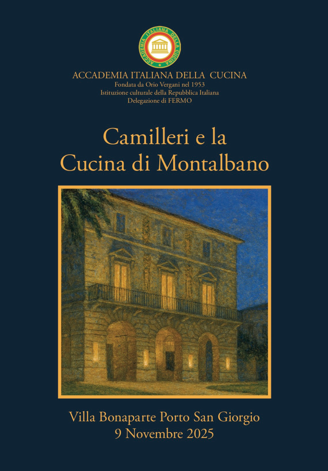 In occasione del centenario della nascita di Andrea Camilleri, la Delegazione di Fermo intende organizzare una conferenza su Camilleri e la cucina di Montalbano in apertura dell'incontro accademico che si terrà a Porto San Giorgio il 9 novembre nei saloni di villa Bonaparte.