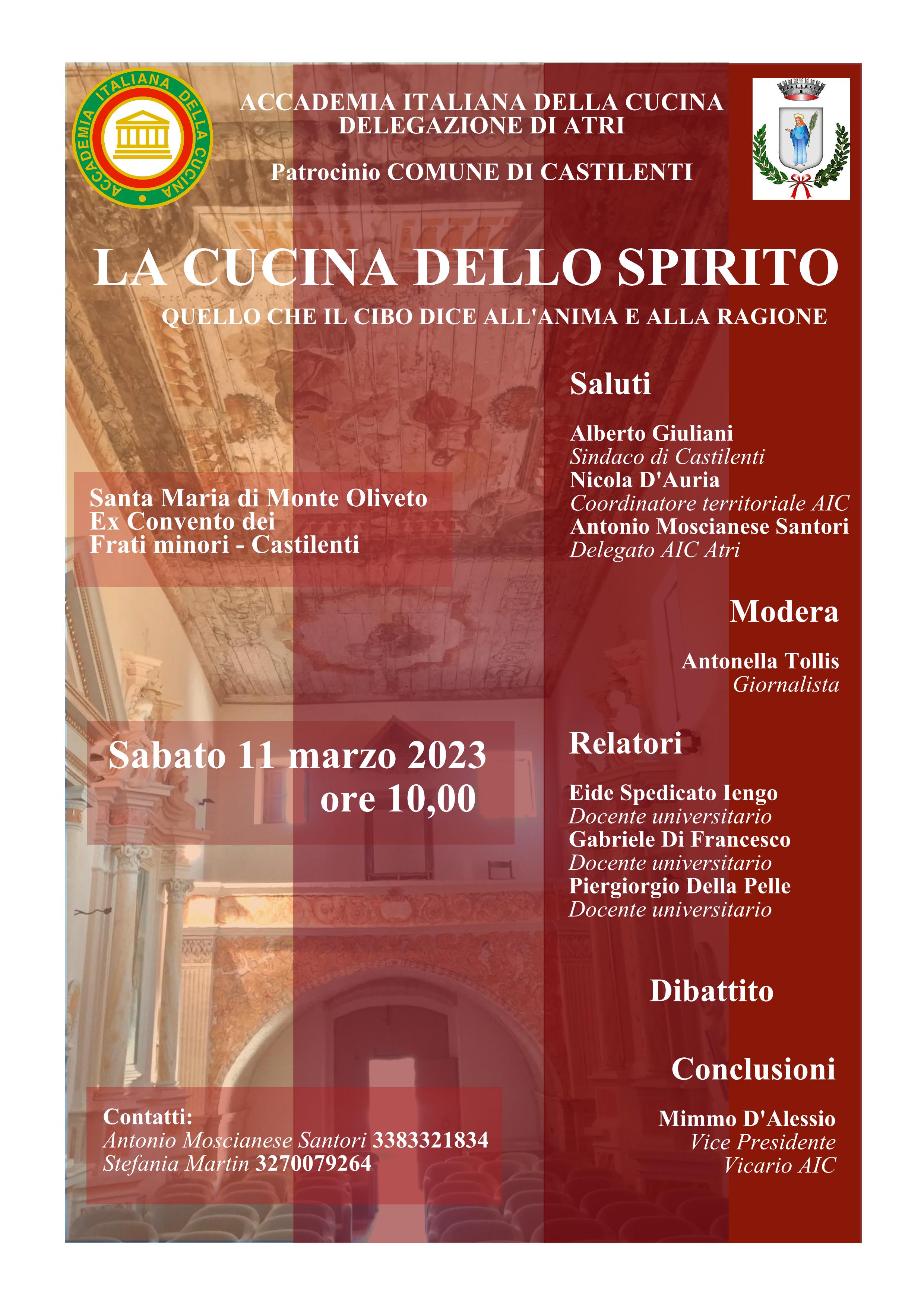 La Delegazione di Atri organizza, con il patrocinio del Comune di Castilenti (TE), il convegno "La cucina dello spirito: ciò che il cibo dice all'anima e alla ragione".