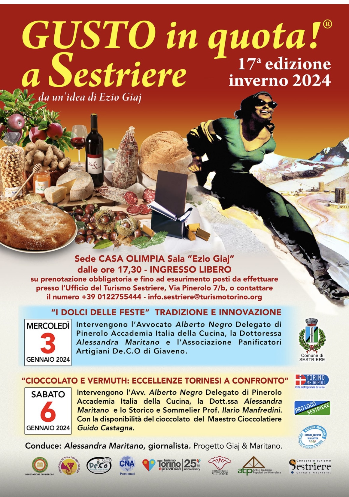 Anche quest'anno si terrà la manifestazione "Gusto in quota! A Sestriere" organizzata da Turismo Torino e Provincia, il Comune di Sestriere, la Città Metropolitana di Torino, con la partecipazione della Delegazione di Pinerolo dell'Accademia Italiana della Cucina e altri enti di settore. La rassegna giunta alla 17ª edizione, si terrà il 3 e 6 gennaio 2024.