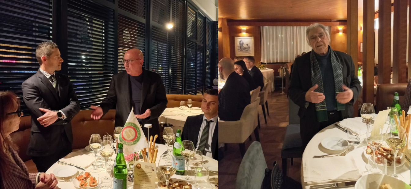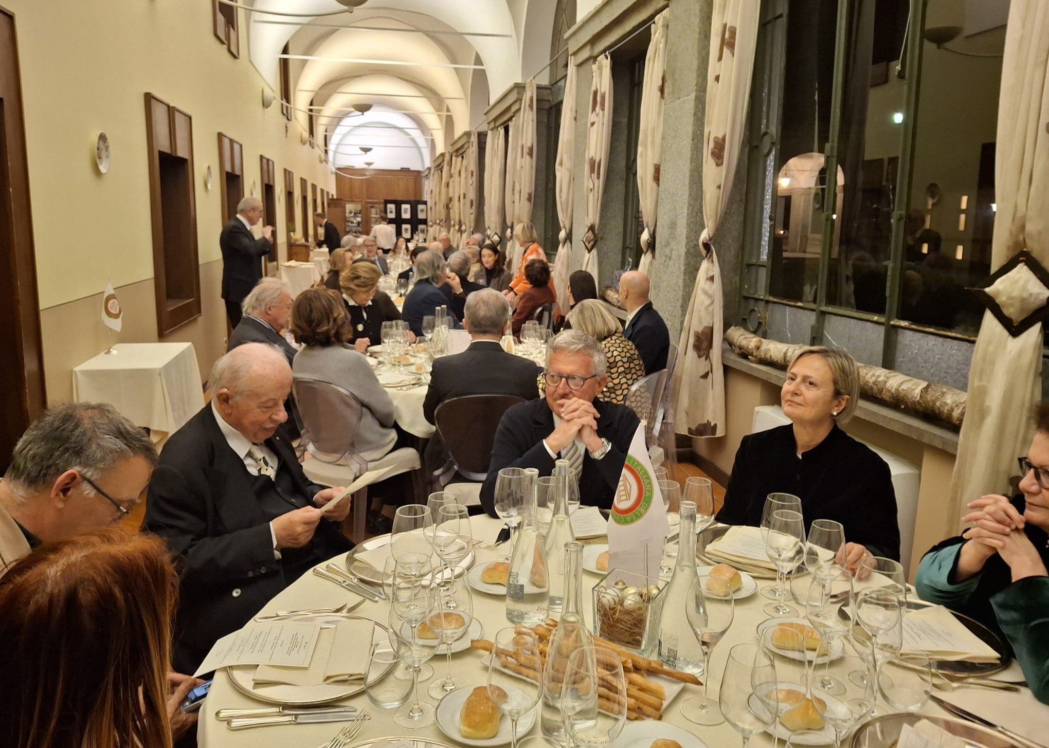 L’evento accademico per celebrare il riconoscimento UNESCO a Monaco di Baviera si è svolto alla presenza di numerosi ospiti istituzionali, tra cui il Console Generale Min. Fausto Panebianco, presente al convivio nel suo primo giorno di incarico. Tra le istituzioni intervenute figuravano l’Istituto Italiano di Cultura, la Camera di Commercio Italo-Tedesca, l’Associazione Dante Alighieri, l’Ente Nazionale del Turismo, l’Unione degli Ufficiali in Congedo, oltre ad associazioni gastronomiche tedesche, fondazioni e giornalisti. Momento centrale della celebrazione è stato l’intervento di Peter Peter, autore, giornalista e critico gastronomico, che ha ripercorso i principali riferimenti storici della cucina italiana, dalle origini antiche fino alle pubblicazioni del Novecento, soffermandosi anche sui valori culturali e conviviali legati alla tradizione della tavola. I Simposiarchi Mattia Dalla Costa e Luca Pelosi hanno presentato il menu, un connubio di portate creative e di elevata maestria in cucina, accompagnate da piatti della tradizione, piemontese in questo caso: gli agnolotti del plin e il brasato al barolo. In chiusura di serata i Simposiarchi hanno invitato ad intervenire il cuoco Mario Gamba, il quale ha reso il ristorante Acquarello un riferimento del più elevato livello della cucina italiana a Monaco, ed ha continuato a mantenere questa posizione durante 35 anni di attività.