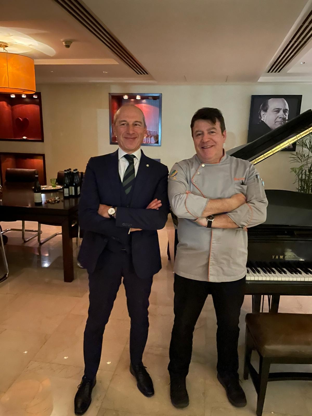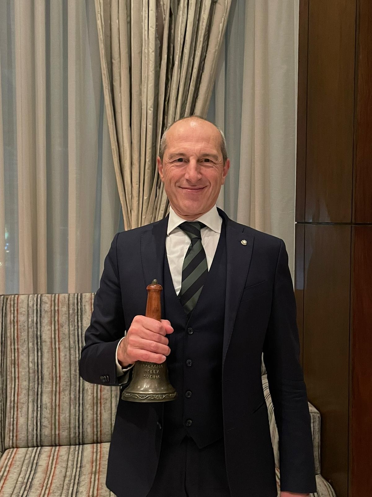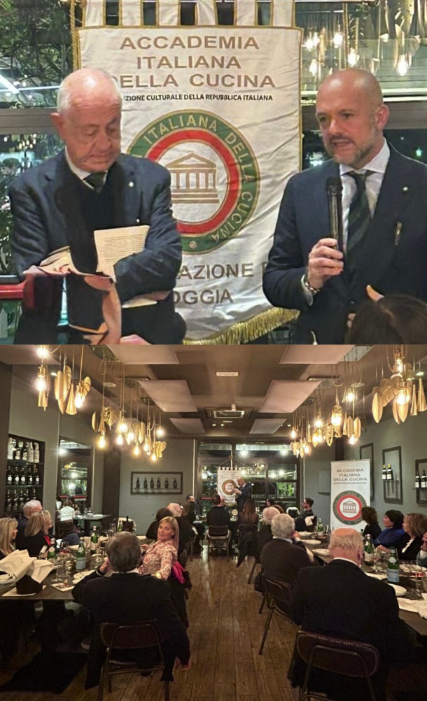 La sera del 26 gennaio 2026, circa settanta partecipanti della Delegazione di Londra si sono riuniti presso il Corinthia Hotel per celebrare il ritorno dello chef Francesco Mazzei sulla scena londinese con il nuovo ristorante Mezzogiorno by Francesco Mazzei, affacciato sul Tamigi. Tra i presenti il Console Generale Domenico Bellantone, il Direttore ICE/ITA Giovanni Sacchi, la Console Rossella Gentile e l’Addetto al coordinamento di polizia e giudiziaria dell’Ambasciata d’Italia Federico Sciaudone. È stato degustato un menu di grande raffinatezza e autenticità, aperto da assaggi di tonno piccante, pizzette con ’nduja al miele e arancini al pomodoro, in abbinamento a La Scolca Brut bianco e rosé. Sono seguite lasagnette ai carciofi romani e ombrina al forno con salsa verde e caponata siciliana, accompagnate da Gavi di Gavi Etichetta Nera e Chianti Riserva Castello di Albola, piatti che hanno raccolto ampi consensi. Il dessert ha previsto sorbetto al mandarino e torta al cioccolato amaro, abbinati a Sauvignon Ca’ Bolani. "Mezzogiorno" è stato definito dallo chef una “trattoria elegante”, con una cucina che valorizza i sapori tradizionali della sua terra. La serata, di grande successo, ha visto Francesco Mazzei intrattenersi tra i tavoli illustrando i piatti. Applausi finali al personale di sala e alla Simposiarca Silvia Mazzola; il Delegato ha quindi consegnato il piatto ricordo dell’Accademia al resident chef Francesco Chiarelli, storico collaboratore di Mazzei.