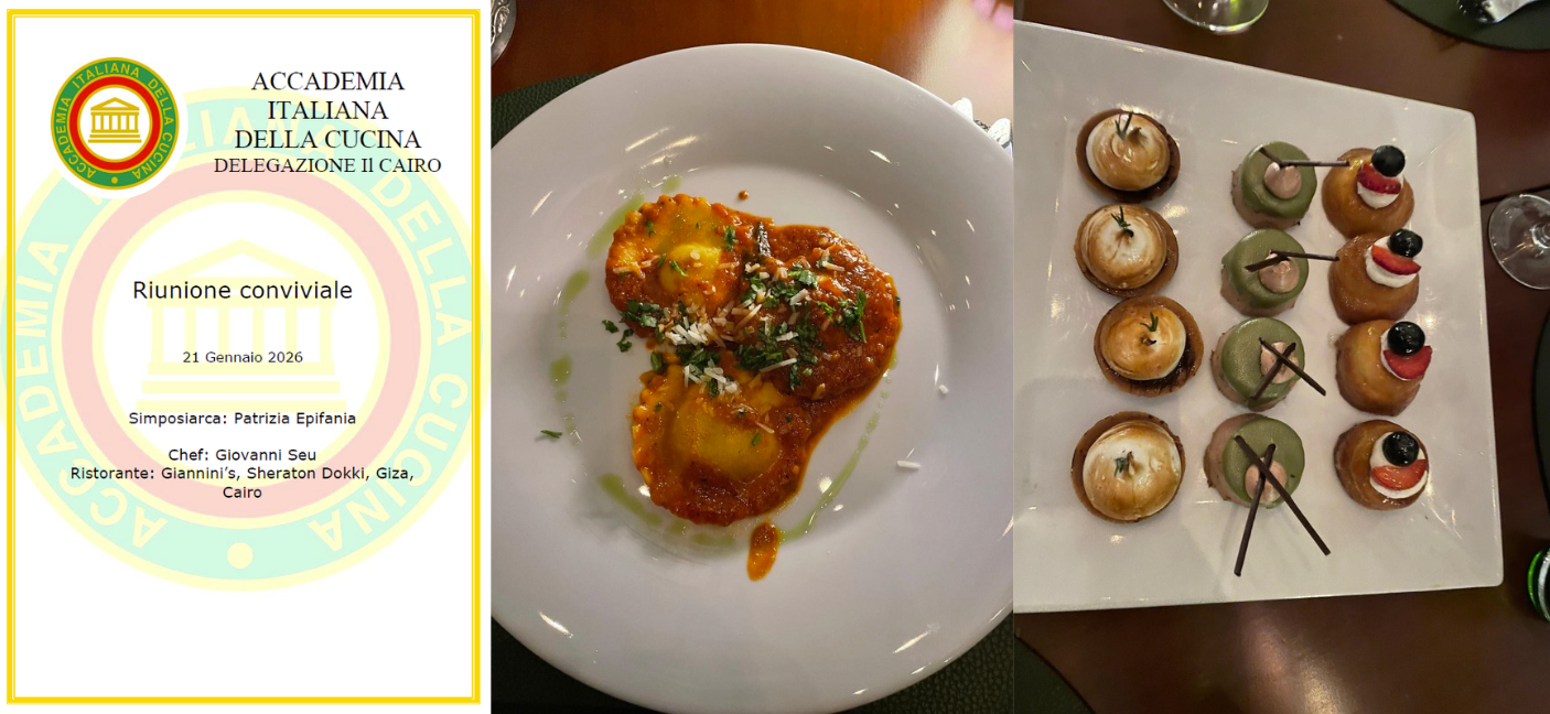 Si è tenuta al Giannini’s New York Italian Restaurant (Sheraton Cairo Hotel) la prima riunione conviviale dopo la trasformazione della Legazione Il Cairo in Delegazione. Sotto la guida della Simposiarca Patrizia Epifania e dello chef Giovanni Seu, il menu ha interpretato il tema del Chilometro Zero, valorizzando prodotti stagionali e leguminose comuni a Italia ed Egitto. La serata ha rappresentato un momento fondativo per la Delegazione, unendo tradizione gastronomica, sostenibilità e dialogo culturale tra i due Paesi.