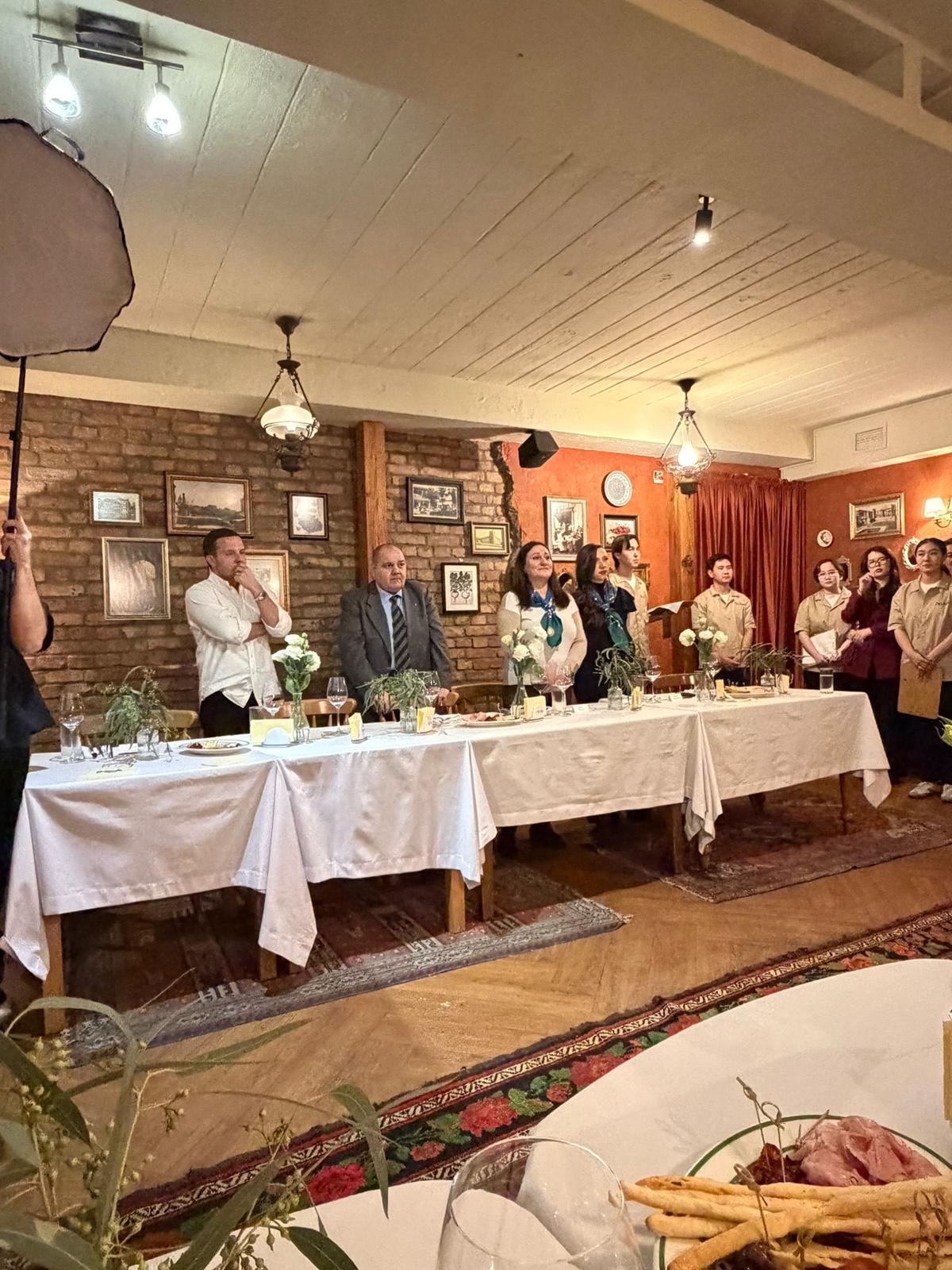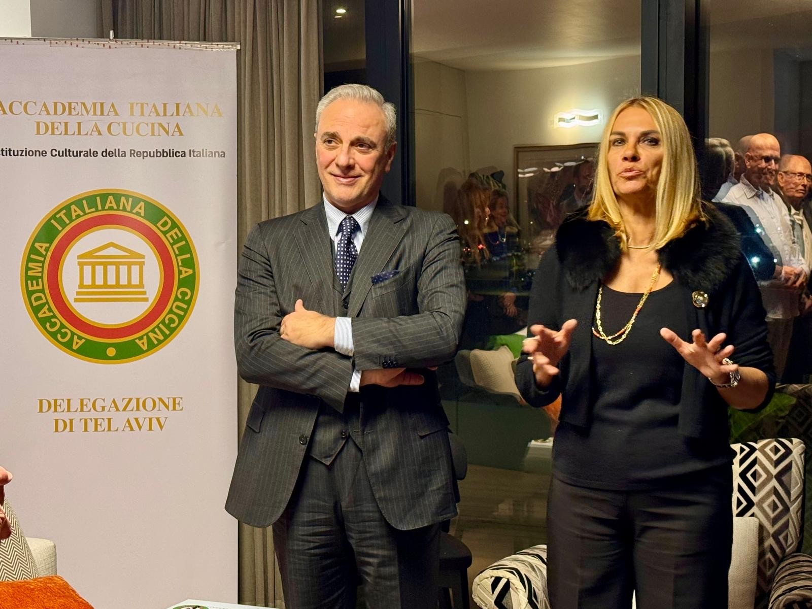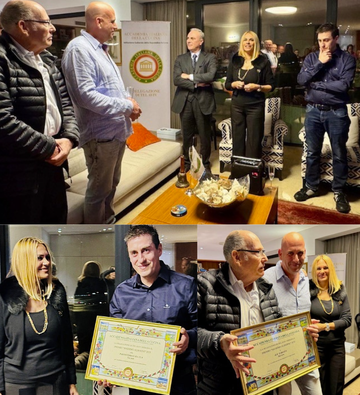 La riunione conviviale per la consegna dei Premi 2025 si è svolta presso il Blue Canada Israel a Tel Aviv, alla presenza dell’Ambasciatore d’Italia in Israele, S.E. Luca Ferrari, dei principali membri dell’Ambasciata e di numerose personalità della vita culturale locale, oltre a quasi tutti gli Accademici. I destinatari del Premio Massimo Alberini (2025) sono stati il pasticcere Davide Dorbini, con la pasticceria "Casa Tua", e il vivaio/orto "Ale’ ad Habaita" di Yuval e Gidon Hellman, per la produzione unica in Israele di verdure italiane. Durante la serata è stato fatto un brindisi per celebrare il riconoscimento UNESCO della cucina italiana come patrimonio immateriale dell’umanità, con interventi della Delegata Cinzia Klein e dell’Ambasciatore S.E. Luca Ferrari. L’Accademico Roberto Della Rocca ha presentato un breve simposio sulle verdure nella cucina italiana. Il cibo della serata, molto apprezzato, è stato preparato dalla chef Totem Fadlun, proprietaria del catering "Momenti" di Tel Aviv. Di particolare rilievo il dolce di Dorbini: un “cornettone” di 70 cm ripieno di panna montata e frutti di bosco.