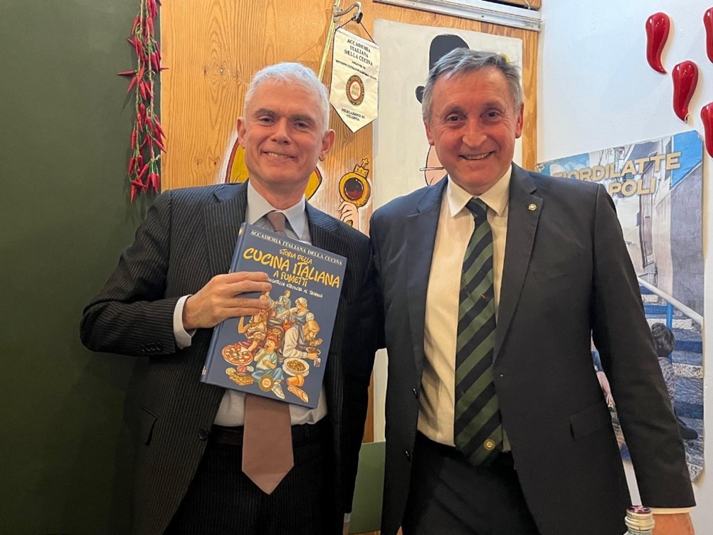 La Delegazione di Francoforte ha celebrato un duplice traguardo: il trentennale della fondazione e il recente riconoscimento della cucina italiana come Patrimonio Culturale Immateriale dell’UNESCO. Una serata che ha unito memoria e futuro, tradizione e apertura internazionale. Fondata il 3 gennaio 1996 su iniziativa dell’attuale Delegato di Vienna, Franco Benussi, la Delegazione si dedica alla valorizzazione della realtà gastronomica italiana sul territorio, espressione della “cucina decentrata”: lontana dal centro ma legata alla tradizione e capace di dialogare con contesti internazionali. Al centro il riconoscimento UNESCO: tributo a un patrimonio vivo fatto di convivialità, rituali e trasmissione culturale. Luca Cesari, storico della gastronomia e autore, ha guidato i presenti con gli interventi “La cucina italiana e il riconoscimento UNESCO: valore, identità e prospettive” e “La cucina italiana nel mondo: un viaggio tra tradizione, evoluzione, contaminazioni e identità”, offrendo nuovi strumenti di lettura. La serata, sotto il patrocinio del Consolato Generale d’Italia a Francoforte e in collaborazione con l’Istituto Italiano di Cultura di Colonia, ha visto la partecipazione del Console Generale Massimo Darchini e dei Delegati di Monaco di Baviera e Colonia, oltre a Roberto Zangrandi, primo Delegato e fondatore, giunto da Bruxelles. Momento speciale il riconoscimento dei 25 anni di appartenenza all’Accademia di Renzo Bianchi, già Accademico di Francoforte e ora a Torino. La serata si è conclusa con il suono della campana, suggellando l’anniversario e il valore universale della cucina italiana.