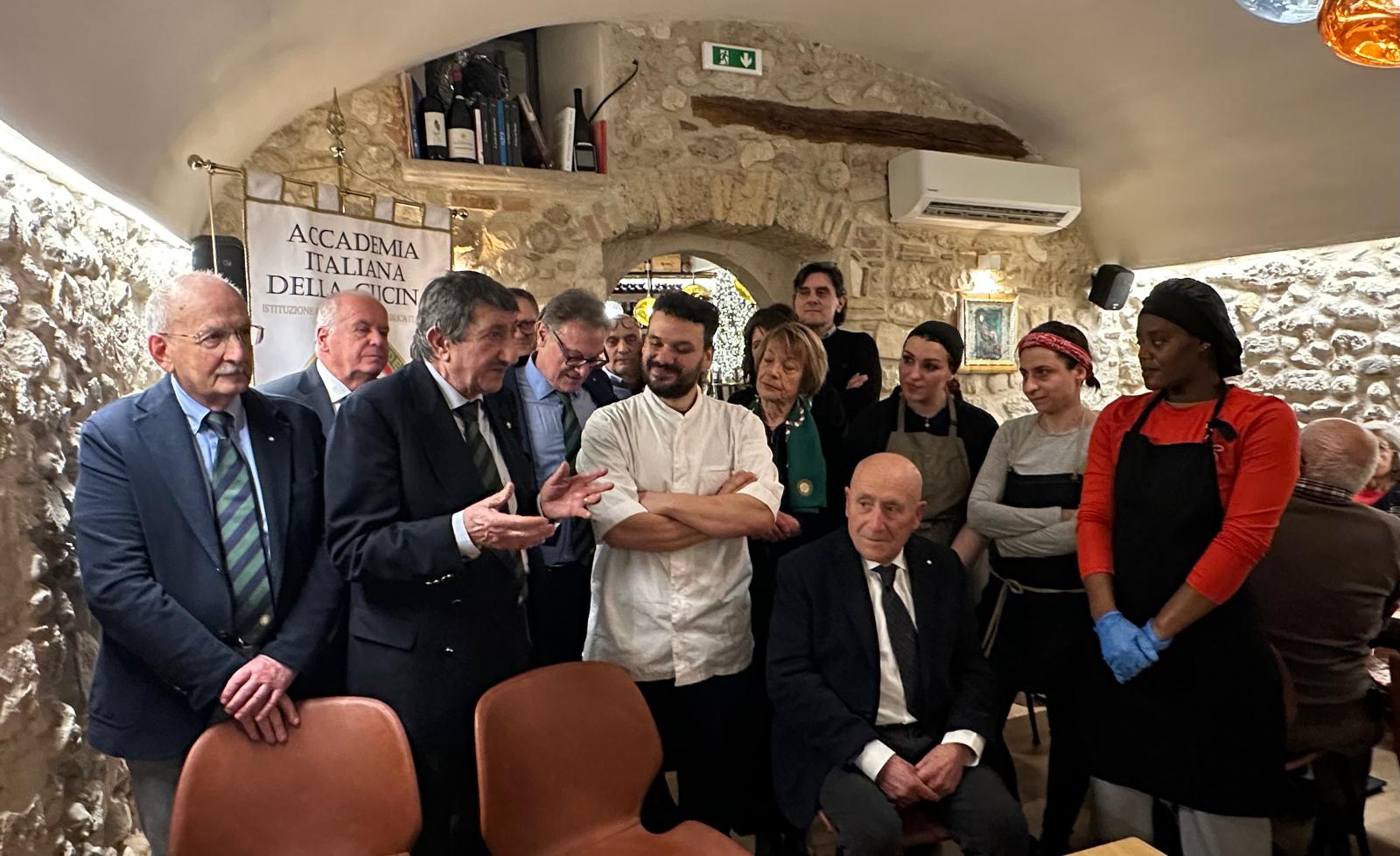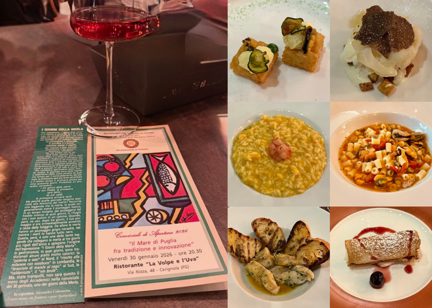 La riunione conviviale di apertura dell’anno 2026, dedicata a “Il mare di Puglia tra tradizione e innovazione”, si è svolta a Cerignola presso il ristorante “La Volpe & l’Uva”. Ha introdotto la serata il Delegato e Simposiarca Valerio Antonio Vinelli, il quale ha parlato del riconoscimento UNESCO alla Cucina italiana ed ha precisato che lo stesso è stato promosso e sostenuto prevalentemente dalla nostra Associazione. Ha, quindi, illustrato le caratteristiche del locale e il menu della serata. Molto apprezzato l’intervento del Coordinatore Territoriale Puglia Nord e Delegato di Bari Vincenzo Rizzi, che ha offerto una riflessione sul ruolo dell’Accademia e degli Accademici come custodi e difensori della cucina, fornendo spunti di grande interesse anche per i nuovi soci e gli ospiti presenti. Il menu ha raccontato l’Adriatico pugliese con equilibrio e tecnica: riso, patate e cozze in chiave contemporanea; seppia con grana di pane e tartufo nero dei Monti Dauni; risotto al datterino giallo con gambero rosso crudo e cotto; tubettini in brodetto di cozze e vongole; pescatrice in guazzetto e cannolo di pane raffermo con ricotta e amarene. Il ristorante, sorto nel 2011, erede del mitico “Bagatto”, è condotto dal titolare Beppe D’Agostino, coadiuvato dalla moglie Miriam Sforza, chef unitamente allo storico chef Luigi Oratore. A conclusione della serata, il Delegato ha consegnato ai coniugi Beppe e Miriam la vetrofania dell’Accademia e il guidoncino della Delegazione di Foggia, quale apprezzamento per il loro operato.