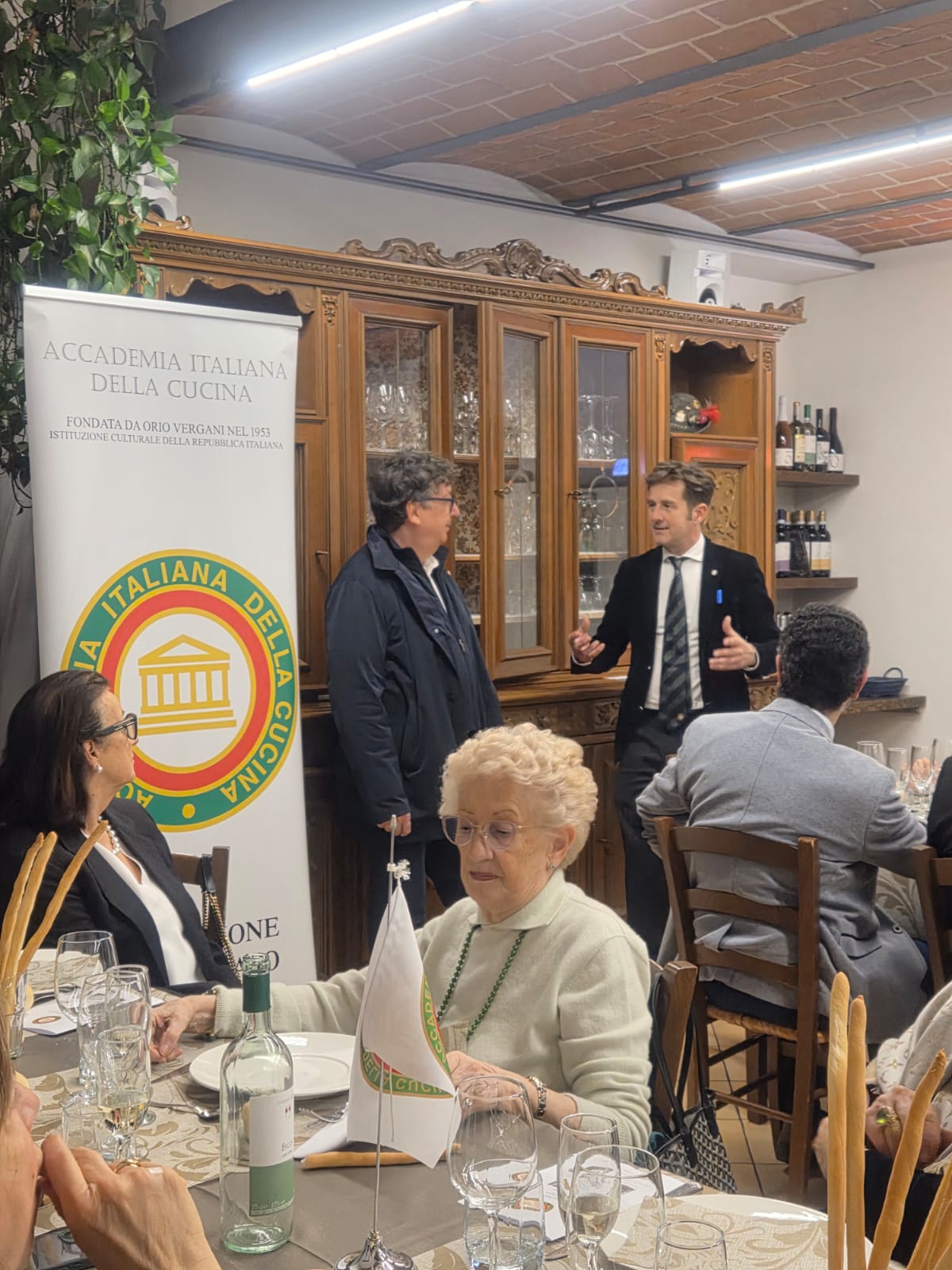 Per celebrare l’Ecumenica straordinaria per il riconoscimento UNESCO della cucina italiana a patrimonio immateriale dell’Umanità, gli Accademici si sono riuniti presso la Fattoria Il Palagio a Scarperia e San Piero. Un ambiente raffinato, gestito da quarant’anni dalla stessa famiglia, con una cucina della tradizione del territorio, in perfetta sintonia con il significato e i valori dell’occasione. Presenti alla serata il Sindaco di Borgo San Lorenzo Leonardo Romagnoli, in rappresentanza anche dell’Unione dei Comuni del Mugello, e l’Assessore alla Cultura Marco Casati per il Comune di Scarperia e San Piero. Dopo la presentazione dell’evento, è stato proiettato il video con il saluto del Presidente Paolo Petroni, accolto con un caloroso applauso. Il menu della serata, in un susseguirsi di antichi e gustosi sapori preparati con passione e maestria da Leonardo Manzani e Cristian Mattia, ha annoverato tra i piatti quello più identitario del territorio: il tortello di patate con ragù di anatra. Tra le altre preparazioni, farinata di cavolo nero, crostini con i fegatini e di polenta con funghi come antipasto, seguiti dall’eccellente maialino al forno. A concludere il convivio, una raffinata dolcezza al cioccolato creata per l’occasione. Ottimi i vini e l’abbinamento proposto da Mirko Manzani, che ha diretto un servizio rapido e premuroso. Una serata di festa durante la quale è stato ripercorso l’iter verso il prestigioso riconoscimento, riflettendo sul suo valore culturale e sull’importanza della nostra cucina.