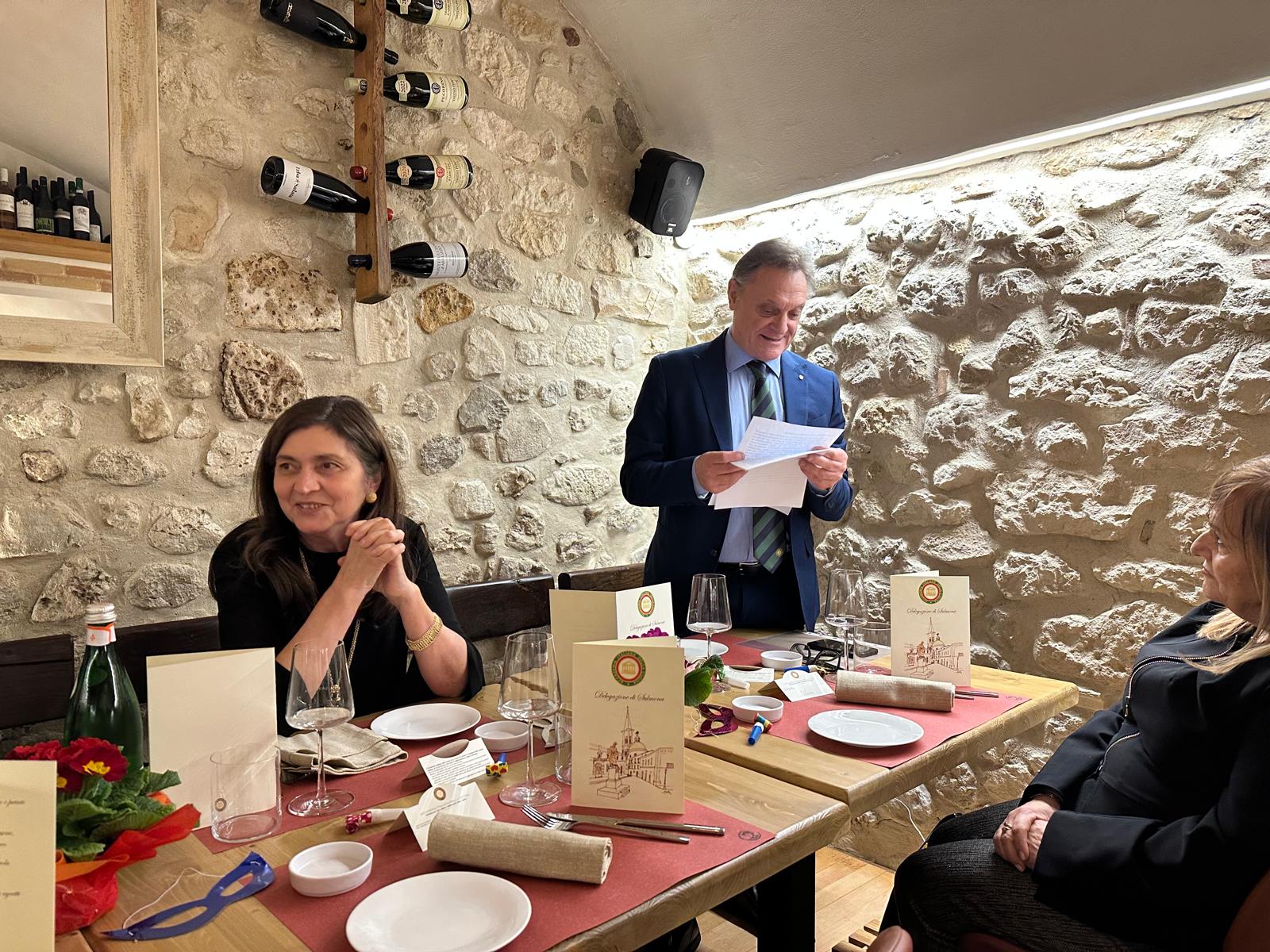La Delegazione vastese si è riunita al ristorante Il Posticino di Vasto per celebrare la Conviviale regionale sul tema “Le tradizioni del Carnevale in Abruzzo”, condivisa in contemporanea con le nove Delegazioni abruzzesi per unire convivialità, ricerca storica e valorizzazione del patrimonio locale. Ogni Delegazione ha proposto un menu ispirato ai piatti tipici della festa, storicamente legata a riti di abbondanza prima del rigore quaresimale. Simposiarca della serata Anna Roselli, che ha illustrato il menu in continuità con la relazione introduttiva di Antonella Marrollo su “Le tradizioni del Carnevale nel territorio vastese”. Nel suo intervento, Marrollo ha evidenziato che il Carnevale vastese non è un insieme di ricette ma un sistema culturale legato a stagioni, comunità, attesa e rinuncia; ricordare queste pietanze significa riconoscerle come parte dell’identità e del patrimonio gastronomico. Nel Vastese si mangiava di più per rito, non per gola, e riproporre oggi quei piatti vuol dire conservarne la memoria e il valore culturale. Il Delegato Adri Cesaroni ha sottolineato che celebrare il Carnevale è un omaggio alle radici agrarie e sociali del territorio e che custodire queste tradizioni consente di mantenere vivo il legame con la storia, evitando che vadano perdute.