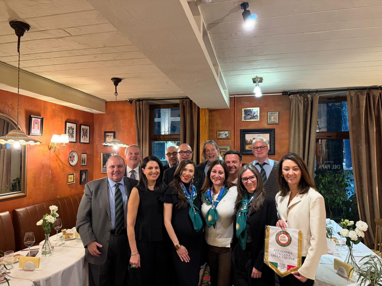Prima cena celebrativa della Delegazione di Los Angeles per il riconoscimento UNESCO alla Cucina Italiana come Patrimonio Immateriale dell’Umanità. La scelta del ristorante “Tra di Noi”, a Malibu, ha rappresentato anche un gesto di vicinanza a un’area duramente colpita dagli incendi del gennaio 2025. Alla serata hanno partecipato il Console Generale Valentini, la Console Errighi e il Capo della Camera di Commercio Estero, dott. Riganò. Gli ospiti sono stati accolti dal proprietario, il signor Tarcisio Mosconi, ristoratore romano che da oltre trent’anni guida un locale simbolo della ristorazione italiana a Malibu. Il benvenuto è stato accompagnato da pizzette artigianali e prosecco. La celebrazione è stata aperta dal Console Generale Valentini, che ha sottolineato il valore culturale del riconoscimento UNESCO e il ruolo dell’Accademia nella promozione della candidatura, esprimendo apprezzamento per le attività della Delegazione di Los Angeles. Molto apprezzato l’intervento dello speaker ospite Michael Patrick Schiels, conduttore radiofonico e autore, che ha condiviso aneddoti dei suoi viaggi gastronomici in Italia, offrendo uno sguardo americano sulla nostra cultura culinaria. Il menu ha proposto orecchiette al tartufo nero e cacio e pepe, seguite da scaloppine di vitello ai capperi o salmone in crosta di pistacchio con riduzione di barbabietola, verdure di stagione e tiramisù della casa. Le pietanze, accompagnate da prosecco e vini italiani, sono state apprezzate per qualità ed equilibrio dei sapori. Simposiarca della serata la vice Delegata Paola Lorenzi.