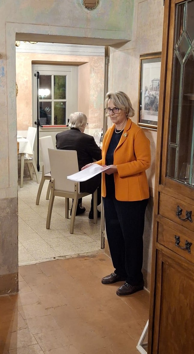 Il nuovo anno della Delegazione di Pisa si è aperto con una bellissima e partecipata riunione conviviale all’Agriturismo “Fattoria Le Prata”, organizzata con cura dalla Simposiarca Marina Giannessi. Il titolare Alessandro Agostini ha presentato agli Accademici la sua azienda e la coltivazione del pomodoro Mauro Rosso, fiore all’occhiello della Fattoria e leitmotiv del menu. Dopo un calice di benvenuto con spumante della Tenuta Buonamico e una focaccia al pomodoro della Fattoria, il pranzo è proseguito con un antipasto a base di crostino ai cinque cereali con mozzarelline e pomodoro e una crema di ceci con cipollina in agrodolce. A seguire cappelletti fatti a mano ripieni di ricotta con sugo di pomodoro e basilico, quindi medaglione di maiale con purè di patate bio e verdure di stagione al forno. Dessert a base di crumble di mele bio con panna e piccoli krapfen. In abbinamento vini Sorbaiano rosso e bianco. Durante la riunione è intervenuta la prof.ssa Emilia Ghelardi, docente di microbiologia molecolare all’Università di Pisa, che ha tenuto una brillante conferenza sulla microbiologia e sui probiotici. L’ambiente caldo, con il caminetto acceso, ha contribuito alla piena riuscita della serata.