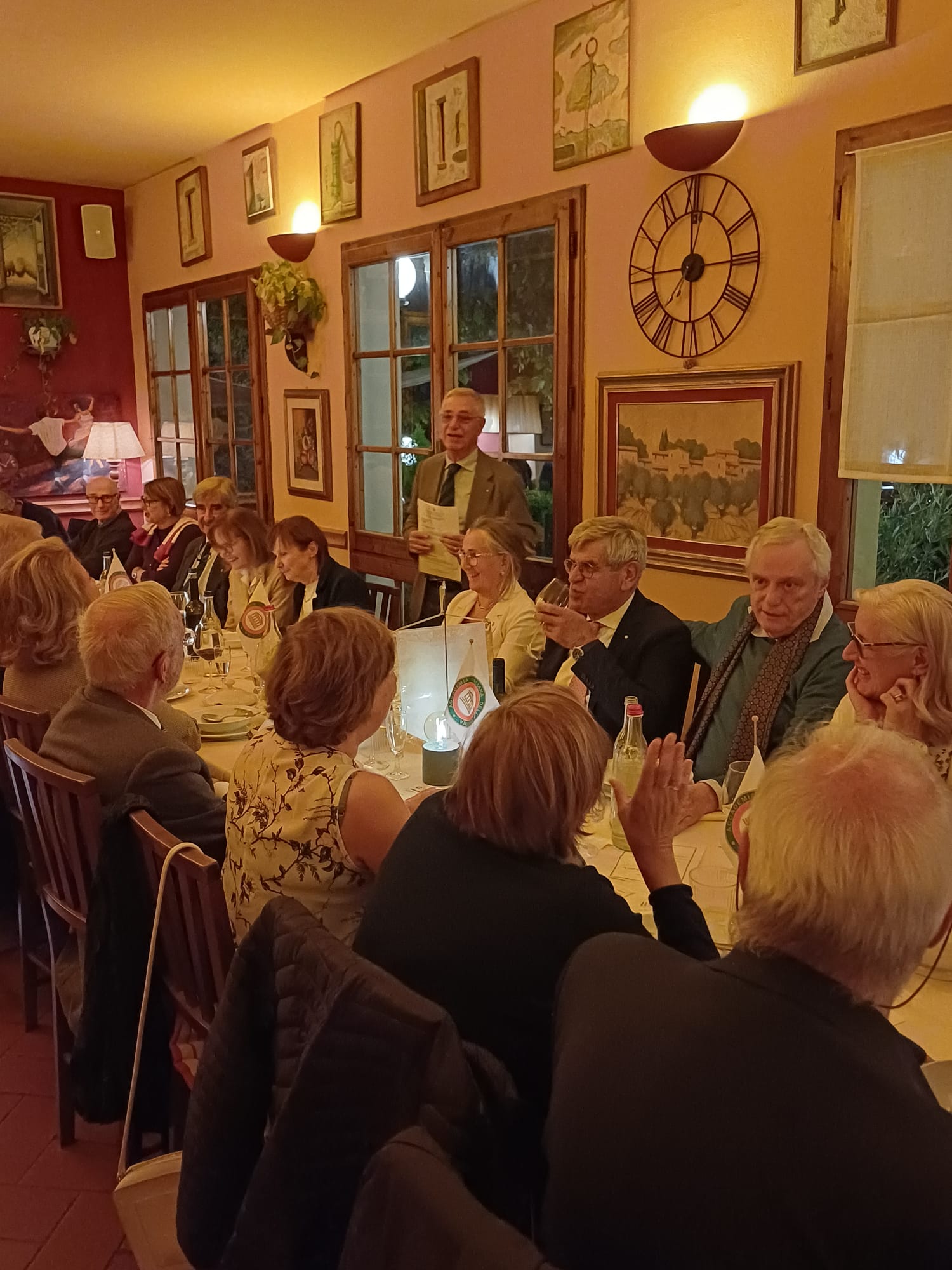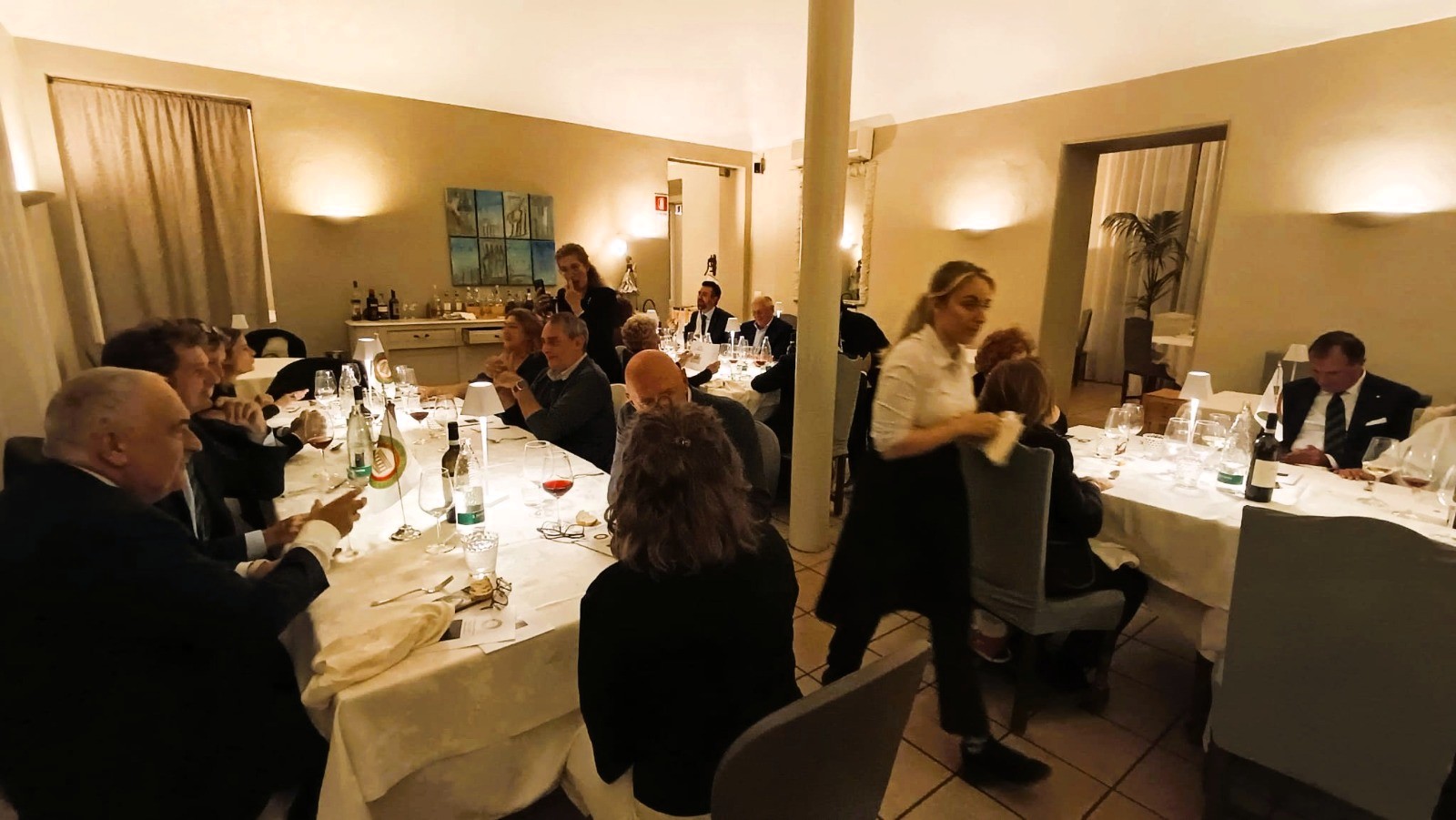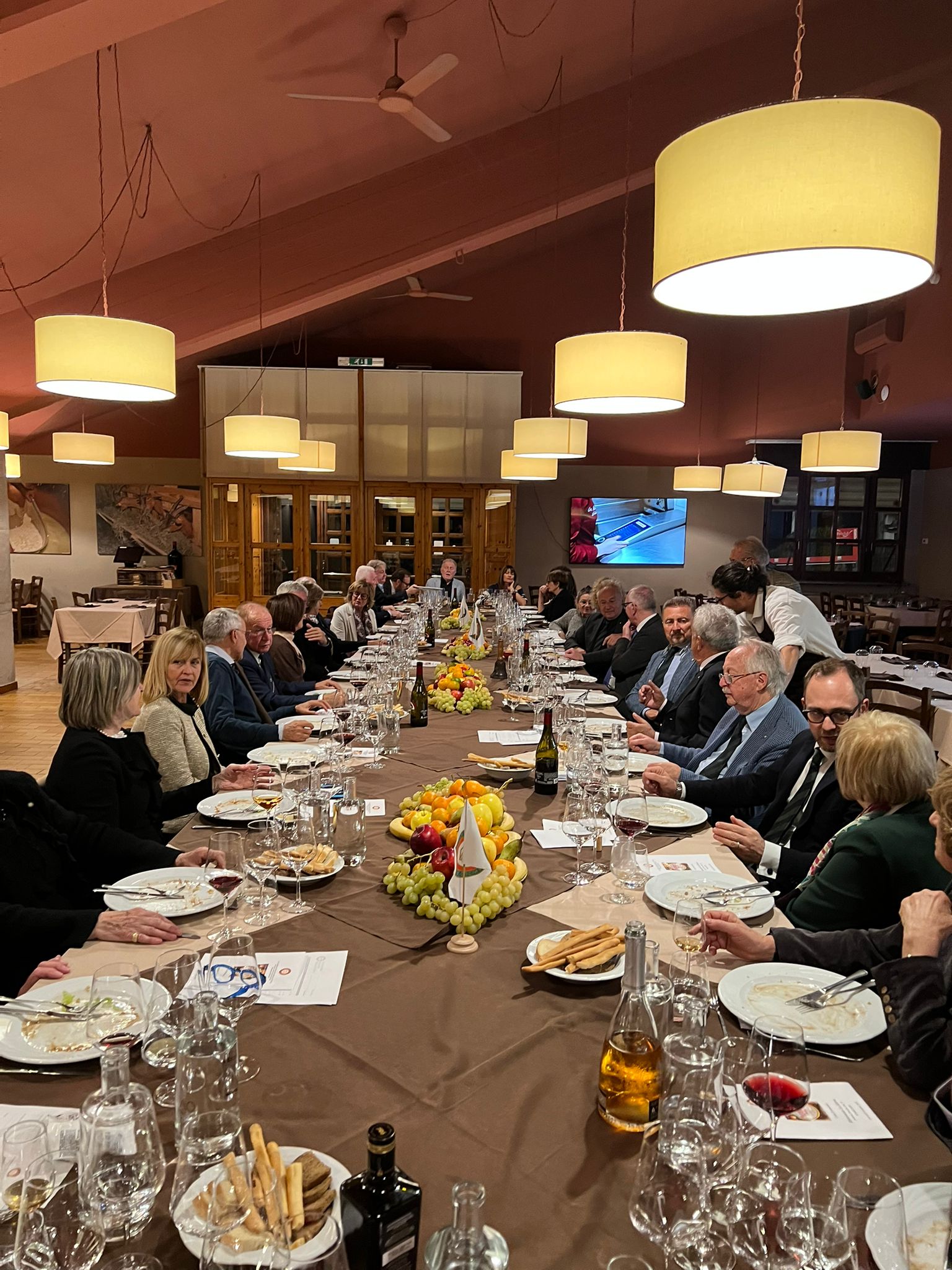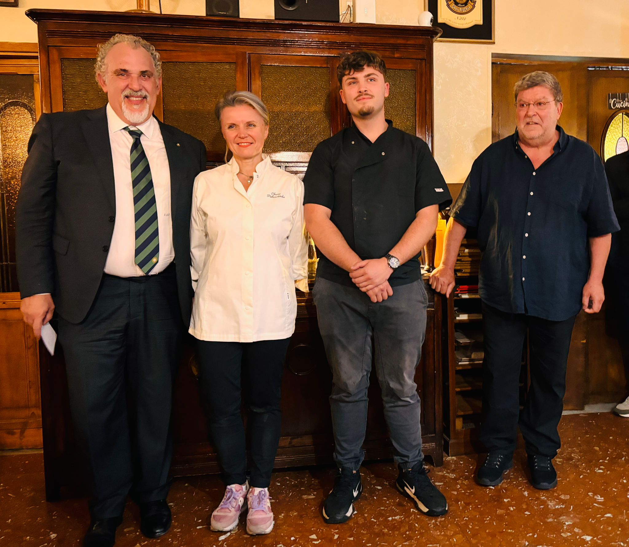 La Cena Ecumenica, magistralmente organizzata dal Simposiarca Ernesto d’Amico presso il ristorante Cantina Battisti di Vago di Lavagno, si è svolta in un clima di grande convivialità e partecipazione. La sua relazione, dedicata al tema dell’anno, è stata condotta con notevole capacità espressiva, coinvolgendo l’intera Delegazione con conoscenza, autorevolezza e simpatia. La serata è stata ulteriormente impreziosita dalla cerimonia di consegna delle insegne accademiche al nuovo Accademico Tony Pagone. Un caloroso e prolungato applauso lo ha accolto, testimoniandogli fin da subito l’affetto e la stima di tutti i presenti. Uno straordinario carrello fumante di bolliti e arrosti, accompagnato dalla amata salsa Pearà, ha coronato una serata davvero gioiosa e gustosissima.
