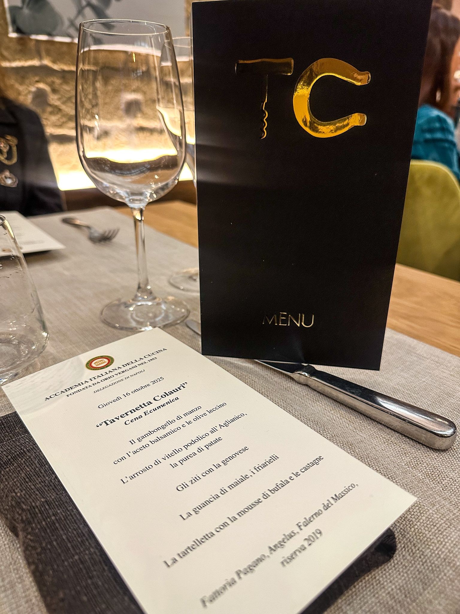 Tradizione nella tradizione per la Cena Ecumenica della Delegazione Napoli ospitata, per il secondo anno consecutivo, dalla “Tavernetta Colauri”. Incastonata sul versante più rustico della collina vomerese, la Tavernetta si è confermata il locale perfetto per l’interpretazione del tema ecumenico del 2025. Tra carni pregiate, fuoco vivo e atmosfere agricole, il tema è stato esaltato dal menu ispirato al bollito del gambongello di manzo col balsamico, all’arrosto del vitello podolico con la salsa all’Aglianico speziata e agli umidi della morbidissima guancia di maiale e del dessert di castagne con la mousse di bufala e la tartelletta di frolla fragrantissima. Prima della cena Massimo Franco, Direttore del Centro Studi Territoriale della Campania, ha ripercorso insieme agli Accademici le tappe editoriali della pubblicazione sul tema ecumenico raccontando aneddoti e curiosità sulle ricette campane presentate. Infine, degno di menzione, l’ingresso nella Delegazione di Angelo Cortile.