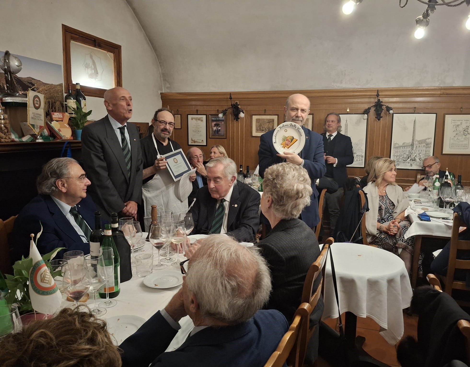 In occasione della cena ecumenica, il Delegato di Roma Eur-Ostiense, Claudio Nacca, ha consegnato il Diploma di Buona Cucina ai fratelli Ennio, Francesco e Marina Mariani, quinta generazione alla guida dello storico locale "Checchino dal 1887", mentre in sala si affaccia già la sesta con i figli di Marina e Francesco. Il riconoscimento premia l’eccellente cucina di Ennio e la custodia della tradizione romanesca, legata alle carni e al celebre quinto quarto: la leggenda vuole che proprio qui sia nata la coda alla vaccinara, creata agli inizi del Novecento dalla bisnonna Fermina. L’ambiente celebra la romanità con il soffitto a botte, gli arredi storici e le stampe originali di Pinelli, donate ai genitori dei fratelli Mariani da Giuseppe Ceccarelli, giornalista nonché primo Delegato dell’Accademia Italiana della Cucina di Roma. Checchino, quindi, è anche la casa della Delegazione romana sin dalla sua fondazione, oltre settant’anni fa. Per questo la Delegazione Roma Eur-Ostiense, competente per territorio, ha voluto condividere la cena ecumenica 2025 con la Delegazione di Roma. Durante la serata, il Delegato di Roma, Giuseppe Florio, ha consegnato i diplomi per i quarant’anni di appartenenza agli Accademici Paolo Basili e Francesco Ricciardi, accolti da calorosi applausi. La Direttrice del CST di Roma, Silvia De Vincentiis, ha infine illustrato il volume dedicato al tema ecumenico dell’anno: “Gli arrosti, gli umidi e i bolliti nella cucina della tradizione regionale”, con un approfondimento sulla Città metropolitana di Roma.