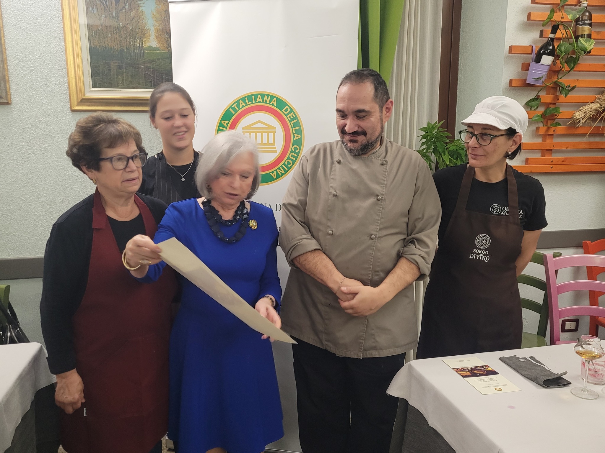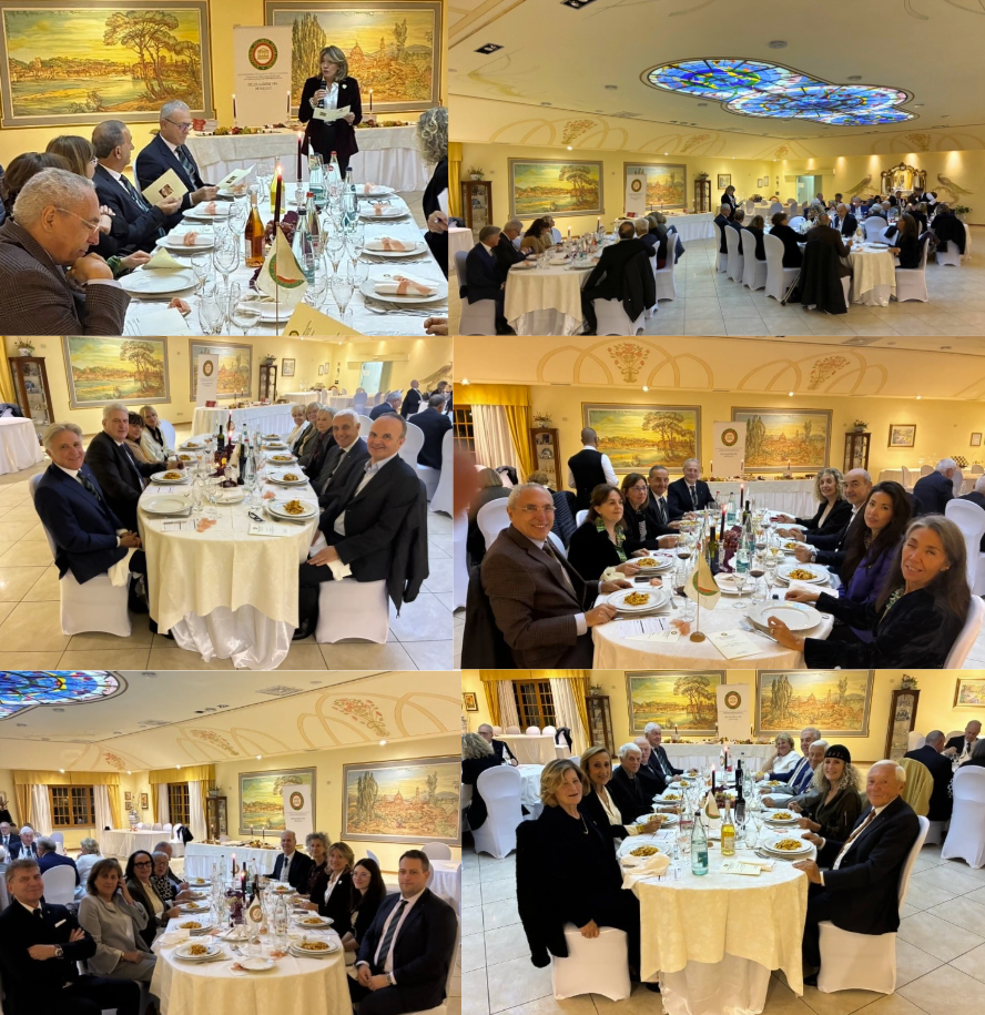 La tradizionale cena ecumenica della Delegazione reatina si è svolta alla trattoria “La Palazzina” di Rieti. Dopo i saluti del Delegato Francesco Maria Palomba e la presentazione del menu nella veste di Simposiarca, l’Accademica Valeria Lettera ha tenuto un intervento culturale. I vini sono stati illustrati da Enrico Maria Concutelli, responsabile di area della Cantina Casale del Giglio. Tra i partecipanti: il Prefetto di Rieti Pinuccia Niglio, il Colonnello Valerio Marra, il Colonnello Gianluca Ferraro e il Dr. Michele Tota, Vice Questore Vicario. Dopo l’aperitivo di polpettine fritte di “allesso”, i partecipanti hanno degustato le porchette PAT di Selci (Giorgio Giorgini), Poggio Bustone (Oreste Battisti) e Cantalice (Enzo Crosti), accompagnate da una giardiniera e da altre preparazioni della chef Oksana Pidhorodetska, eccellente interprete della cucina reatina. Il menù comprendeva polenta in umido con spuntature, salsicce, polpettine e pancetta; “allesso” di gallina, lingua, cotechino, muscolo e biancostato con varie salse; zampetti con salsa verde; patate lesse e fagiolini; e crostata di mele cotogne secondo la ricetta di Bartolomeo Scappi. In abbinamento, i vini di Casale del Giglio.