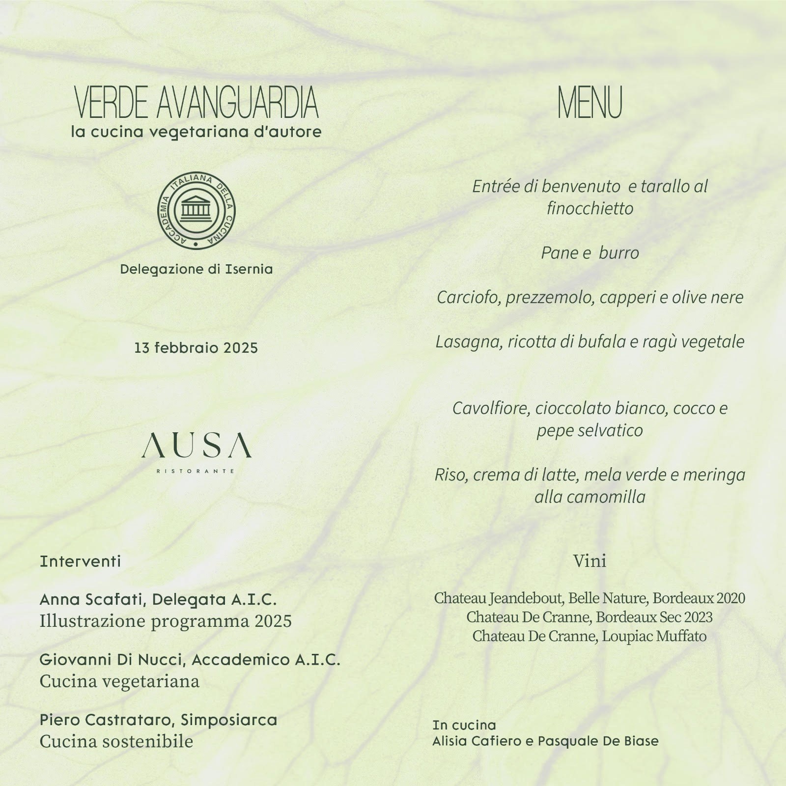 La riunione conviviale presso il ristorante vegetariano Ausa, dedicata alla "Verde Avanguardia", ha offerto agli Accademici una preziosa occasione per esplorare un orizzonte culinario in piena espansione. Ausa, situato nel centro storico di Isernia, nato da pochi mesi e già premiato con alcuni riconoscimenti, è guidato degli chef Anisia Cafiero e Pasquale Di Biase che non si limitano a sostituire la carne con alternative vegetali, ma trasformano ingredienti semplici e spesso sottovalutati in piatti raffinati e complessi. Durante la serata, molto apprezzati il "Carciofo, prezzemolo, capperi e olive nere" e la "Lasagna, ricotta di bufala e ragù vegetale", a dimostrazione che la rinuncia alla carne non significa rinunciare al piacere del gusto. L’evento è stato arricchita dagli interventi del Simposiarca Piero Castrataro, che ha esplorato la filosofia di Ausa e l’importanza della sostenibilità, e dell’Accademico Giovanni Di Nucci, che ha approfondito i benefici nutrizionali della cucina vegetariana, sfatando falsi miti e mostrando come un'alimentazione vegetale possa essere sana ma, soprattutto, ricca di sapori. Ad esaltare l’esperienza sensoriale, la selezione di vini illustrata dall'Accademico Antonio Valerio. Ciò che rende speciale Ausa è l'atmosfera unica, creata con materiali di recupero, in linea con la filosofia sostenibile del ristorante. Ausa non offre solo piatti vegetariani, ma promuove un'alimentazione consapevole, etica e sostenibile, ispirando un cambiamento positivo e dimostrando che la cucina è cultura, innovazione e avanguardia.