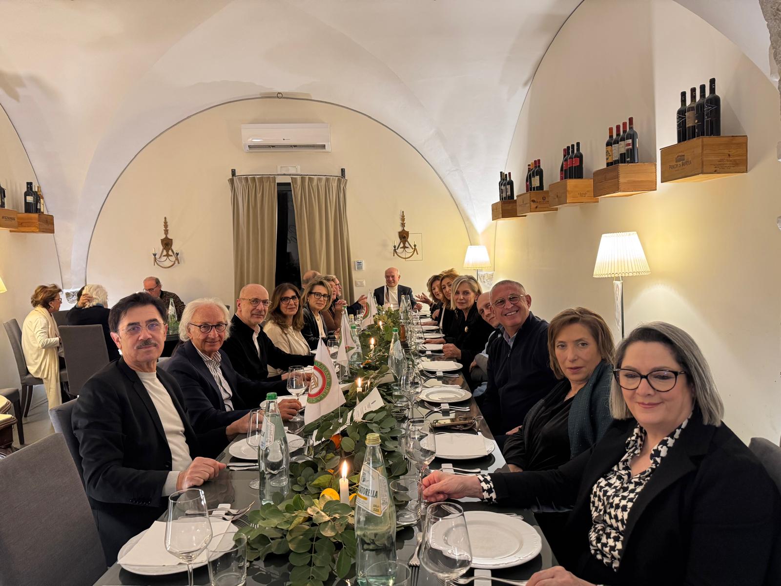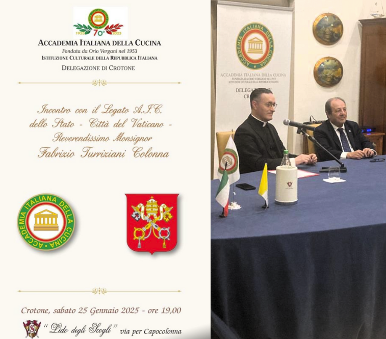 La Delegazione di Crotone ha avuto il piacere di ospitare S.E. Monsignor Fabrizio Turriziani Colonna, Legato dell’Accademia Italiana della Cucina per lo Stato Città del Vaticano. L’incontro, che si è svolto al Lido degli Scogli, si è articolato in due momenti distinti. Nella sala convegni è stato presentato il libro “Reverendissimo. Rudimenti di galateo ecclesiastico” (Tau Editrice, 2025), scritto da Mons. Turriziani Colonna, avvocato Rotale e cappellano conventuale del Sovrano Militare Ordine di Malta. Il Delegato Sergio D’Ippolito ha descritto l’opera come un manuale utile non solo per gli ecclesiastici, ma anche per chiunque si relazioni con il clero. Monsignor Turriziani Colonna ha sottolineato che non esistono ceti sociali esonerati dalle buone maniere, osservando come una persona educata renda tutto più piacevole. Nel Salone dei Ricevimenti si è svolta una cena a tema in onore dell’ospite, grande appassionato e estimatore de Il Gattopardo di Tomasi di Lampedusa, opera citata più volte nel suo manuale e la cui prefazione è stata scritta da Gioacchino Lanza Tomasi di Lampedusa. Una tavola, preparata secondo i canoni dell’antica aristocrazia siciliana, ha fatto da scenario alle pietanze descritte nel “Banchetto del Gattopardo”, curate nei minimi dettagli dai cultori storici presenti nella Delegazione. A fine serata sono stati donati a Monsignor Turriziani Colonna il guidoncino della Delegazione e la Coppa di Pitagora, consegnata dal Maestro Orafo Gerardo Sacco, Accademico onorario. Una serata di cultura e buon cibo.