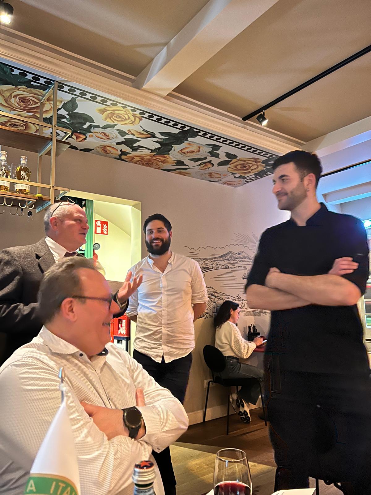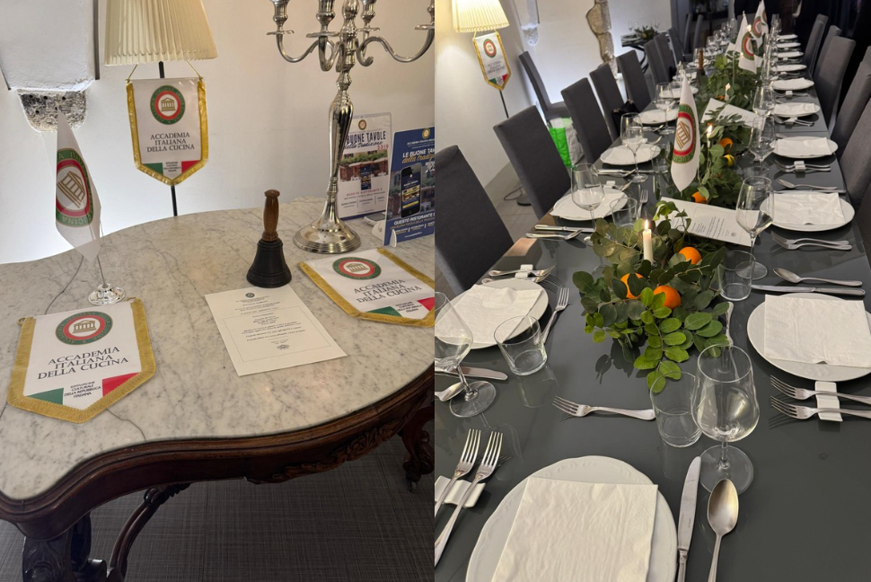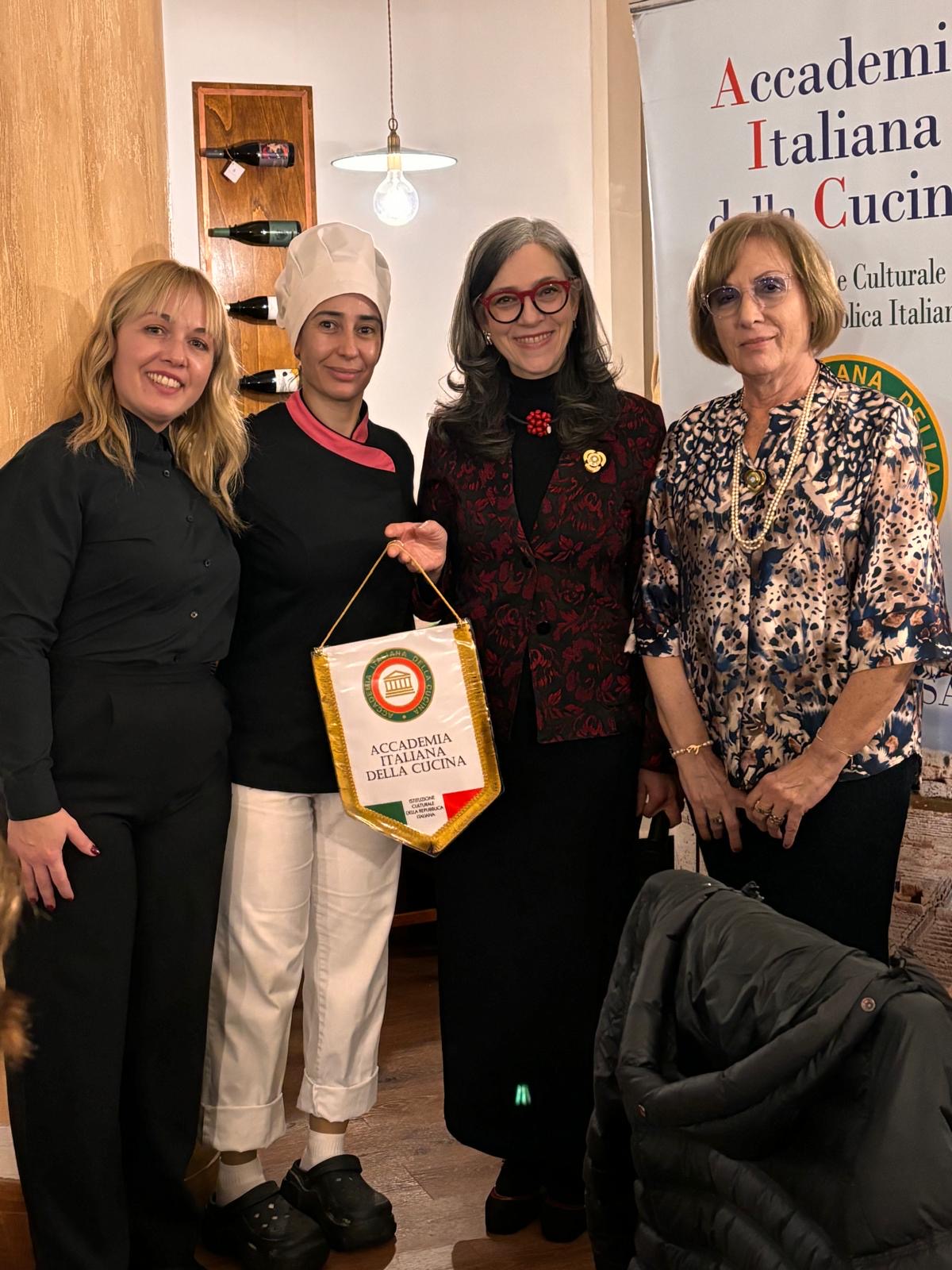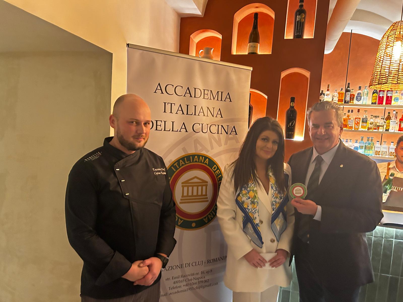 Il ristorante “Perfetto Cucina Italiana” si trova nella centralissima Piața Unirii di Cluj-Napoca, nel cuore della Transilvania. Il locale, sapientemente ristrutturato, trasmette in ogni dettaglio il calore e la vivacità dei colori del Sud Italia. I tavoli in ceramica, adornati con limoni freschi, portano freschezza e genuinità, mentre agrumi e foglie finte, intrecciate al soffitto, richiamano il tipico paesaggio della costiera del Sud Italia. Il Simposiarca della serata è stato il Delegato Massimo Novali. Sono stati serviti, come antipasto, “Cozze alla marinara”, con un sugo sapientemente dosato nei sapori e nelle quantità; come primo piatto, “Gnocchi alla Sorrentina”, morbidi e avvolti in un sugo ricco e saporito di pomodoro, mozzarella filante e basilico; come secondo piatto, “Polpo con verdure al forno”, tenero e saporito, completato da tenere verdure. Infine, un dolce classico: “Tiramisù”, equilibrato nei sapori e nella consistenza. Il caffè, intenso e ben preparato, e i tradizionali limoncello, grappa e amari offrono il tocco finale che solo la tradizione italiana sa regalare per chiudere la cena. La Delegazione ha consegnato a questo ristorante la vetrofania dell'Accademia, un premio davvero meritato! La meravigliosa padrona di casa e i suoi collaboratori, tutti stranieri, hanno saputo interpretare la cucina italiana attraverso una fusione culturale che arricchisce il territorio e la sua gastronomia.