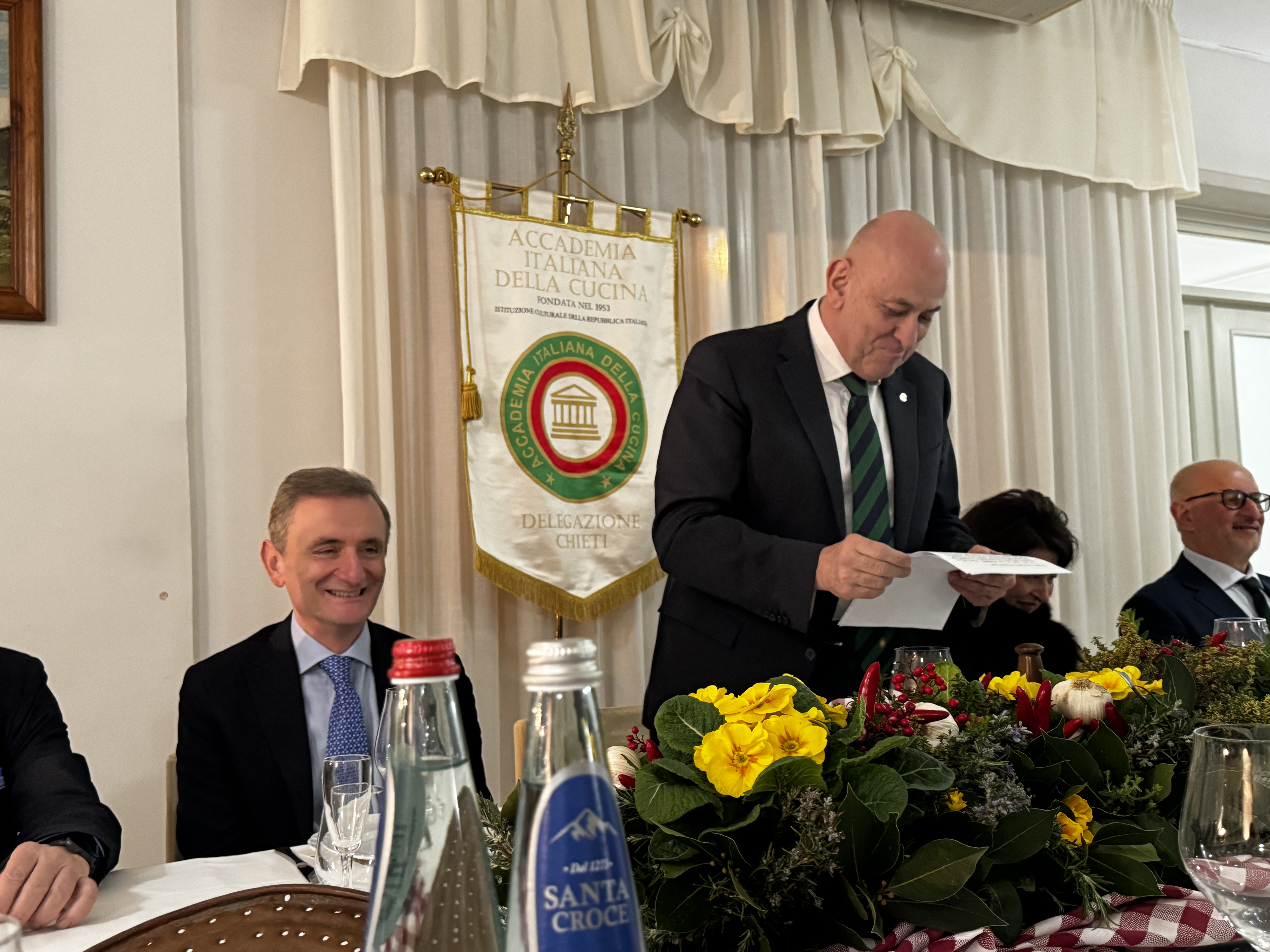 «Ovini: non solo arrosticini»: il tema della riunione conviviale era comune a tutte le Delegazioni dell’Abruzzo, ma la declinazione del sodalizio teatino ha evidenziato, grazie all’intervento del prof. Nicolantonio D’Orazio, ordinario di Scienze dell’Alimentazione all’università «G. d’Annunzio», quanto sia differente, nella regione che ha un'immagine legata da sempre alla pecora, la realtà dal mito. In primo luogo, c’è una drammatica diminuzione dei capi ovini presenti sul territorio regionale, passati in un secolo da 4 milioni a 175 mila, poi è innegabile la sottovalutazione delle caratteristiche nutrizionali della carne ovina, che è ricca di aminoacidi e di minerali essenziali, quali calcio, fosforo, magnesio e potassio, oltre a numerose vitamine del gruppo B. Il convivio, interpretato con maestria da Cesare Della Valle e Patrizia De Vitis del ristorante “Sant’Eufemia” di Fara Filiorum Petri, è stata illustrata dal Simposiarca, Antonello Antonelli, che ha evidenziato come le scelte operate per il menu rispecchiassero la linea interpretativa indicata dal Coordinamento Territoriale, partendo dagli arrosticini, passando per le carni di pecora, capra e agnello e chiudendo con un dolce, appositamente realizzato per la serata, che univa ricotta di pecora al tradizionale vino cotto delle colline teatine.