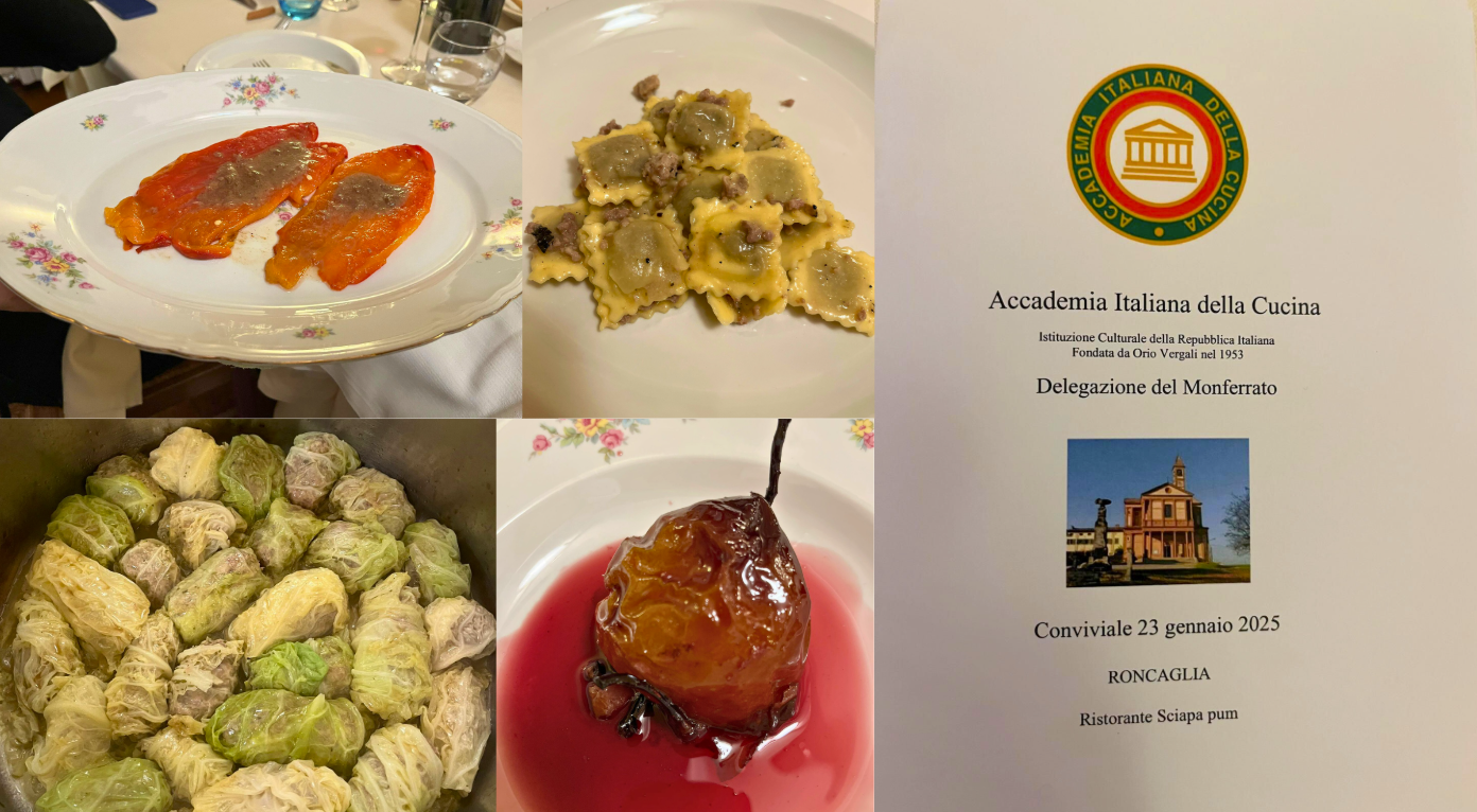 La Delegazione del Monferrato ha avviato l’annata delle riunioni conviviali con una cena in collina al ristorante Sciapa Pum nella frazione Roncaglia di Casale Monferrato. Le sorelle Bosso, Mariangela in sala e Barbara in cucina, hanno deliziato gli Accademici con piatti semplici, gustosi e curati: carne cruda, peroni in bagna cauda, agnolotti al sugo di arrosto e tartufo e per finire il capunet, piatto tipico monferrino, in linea con la stagione per la produzione del cavolo che impera negli orti e segno culturale della tradizione della cucina del “recupero” contadina delle colline. In chiusura ottime pere della qualità Madernassa cotte la barbera e bis di Bunet.