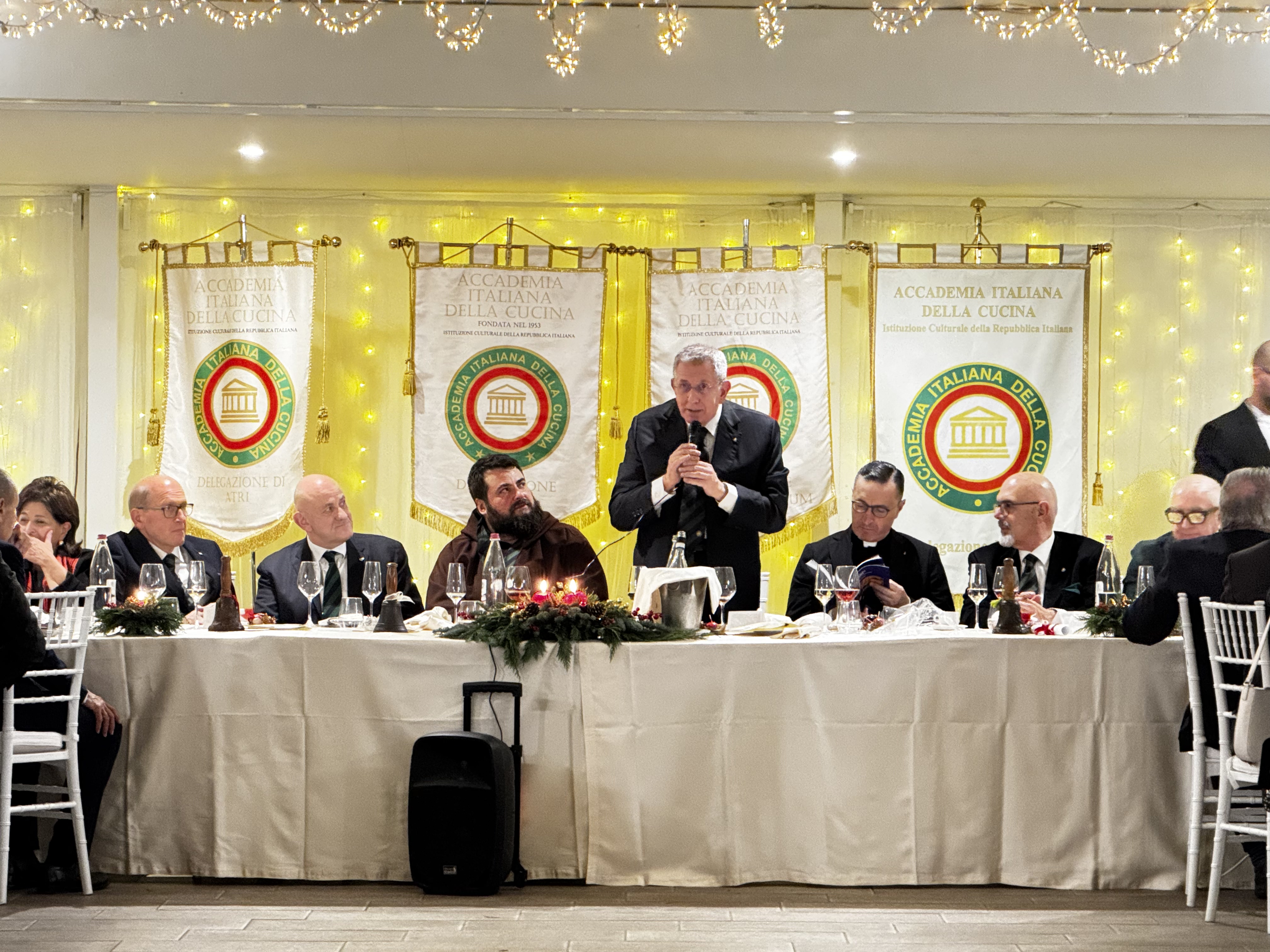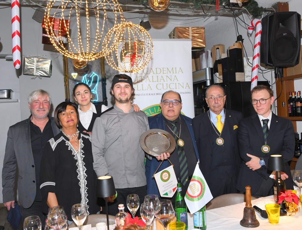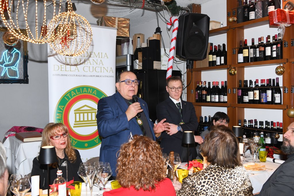 Per la tradizionale conviviale degli auguri natalizi la Simposiarca Carmen D’Intino ha scelto un ristorante sorto da qualche anno nella estrema periferia della città, ad opera di un giovane chef, Michele Impagnatiello che, dopo aver acquisito esperienze importanti in varie città d’Italia, ha deciso di mettersi in proprio nella sua città natale. Il locale, con cucina a vista, arredamento minimalista, circa trenta posti interni e ampio dehors, è sempre affollato ai limiti della sua capienza. Il menù scelto dalla Simposiarca e dallo chef è consistito in una rivisitazione in chiave gourmet di uno dei classici menù natalizi: carciofi a b.t. su crema di patate al tartufo; bottone ripieno di ragù con crema di canestrato pugliese, rollè di manzo brasato e marasciuoli, varietà di cioccolati al cucchiaio e dolci della tradizione. Il tutto innaffiato dai vini della Cantina Tenuta Planisium di Volturino (FG) i cui abbinamenti sono stati spiegati da un sommelier A.I.S. Dopo l'introduzione del Delegato Valerio A. Vinelli sulle attività svolte dalla Delegazione nel 2024 e sui programmi per il prossimo anno, nonché la presentazione del menù da parte della Simposiarca e dello chef, è stato insignito il nuovo Accademico Nicola Scudieri. Nutrita partecipazione degli Accademici. Non è stato possibile accettare ospiti, a causa dei limitati spazi del locale. Donati a Michele Impagnatiello il guidoncino della Delegazione e la vetrofania 2024 dell’Accademia Italiana della Cucina.