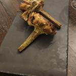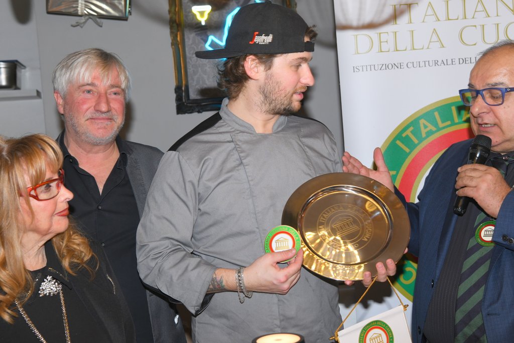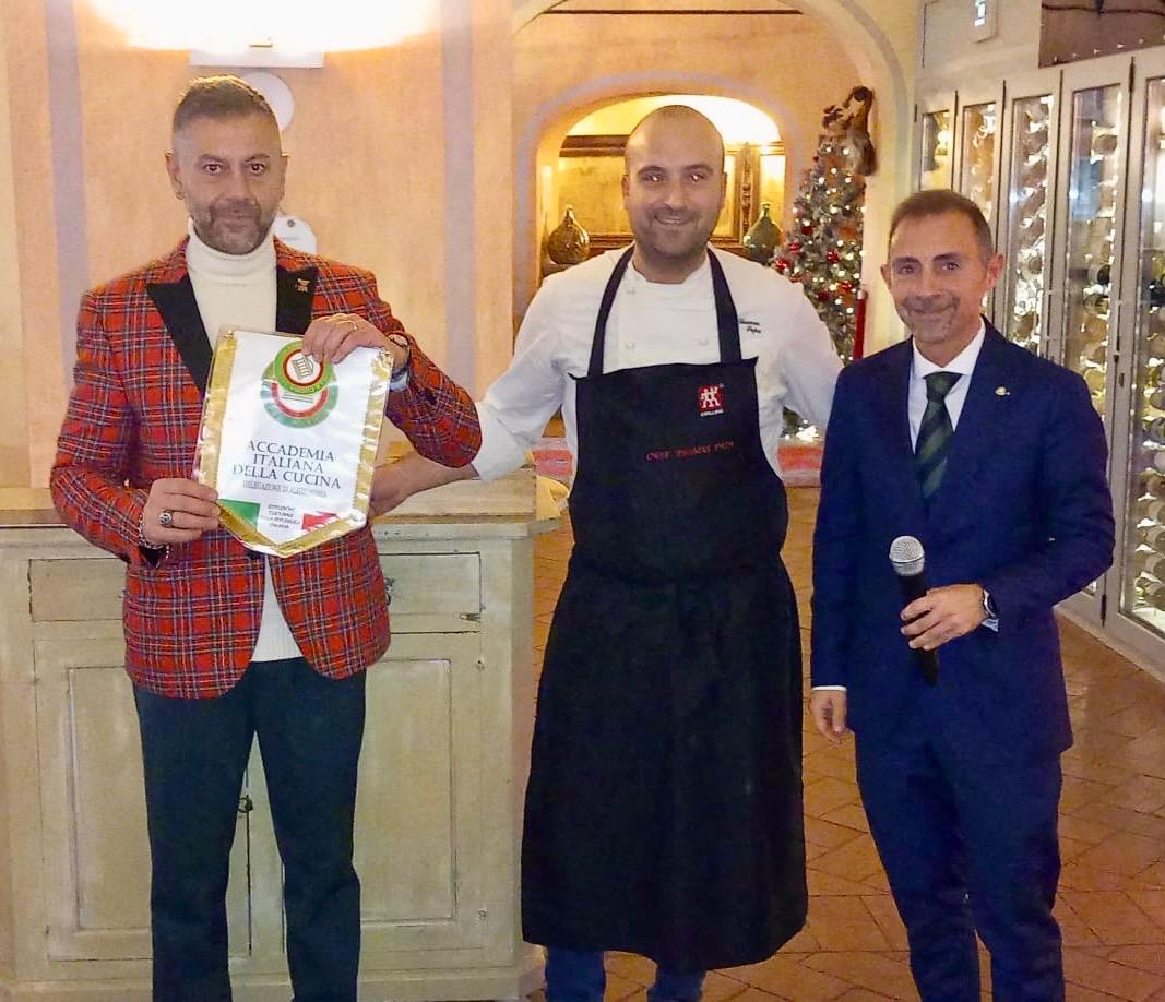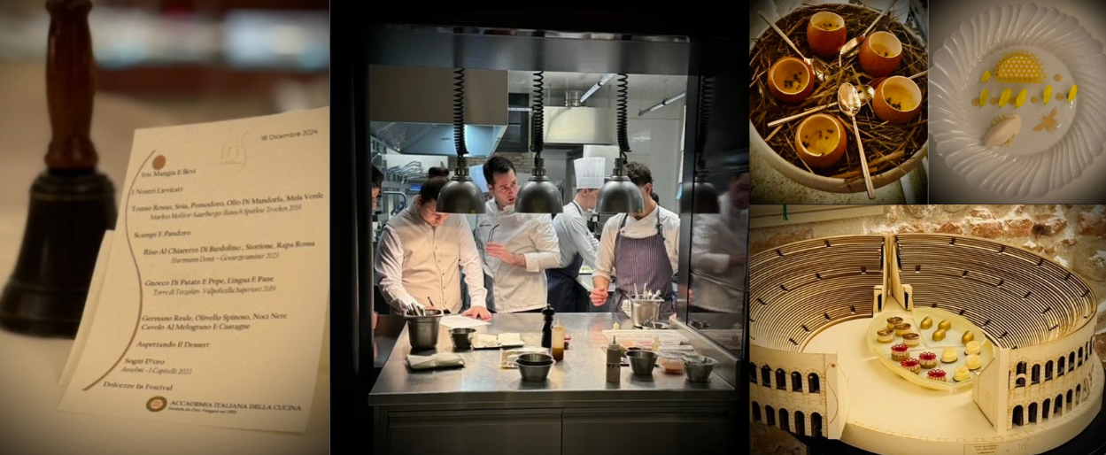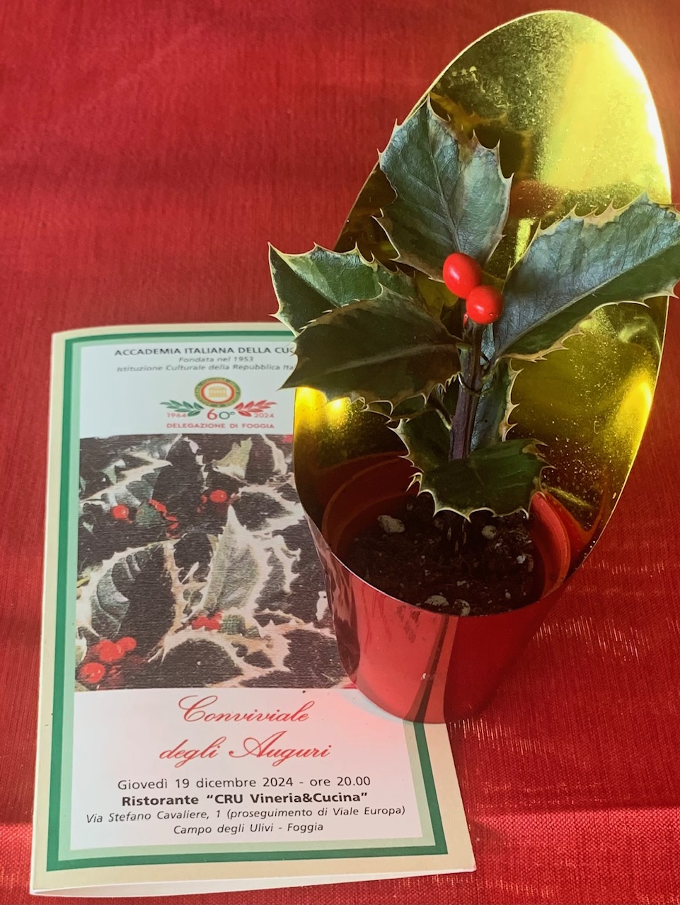 Per la tradizionale conviviale degli auguri natalizi la Simposiarca Carmen D’Intino ha scelto un ristorante sorto da qualche anno nella estrema periferia della città, ad opera di un giovane chef, Michele Impagnatiello che, dopo aver acquisito esperienze importanti in varie città d’Italia, ha deciso di mettersi in proprio nella sua città natale. Il locale, con cucina a vista, arredamento minimalista, circa trenta posti interni e ampio dehors, è sempre affollato ai limiti della sua capienza. Il menù scelto dalla Simposiarca e dallo chef è consistito in una rivisitazione in chiave gourmet di uno dei classici menù natalizi: carciofi a b.t. su crema di patate al tartufo; bottone ripieno di ragù con crema di canestrato pugliese, rollè di manzo brasato e marasciuoli, varietà di cioccolati al cucchiaio e dolci della tradizione. Il tutto innaffiato dai vini della Cantina Tenuta Planisium di Volturino (FG) i cui abbinamenti sono stati spiegati da un sommelier A.I.S. Dopo l'introduzione del Delegato Valerio A. Vinelli sulle attività svolte dalla Delegazione nel 2024 e sui programmi per il prossimo anno, nonché la presentazione del menù da parte della Simposiarca e dello chef, è stato insignito il nuovo Accademico Nicola Scudieri. Nutrita partecipazione degli Accademici. Non è stato possibile accettare ospiti, a causa dei limitati spazi del locale. Donati a Michele Impagnatiello il guidoncino della Delegazione e la vetrofania 2024 dell’Accademia Italiana della Cucina.