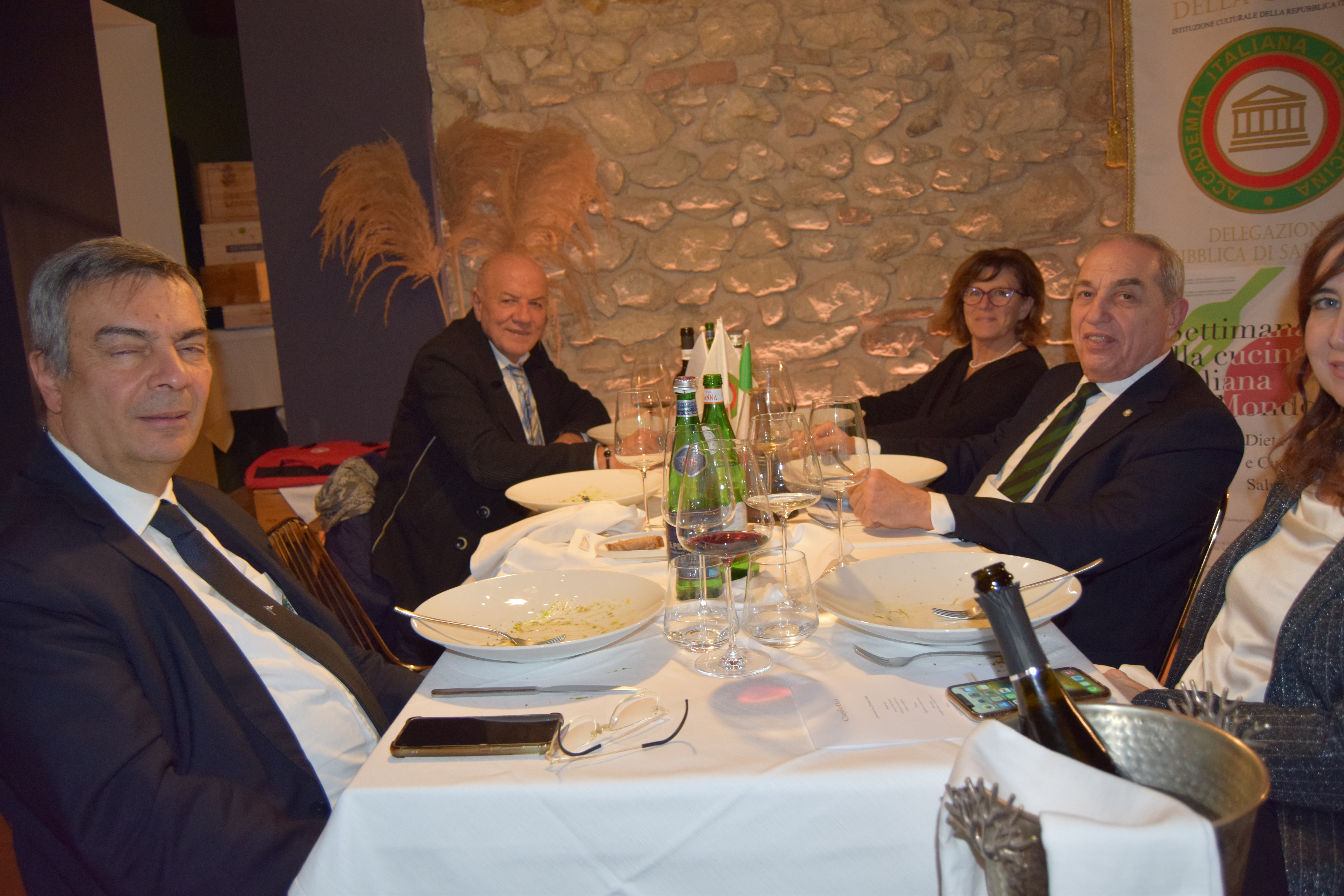 Una serata magnifica, vissuta in un momento speciale ricco di significato, tradizione e gioia, che ha permesso di apprezzare le cose semplici e rafforzare i legami sociali. Una festa che ha unito la Delegazione per rinnovare e rivivere insieme l’atmosfera del Natale presso “Il Castello Osteria Gourmet”, un locale davvero unico, riservato esclusivamente agli Accademici per la conviviale degli auguri. Nei locali di uno storico Castello Medievale, gli ospiti sono stati accolti dalla calorosa, ma discreta e signorile, ospitalità del padrone di casa, un professionista dal comportamento cordiale e spontaneo, fiero di mettere a frutto il proprio ingegno in un menù realizzato con i prodotti di stagione del Montefeltro, ispirato ai sapori e profumi di un territorio di cui la Repubblica di San Marino è geograficamente parte. La serata si è svolta in un’atmosfera gioiosa e cordiale, con la condivisione tra gli Accademici e gli illustri ospiti della curata e gustosa cucina proposta e della passione di ciascuno per la buona tavola. Il “Menù del sottobosco”, concordato tra il Simposiarca Cesare Tabarrini e lo chef del Castello, Massimiliano Poletti, ha offerto piatti come frittatina al tartufo nero, crostone ai porcini, tagliolini al tartufo, coniglio ripieno con funghi porcini, e una mousse di cachi con fondente e torrone. Il tutto accompagnato dallo Spumante Titano Brut e dal Brugneto della Cantina di San Marino.