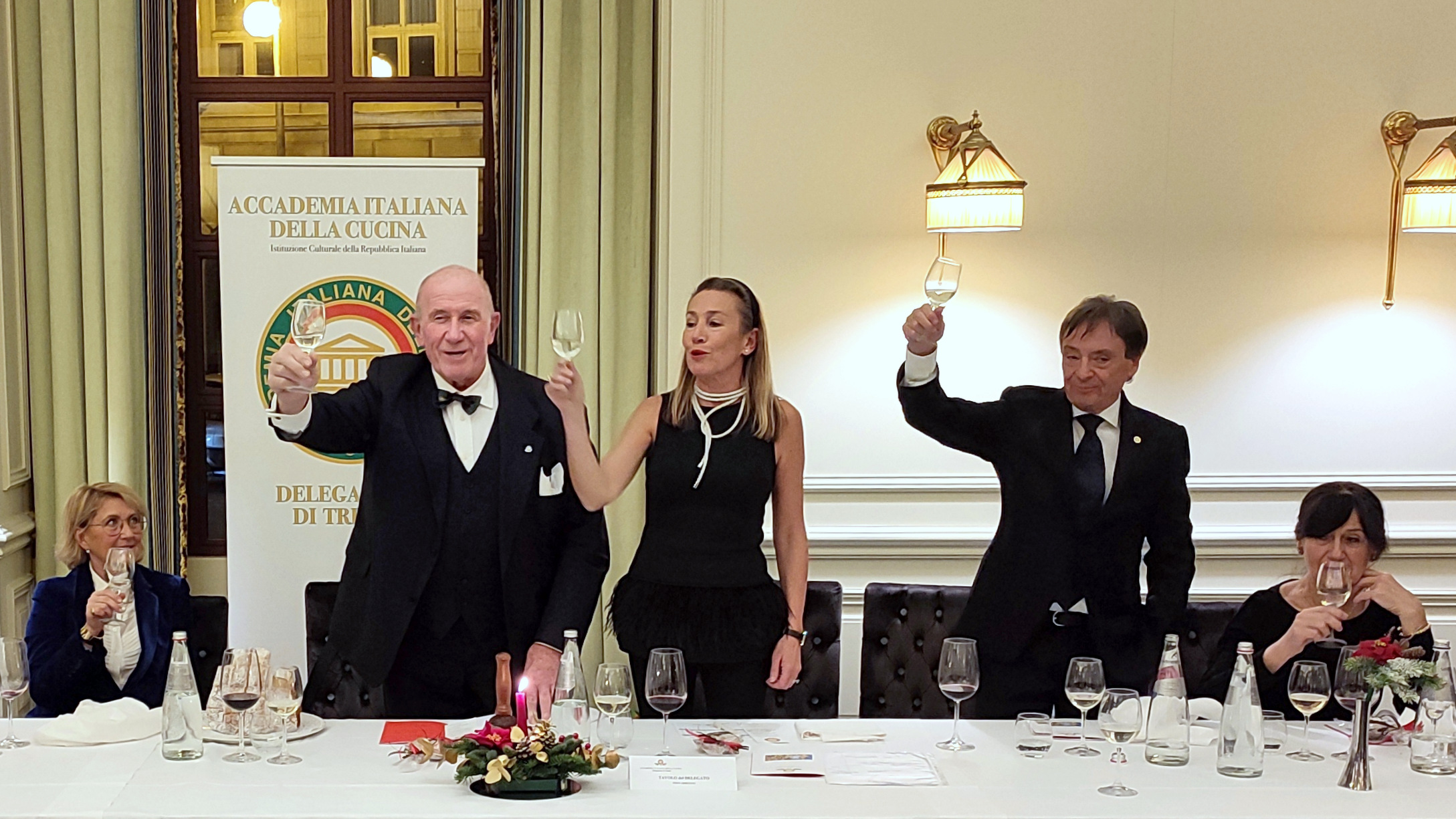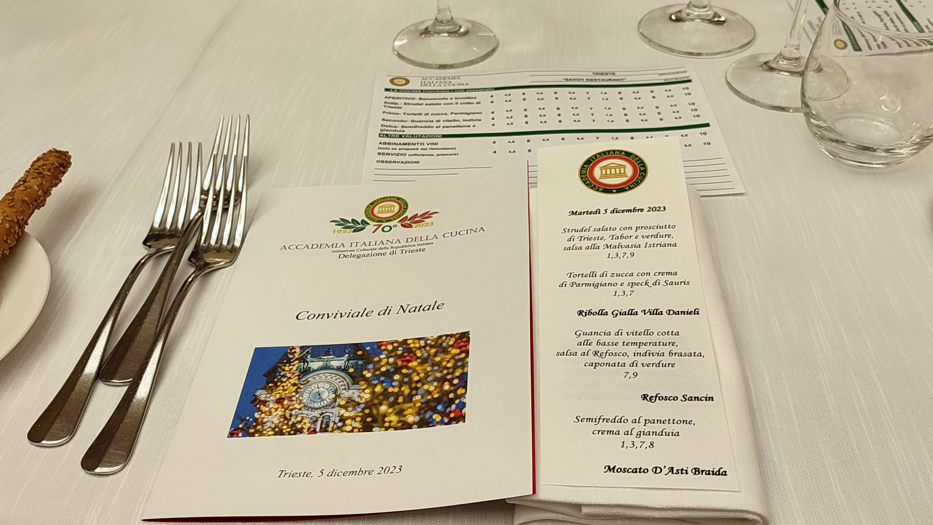 La Delegazione di Trieste ha organizzato la serata degli Auguri di Natale nei saloni del ristorante dell’hotel Savoia Excelsior affacciato sul lungomare. I Simposiarchi, Paolo Penso e Mara Rondi, hanno scelto un menu in cui, dopo l’aperitivo di benvenuto, sono stati serviti i tortelli di zucca con crema di parmigiano e speck di Sauris, guancia di vitello cotta a bassa temperatura, salsa al Refosco ed indivia brasata nonché un semifreddo al panettone con crema di gianduia. Tra i vini ribolla gialla e Refosco di produttori locali. Serata all’insegna del buon gusto, della convivialità e amicizia, con l’auspicio di futuri brindisi assieme, nella valorizzazione del nostro patrimonio culinario.