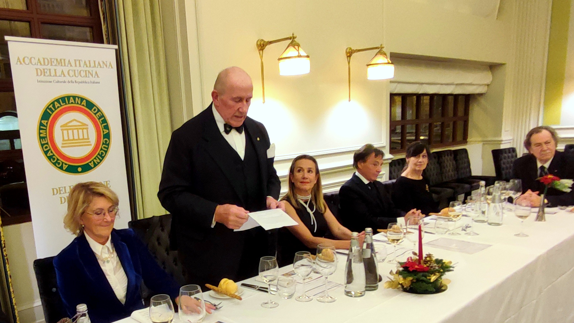 La cena per gli auguri di Natale della Delegazione ha visto la presenza, presso il ristorante della Società Nautique di Monaco, della crew del Ristorante La Piola di Alba. Capitanati dal manager del Ristorante, Andrea Canaparo, lo chef Dennis Panzeri ed il sommeiller Filippo Rodda hanno preparato un menù speciale della tradizione piemontese a base di tartufi di Alba che hanno inondato la sala di un immenso profumo. Dopo un aperitivo di stuzzichini sono stati serviti un antipasto di cardi gobbi di Nizza Monferrato stufati e cotti nel latte con crema di patate e tartufo bianco; un risotto mantecato al parmigiano con tartufo e una morbidissima fassona brasata al nebbiolo su letto di purè di patate. Come dolce è stato proposto un tortino di nocciole con zabaglione al moscato d'Asti. Una fetta di buon panettone artigianale ha concluso la serata con i saluti di tutta la brigata del ristorante la Piola di Alba presentati dal Delegato Luciano Garzelli. Poi, auguri di buone feste da parte di S.E. Giulio Alaimo Ambasciatore d'Italia nel Principato di Monaco.