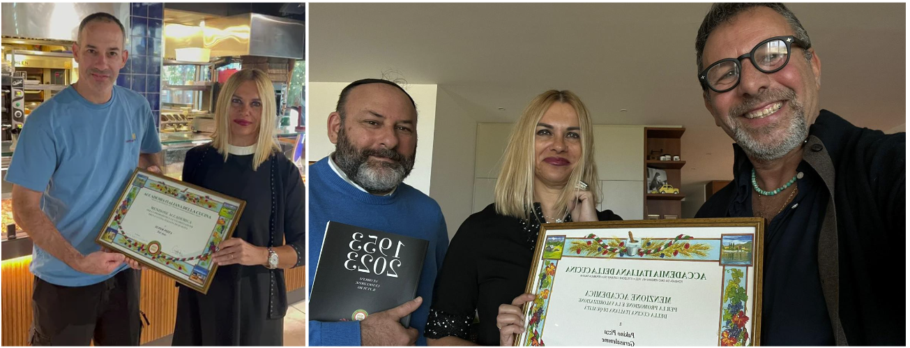 È avvenuta a Tel Aviv, in forma privata, la consegna dei Premi assegnati dall'Accademia Italiana della Cucina su proposta della Delegazione di Tel Aviv. Il 15 novembre la Delegata Cinzia Klein ha consegnato il "Diploma di Buona Cucina" a Tamar Cohen Zadak del ristorante Cucina Hess4 di Tel Aviv (foto 1); il premio Menzione Accademica è stato invece consegnato il giorno successivo a Super Pizza Tel Aviv (foto 2 e 4) e a Pakino Pizza (foto 3 e 4) in data 20 novembre.