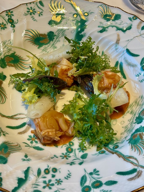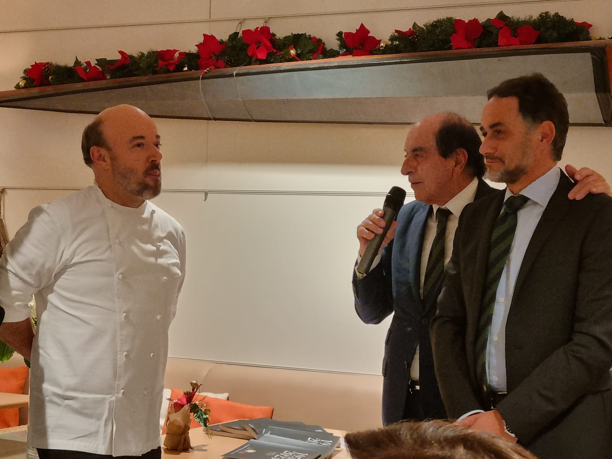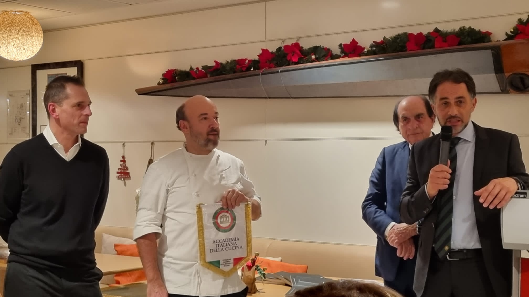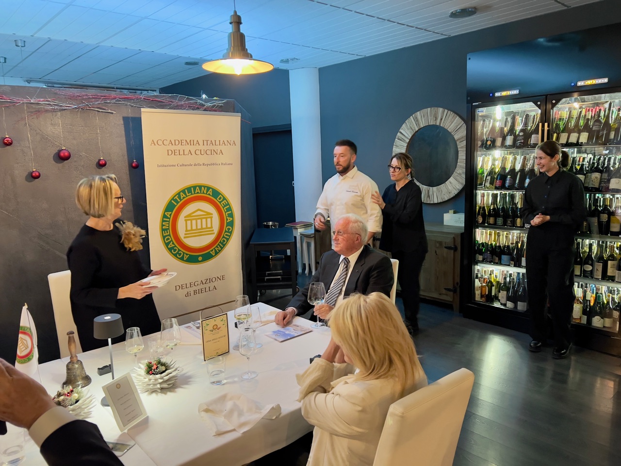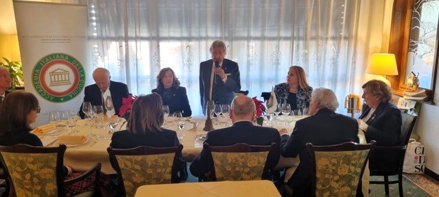 Il ristorante Regallo ha accolto la Delegazione per la cena degli auguri. Noto ristorante conosciuto per la cucina a base di pesce e la professionalità del servizio. È stata una serata dall'atmosfera calda e cordiale. Lo chef Claudio Ravinetto ha preparato dei piatti che hanno incuriosito gli Accademici mentre Chiara Prior ha diretto il servizio in sala servendo e presentando i vini in abbinamento. La cena è iniziata con degli stuzzicanti amuse-bouche ed è proseguita con un eccellente e sorprendente Ramen di pesce, dei plin ripieni di calamaro in umido e un pesce poco conosciuto, il carbonaro d'Alaska o pesce burro dalla polpa bianchissima. Il convivio si è concluso con il brindisi finale di buone feste e con i ringraziamenti di rito ai gestori del locale.