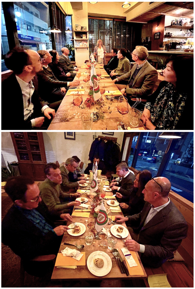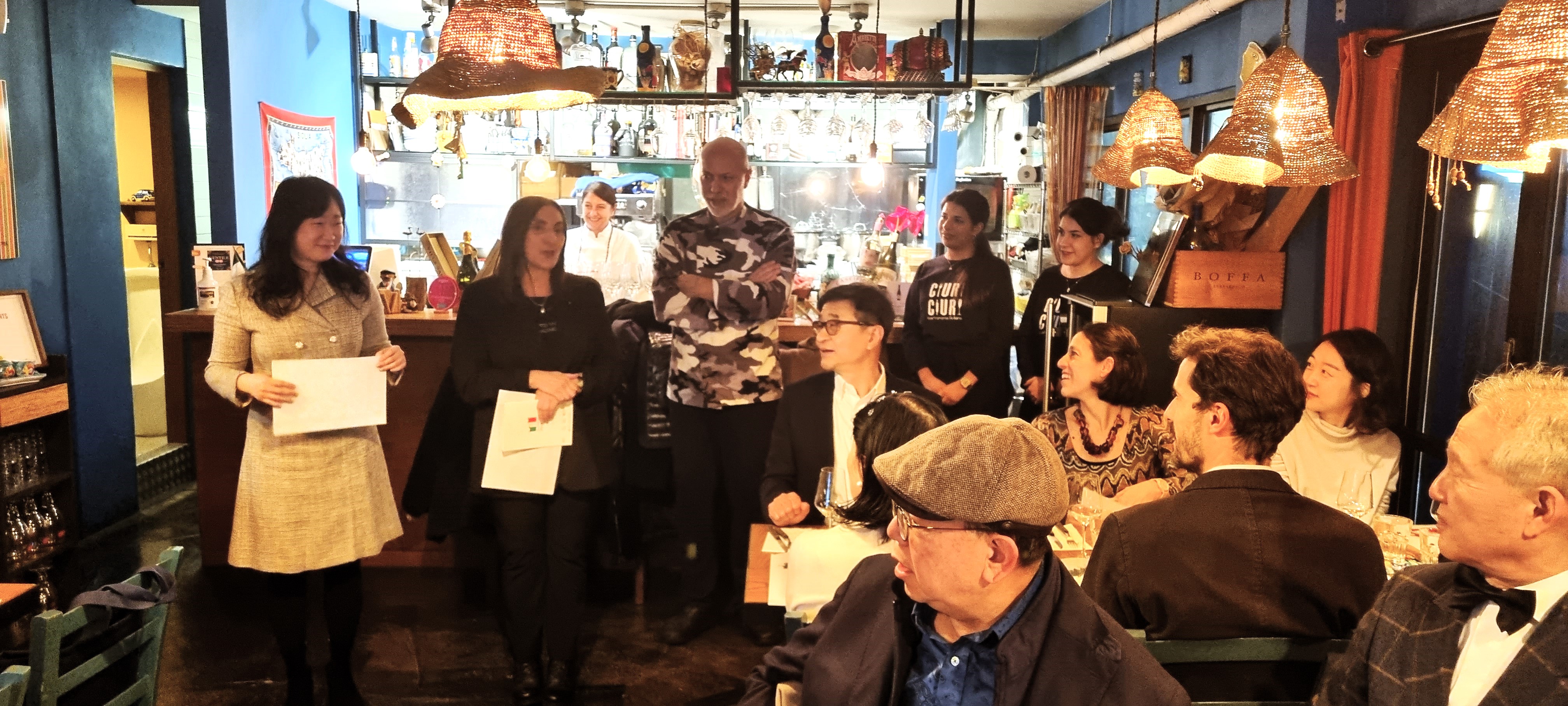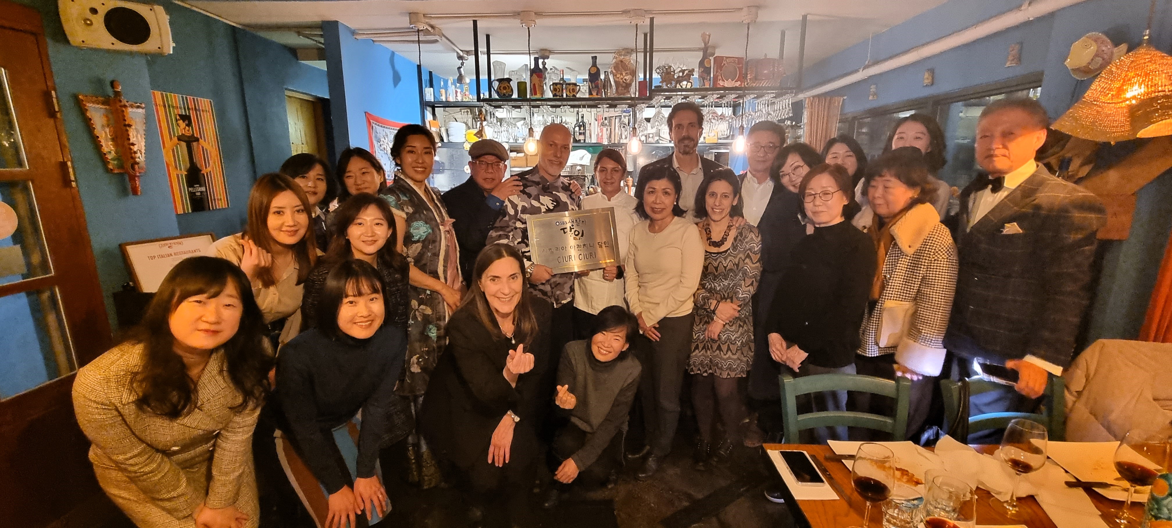 Appuntamento della Legazione al ristorante italiano “Ciuri Ciuri”, sito nel dinamico e popolare quartiere di Hongdae, per la riunione conviviale a chiusura dell’anno 2023, dedicata alla ricchezza della cucina regionale siciliana. L’evento è stato sapientemente introdotto dalla Legata Michela Linda Magrì assieme agli chef Enrico Olivieri e Filippa Fiore, esperti maestri della tradizione culinaria siciliana, che con passione e maestria hanno presentato e spiegato dettagliatamente ogni piatto preparato per la serata. Dopo l’antipasto di focaccia e olive cunzate, arancinette al ragù e caponata palermitana, sono state servite come primi piatti le caserecce alla norma. È seguito il baccalà a sfincione su letto di patate e, a conclusione, cannoli siciliani e passito. Delizioso locale, arredato con eleganza e tatto, “Ciuri Ciuri” ha davvero superato ogni aspettativa nei presenti. I piatti, preparati con ingredienti incredibilmente genuini e accuratamente selezionati, unitamente al servizio impeccabile e all’ospitalità unica e calorosa degli chef e Enrico Olivieri e Fiore, hanno riscontrato l’unanime e sentito gradimento dei commensali.