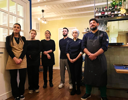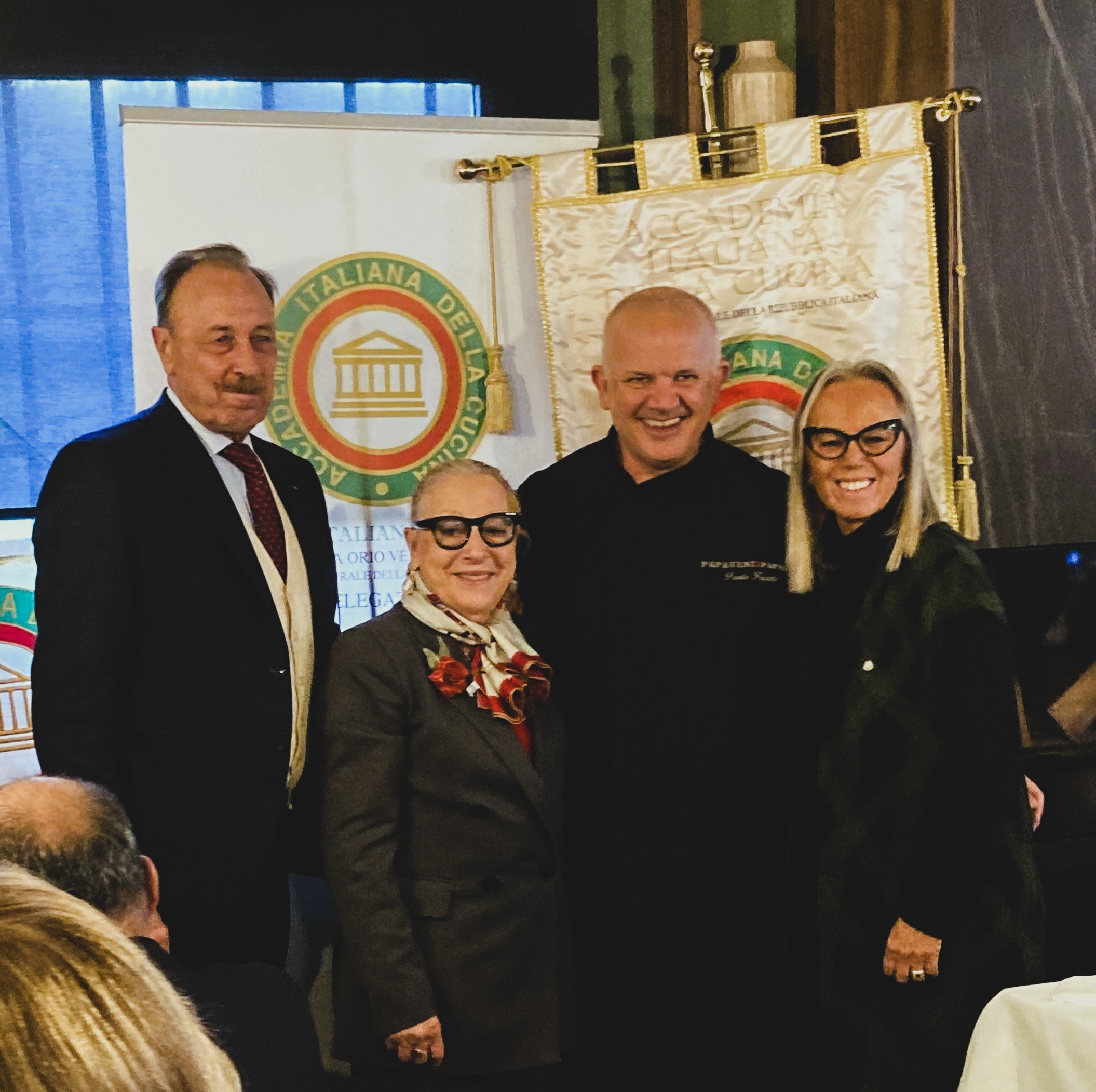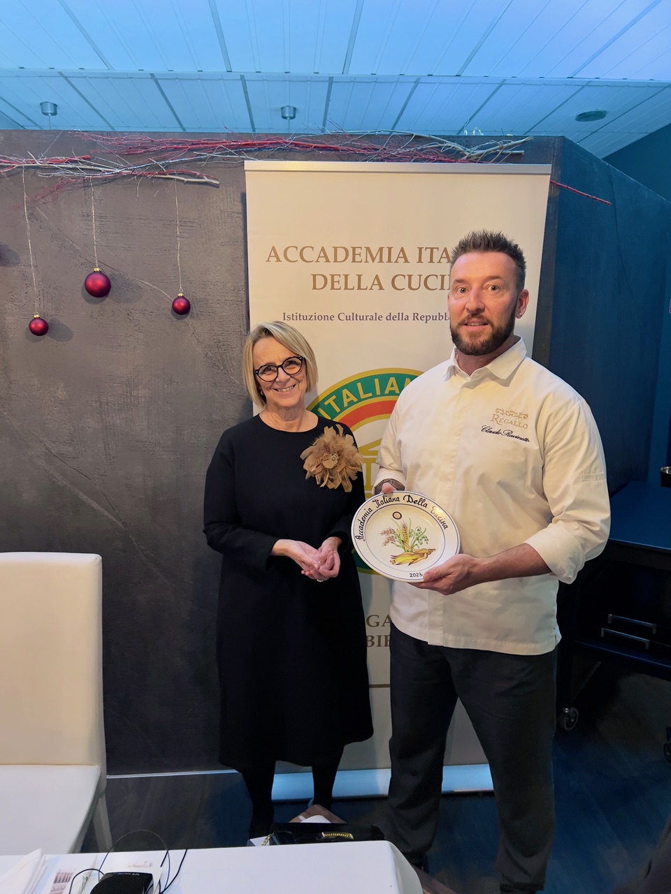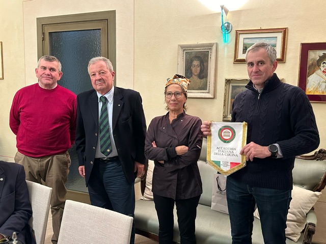 La cena degli auguri organizzata dal Delegato Aris Spada ha portato i commensali a visitare per la prima volta il ristorante “La Viestana”. Il team della sala, pilotato da Jessica Cariglia, si è dimostrato all’altezza delle aspettative servendo anche una scelta ben accurata di vini. Dopo una squisita e moderna bruschetta scomposta servita in un bicchiere si è passati ad un delizioso carpaccio di gamberi rossi di Mazara. A seguire le perfette orecchiette fatte a mano dalla moglie dello chef Janet Pereira e dei saporitissimi strascinati. A scelta tra un secondo di carne (bocconcini preparati con dell’eccellente carne locale) e un involtino di pesce. A chiudere una combinazione di tiramisù e cannolo. Il taglio del panettone ha rievocato nei presenti una delle più belle tradizioni italiane. In questa lieta occasione la Delegazione ha consegnato alla ditta Granucci il premio “Menzione Accademica”.