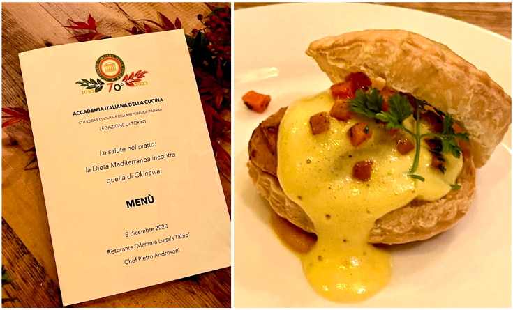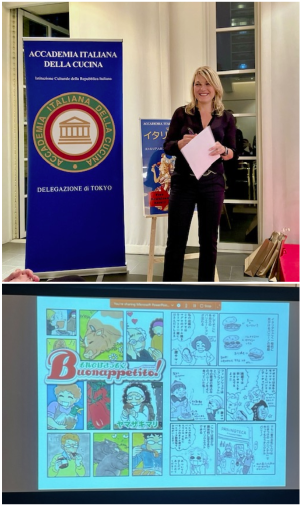 Si è svolto il 24 novembre, presso la sala Bambù dell’Ambasciata d'Italia a Tokyo, l’aperitivo letterario di presentazione del libro “La Storia della Cucina Italiana a Fumetti”. Dopo i saluti istituzionali dell’addetto alle politiche agricole, dott.ssa Anna Iele, la Legata di Tokyo, Emanuela Orighi, ha illustrato il significato del libro nell’ambito del manifesto per i settanta anni dell’Accademia Italiana della Cucina. Il folto gruppo di giornalisti e appassionati presenti in sala ha molto apprezzato gli interventi dei relatori che, con background differenti, hanno esplorato il tema del cibo nel fumetto e nel manga. Dall’Italia è intervenuto Marco Madoglio, soggettista, sceneggiatore e autore dei testi del libro. In sala erano presenti Marta Marmiroli, Accademica di Tokyo, Simona Stanzani, traduttrice professionista di manga e Yui Okada, Mangaka professionista. Alla fine della presentazione un sentito scroscio di applausi per i relatori e per il libro, da ora disponibile, nella versione giapponese online, per essere scaricato e letto sul proprio device. Sempre nell’ambito della VIII SCIM, il 5 dicembre si è tenuto l’ultimo evento per la Legazione di Tokyo: un convivio sul tema "La salute nel piatto: la dieta Mediterranea incontra quella di Okinawa" ottimamente interpretato dallo chef Pietro Androsoni del ristorante Mamma Luisa’s Table che ha saputo fondere benessere e gusto. Ne è risultato un menù molto accattivante in cui gli ingredienti tipici delle isole più a sud del Giappone si sono uniti perfettamente con le preparazioni di cucina italiana. L'atmosfera festiva ha fatto da cornice perfetta anche per gli auguri di Natale.