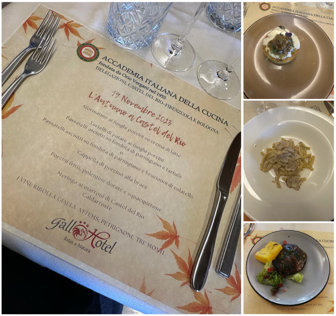 Un’inedita giornata di sole novembrina ha accolto gli Accademici delle Delegazioni di Castel del Rio-Firenzuola e di Bologna uniti per celebrare, presso il ristorante Gallo, due eccellenze dell’Appennino Tosco-Romagnolo: il fungo porcino e il marrone di Castel del Rio. La presenza del Coordinatore Territoriale Romagna Fabio Giavolucci ha reso ancor più piacevole la celebrazione - sapientemente introdotta dal Simposiarca Paolo Beccaceci - degli ottimi funghi porcini che, in settembre, vengono esaltati nella famosa sagra cittadina ad essi dedicata e giunta ormai alla trentasettesima edizione, e dei marroni IGP, anch’essi valorizzati attraverso l’omonima sagra d’ottobre che quest’anno è arrivata alla sua sessantasettesima edizione. Una menzione d’onore merita lo sformatino ai porcini su crema di latte e la meringa ai marroni finale. Il convinto ed unanime applauso di tutti gli Accademici ha salutato la brigata di cucina del ristorante Gallo che dal 1947 si distingue fra i migliori ristoranti della vallata del fiume Santerno per il sapiente modo di coniugare tradizione ed innovazione.
